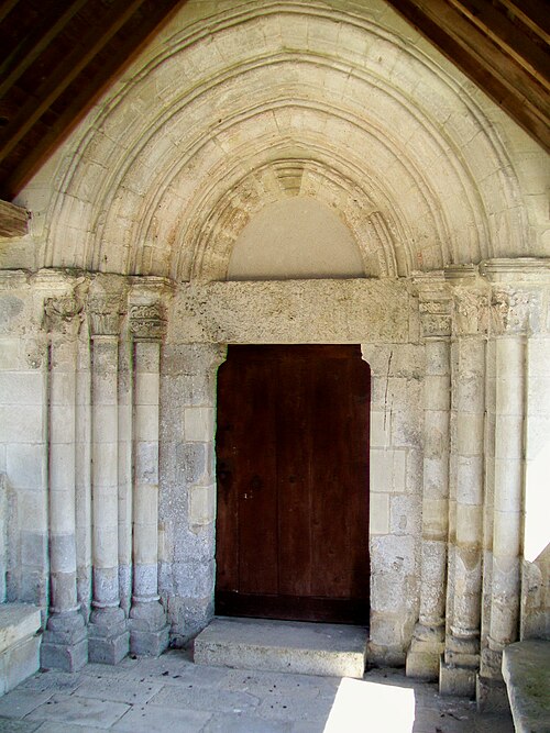 À l’extérieur, la façade occidentale est épaulée par des contreforts plats et percée d’une grande fenêtre en plein cintre surmontée d’un cordon de pointes-de-diamant ; le portail, abrité par un porche en charpente, forme un avant‑corps couronné d’un gâble mutilé et associe un noyau primitif du début du XIIe siècle conservé à des archivoltes et colonnettes ajoutées au milieu du XIIe siècle. La rupture d’appareil au‑dessus des contreforts signale l’adjonction postérieure des bas‑côtés. Le clocher, d’allure fonctionnelle, reçoit des baies primitive et des baies abat‑son réalisées lors de la construction des croisillons ; ses angles sont cantonnés de contreforts et une corniche de modillons termine les murs.