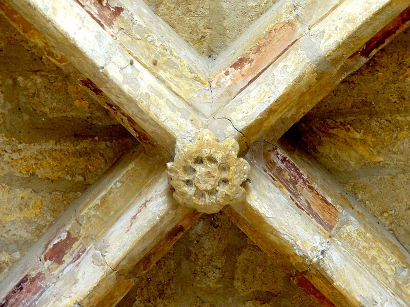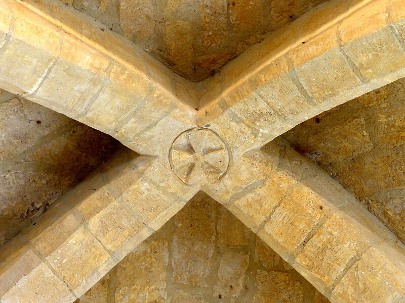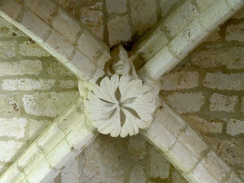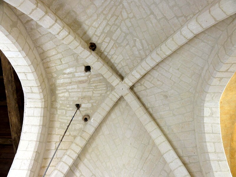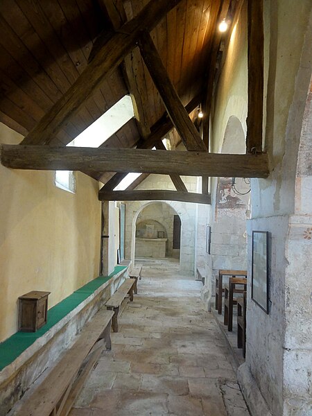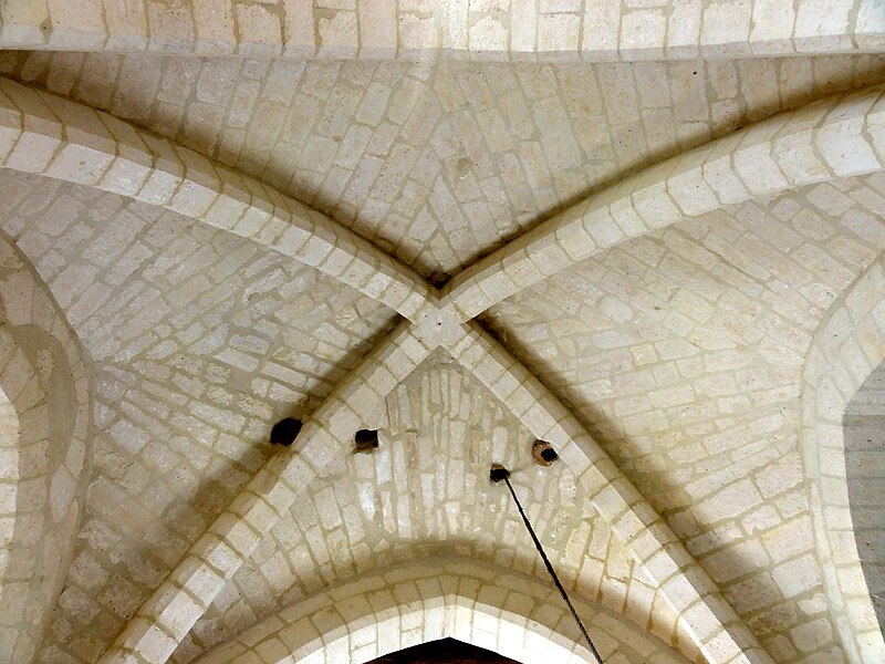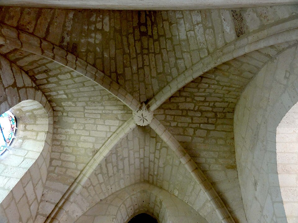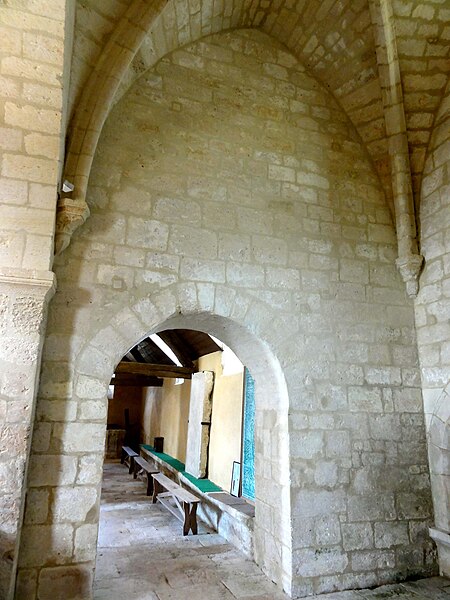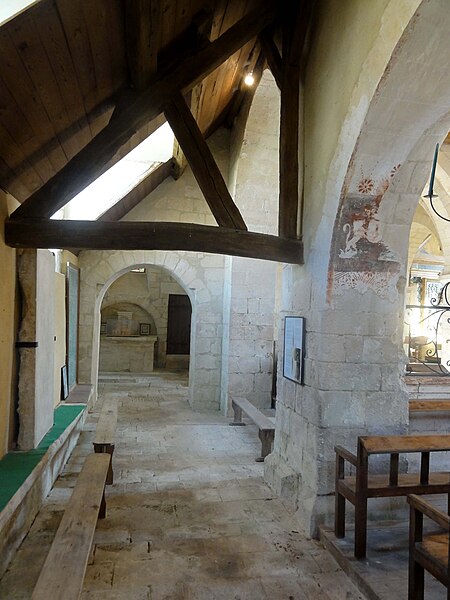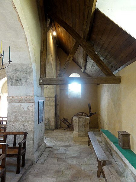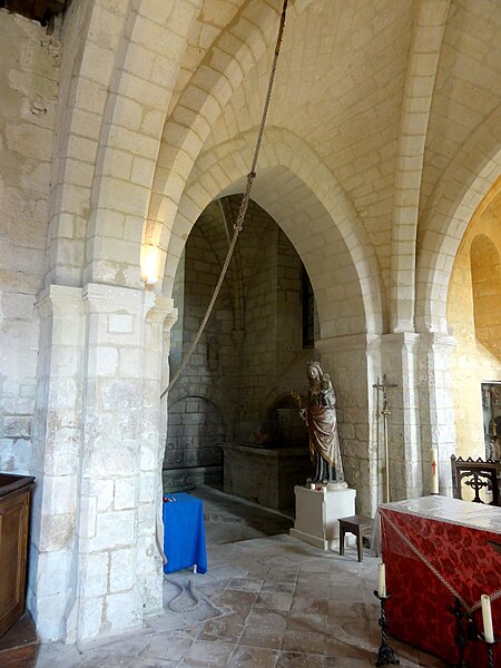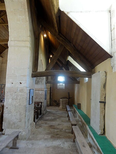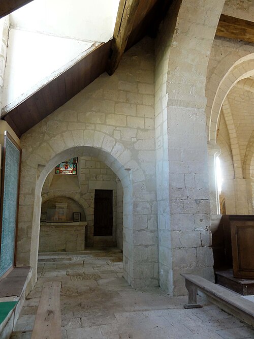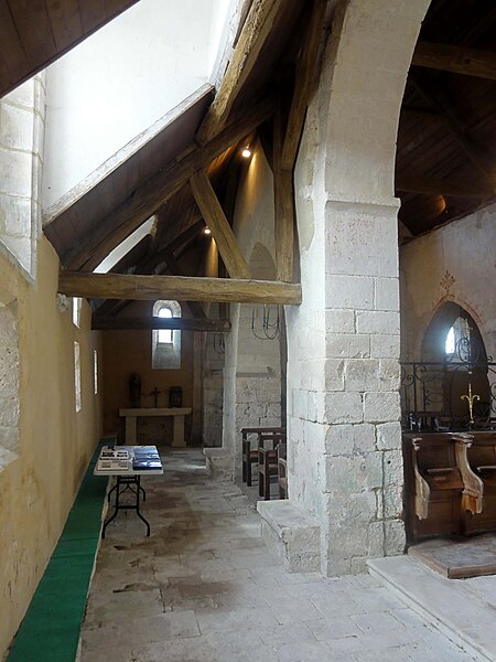 Les grandes arcades en tiers‑point qui ouvrent la nef sur les bas‑côtés et la troisième travée plus élevée marquent la transition vers des formes gothiques précoces ; les traces d’anciennes fenêtres en plein cintre et les impostes rudimentaires expliquent en partie le débat de datation entre auteurs, mais la description des éléments plaide pour une datation haute. Les bas‑côtés présentent des plafonds lambrissés à la manière de revers de toits, un dallage en pierre calcaire et des bancs de pierre ; leur éclairage repose sur de petites lucarnes et des fenêtres profondément ébrasées.