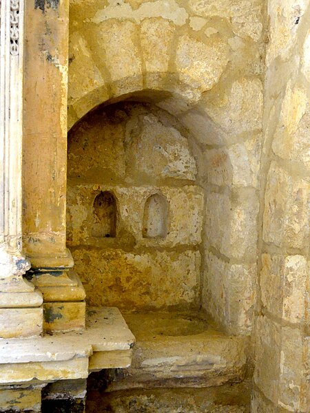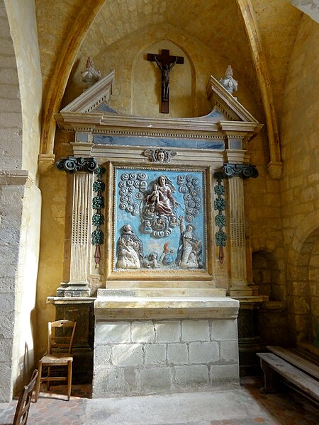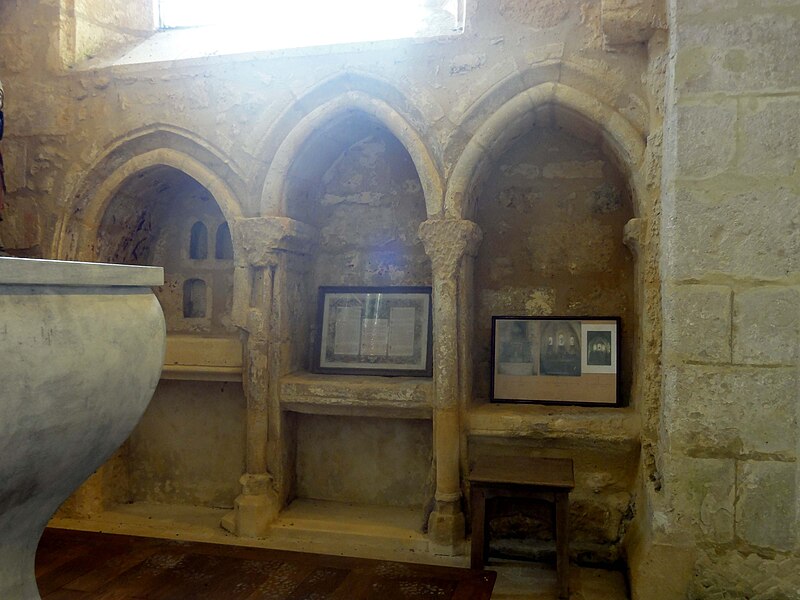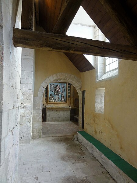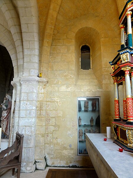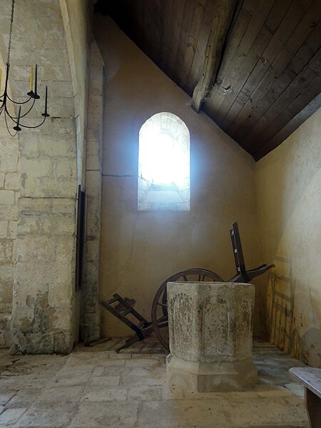 Les fonts baptismaux, datés du XIIe siècle, sont une cuve à infusion monolithique en calcaire : intérieurement cylindrique et extérieurement octogonale, chaque face porte une arcature en bas‑relief, les montants sont toriques et les chapiteaux peu marqués ; quelques ragréages en plâtre sont visibles et le socle moderne n’est pas inclus dans le classement. La Vierge polychrome de pierre, mesurant 169 cm, est attribuée au premier quart du XIVe siècle ; d’autres sculptures médiévales ou modernes, originales ou en réplique, complètent l’ensemble mobilier.