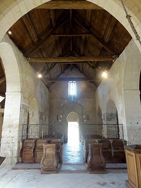 L’intérieur de la nef illustre une grande simplicité constructive : l’appareil en pierres de taille est de belle qualité, mais l’espace est dépourvu d’ornementation architecturale marquée et présente un intérêt limité, son principal attrait venant de l’ambiance restituée du XVIIIe siècle. La charpente visible date d’une campagne plus récente ; le mobilier moderne a été en grande partie supprimé pour retrouver une cohérence d’ensemble, les bancs étant anciens et homogènes. La grille de chœur en fer forgé de 1758 est conservée et repose sur un muret entre la seconde et la troisième travée. Les peintures murales dégagées comprennent une litre seigneuriale aux armes des Lancy de Raray, des frises ornementales, des monogrammes IHS au pochoir et des motifs floraux peints en ocre rouge et jaune.