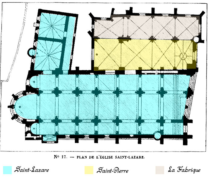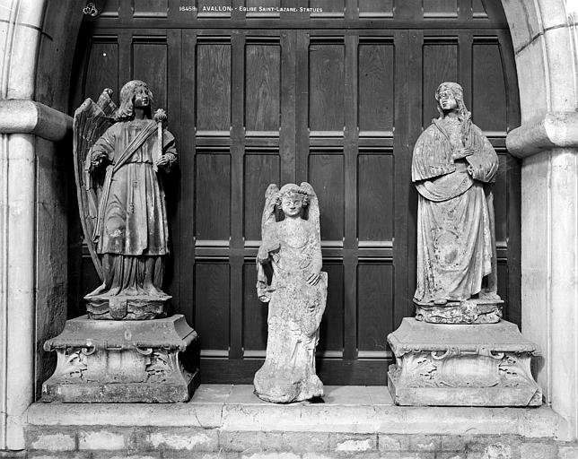 La collégiale Saint-Lazare d'Avallon, située dans l'Yonne en Bourgogne, est une ancienne collégiale de style roman dont le grand portail remonte au XIIe siècle et qui est dédiée à saint Lazare. L'édifice, classé au titre des monuments historiques en 1840, faisait partie d'un chapitre de chanoines et était le siège d'un archidiaconé de l'évêché d'Autun. Sa fondation remonte à une origine ancienne; le comte Gérard (ou Girard) aurait souhaité sa création et l'église primitive, placée sous le vocable de Notre-Dame, se trouvait à l'intérieur de l'enceinte du château. De cette première église du Ve siècle il ne subsiste qu'une petite crypte retrouvée sous le chœur en 1861. Peu après l'an 1000, une relique de saint Lazare donnée par Henri le Grand, duc de Bourgogne, attire les pèlerins en route vers Saint-Jacques de Compostelle et entraîne des dons importants; la collégiale conserve le nom de Notre-Dame jusqu'en 1146 avant de prendre celui de Saint-Lazare. Reconstruite en 1080 selon un plan rappelant les anciennes basiliques, elle présente un chœur voûté en quart de sphère, des arcades en plein cintre, deux chapelles en demi-cercle et une partie des bas-côtés; la nouvelle église fut consacrée par le pape Pascal II en 1106. Au XIIe siècle, l'abbaye de Cluny fit édifier une façade remarquable dont subsistent aujourd'hui deux portails ornés de colonnes torses et de riches sculptures décoratives. L'édifice a subi plusieurs calamités naturelles : la foudre en 1589, des vents en 1601 qui détruisirent des clochetons, puis une tempête en 1633 qui renversa la grande tour et le clocher et fit s'effondrer la première voûte de la nef. Le chapitre releva partiellement le portail et fit édifier en 1670 la tour visible aujourd'hui. D'importants travaux de restauration eurent lieu entre 1860 et 1865 : déblaiement du sol, repositionnement des tombes anciennes et installation d'un grand buffet d'orgues sculpté en 1864. Sur le plan architectural, l'édifice relève de l'école de Bourgogne ou de Cluny du XIIe siècle, reconnue pour l'élégance de ses sculptures; Victor Petit a évoqué la présence d'ouvriers venus de Cluny ou d'Autun. La voûte en cul-de-four de l'abside est caractéristique de la période, tandis que les fresques qui l'ornent datent du XIXe siècle. La collégiale présente des irrégularités de plan : la façade n'est pas perpendiculaire à l'axe de la nef et le chœur est situé 2,50 m en dessous du portail, la dénivelée étant rattrapée par 17 marches et de grands paliers obliques. La chapelle droite du chœur, dotée de stalles destinées aux chanoines, est décorée de peintures en trompe-l'œil du XVIIIe siècle. Le bas-côté sud conserve plusieurs œuvres : une statue en pierre de saint Michel terrassant le dragon (XIVe siècle), une sculpture de sainte Anne et de la Vierge (fin XVe siècle) et des statues en bois peint du XVIIe siècle. Dans la tribune qui surplombe la nef se trouve le grand buffet d'orgue sculpté posé en 1864. La façade conserve deux portails, le portail nord ayant disparu lors de la chute de la tour; Victor Petit les qualifiait de chefs-d'œuvre de la sculpture décorative. Les voussures du grand portail présentent cinq cordons sculptés au décor végétal, alternant colonnes torses et colonnes droites et ornées de nombreuses statuettes. Une grande statue-colonne du XIIe siècle, d'environ deux mètres, représentant un prophète et provenant de l'ancien portail, est visible sur le jambage droit; elle avait été réemployée au XVIIe siècle dans les abat-sons de la tour puis descendue en 1907. Un moulage du grand portail est présenté dans l'aile Est du palais de Chaillot, à la Galerie des moulages du Musée des monuments français. Le petit portail, vraisemblablement refermé vers la fin du XVIe siècle, est surmonté d'un linteau et d'un tympan dont les sculptures ont beaucoup souffert en raison des intempéries et des mutilations liées à la Révolution française. Une grande partie du parvis actuel occupait autrefois le cimetière paroissial, supprimé en 1724. À droite de la collégiale, la salle Saint-Pierre conserve le vestige de l'ancienne église paroissiale Saint-Pierre : une vaste salle voûtée, divisée en deux nefs par des colonnes centrales et reconstruite à la fin du XVe siècle sur des piliers très anciens. Un mur a ensuite séparé ces nefs, l'une devenant chapelle proche de Saint-Lazare et l'autre appartenant à la Fabrique; la salle a servi au XIXe siècle d'école et de pensionnat puis accueille aujourd'hui des expositions temporaires, après avoir reçu des artistes comme Gérard Titus-Carmel, SylC, Éric Michel et Dominique Albertelli. L'église Saint-Pierre possédait un clocher renversé en 1633, qui n'a pas été reconstruit.