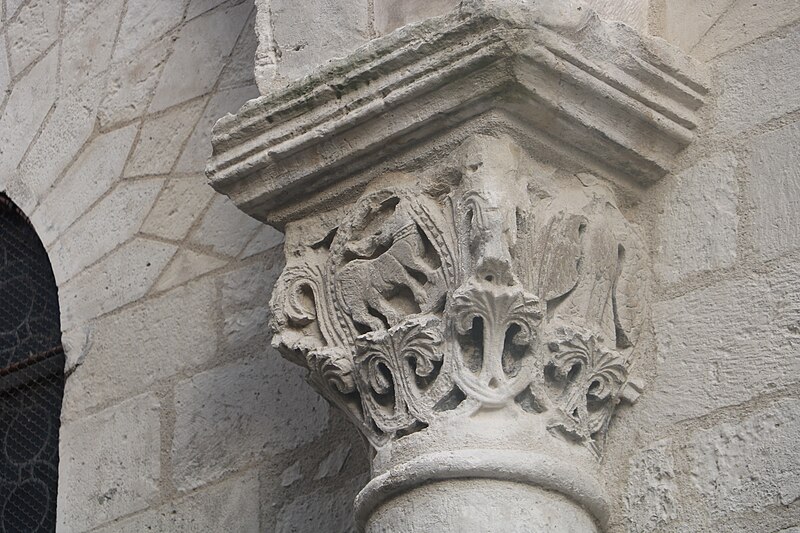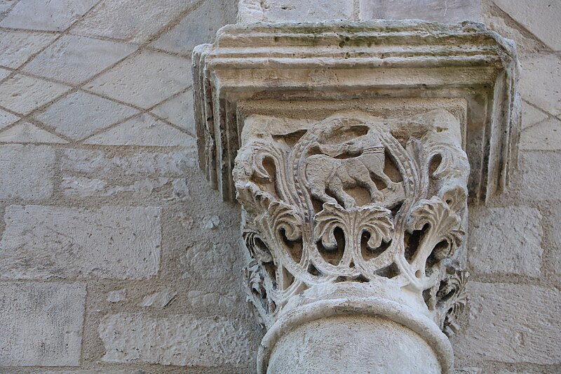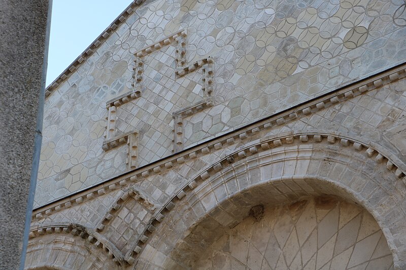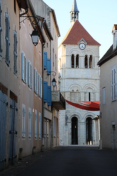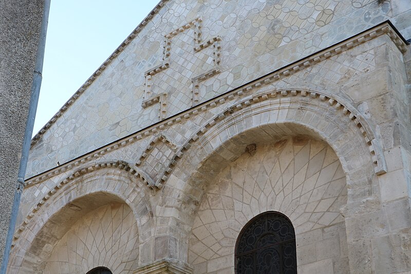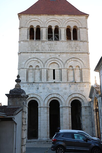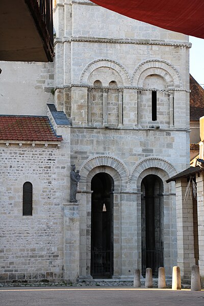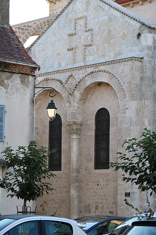 Le clocher-porche, massif, témoigne de l'influence de l'art roman du Val de Loire et rappelle l'abbatiale de Saint-Benoît-sur-Loire, observation faite par Éliane Vergnolle. Les portes d'entrée sont remarquables : les vantaux de bois sont recouverts de peaux marouflées et teintes en rouge, et les heurtoirs en bronze représentent un protomé de lion supportant un anneau posé sur une platine circulaire ornée d'inscriptions latines, dont l'une se lit : « adest porta per quam justi redeunt ad patriam ».