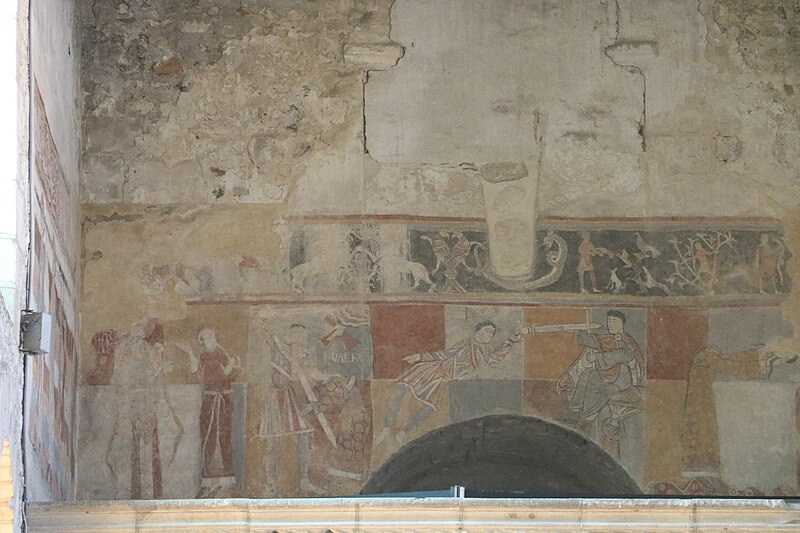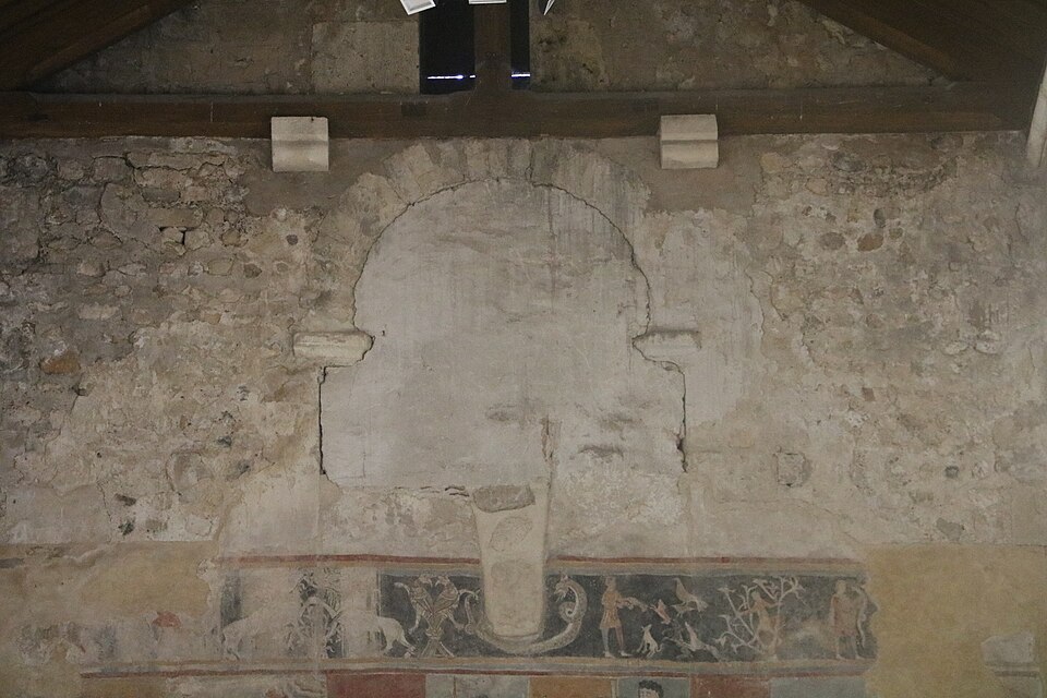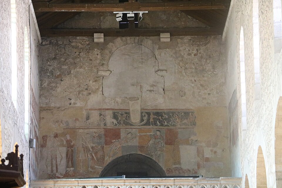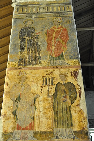 Les peintures murales romanes, bien conservées, ornent la tribune au-dessus du narthex sur les murs sud, ouest et nord et datent du XIIe siècle. D'après l'étude de Georges Jousse, la paroi sud serait réalisée entre 1085 et 1090, les parois ouest et nord entre 1115 et 1120. Sur le mur sud figurent des personnages en pied — l'évêque saint Austremoine, le pape saint Clément et un saint non identifié — ainsi qu'une scène de décollation représentant le martyre de saint Pancrace. Le mur ouest narre en quatre phases le martyre de sainte Valérie, tandis que le mur nord illustre trois scènes faisant intervenir les archanges. Dans la nef, des peintures gothiques postérieures à 1416 ornent le deuxième et le troisième piliers sud : le deuxième présente saint Blaise, saint Laurent, saint Antoine et saint Léger, le troisième montre saint Georges terrassant le dragon et une scène de crucifixion sur le thème de la Mater dolorosa.