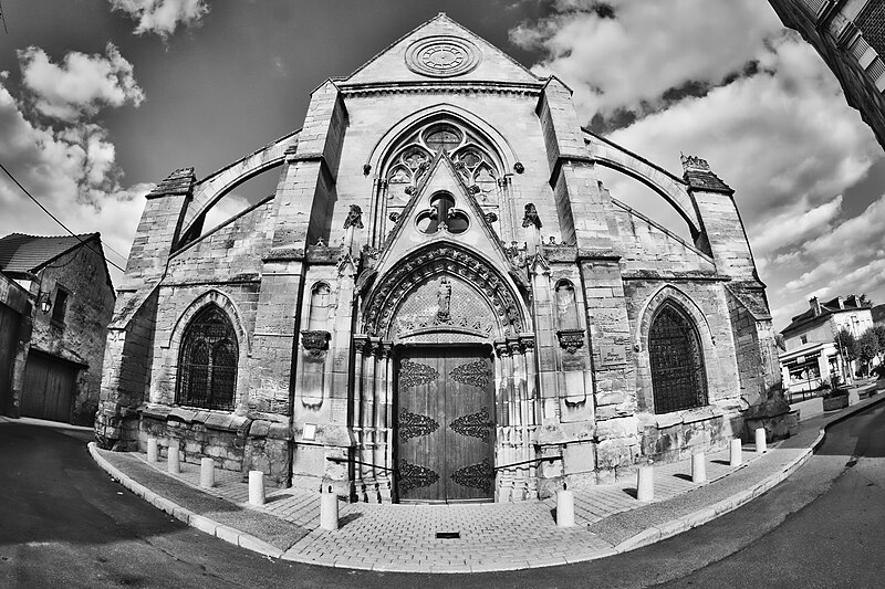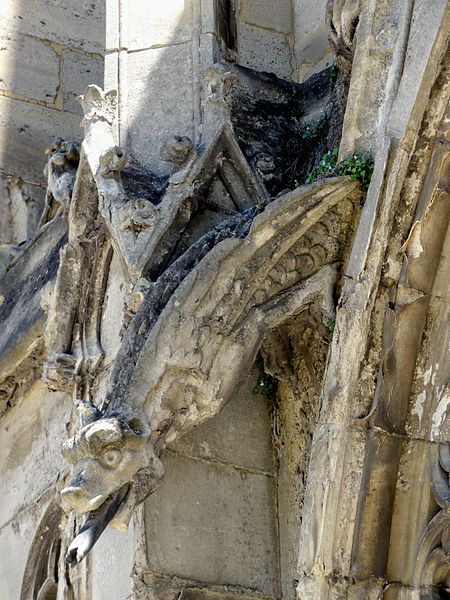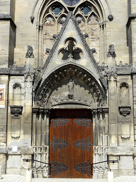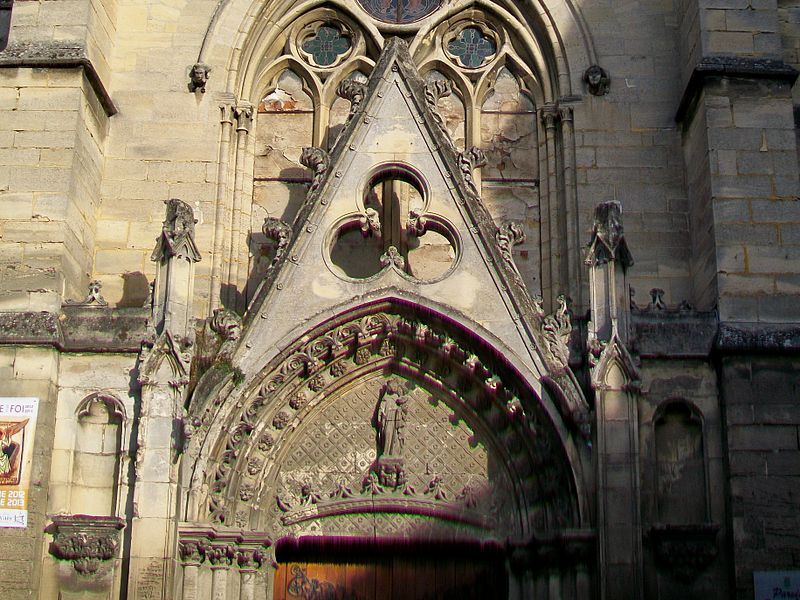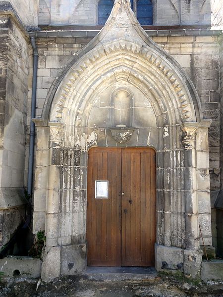 La façade occidentale, rythmée par rangs de billettes, larmiers et glacis, présente un portail en tiers-point à triple archivolte encadré de contreforts à pinacles, un tympan orné d'une arcature accueillant une Vierge à l'Enfant et un gâble XIXe qui masque partiellement une grande fenêtre à lancettes; les murs gouttereaux de la nef comportent des baies hautes à remplage simple et des arcs-boutants reliant la nef aux bas-côtés en appentis. Le transept se distingue par une corniche de feuillages, des baies et contreforts variés, une tourelle d'escalier octogonale au sud-est et une grande rosace au pignon du croisillon nord.