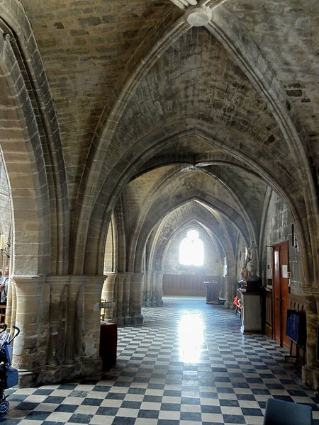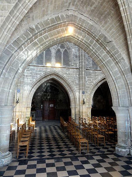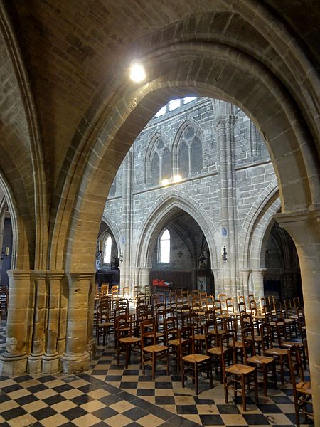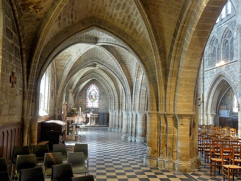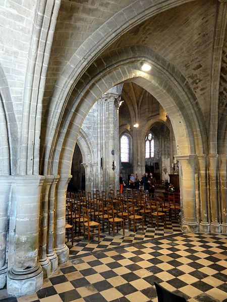 À l'intérieur, la nef, malgré sa physionomie trapue, s'organise en trois niveaux avec grandes arcades, une galerie aujourd'hui obturée et fenêtres hautes; l'ensemble est voûté sur croisées d'ogives dont aucun appareil n'est entièrement d'origine et où coexistent des profils du XIIIe siècle et des éléments stylistiques qui évoquent les XVe–XVIe siècles. Les piles des grandes arcades présentent un dispositif complexe de colonnes et colonnettes engagées, préfigurant des piles ondulées, tandis que les chapiteaux restent souvent simplement esquissés; les bas-côtés ont conservé leurs voûtes d'origine avec ogives à deux tores et formerets monotoriques.