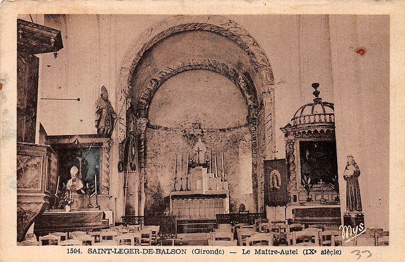 L'église Saint-Léger, située au cœur du village de Saint-Léger-de-Balson en Gironde, conserve de son origine romane uniquement l'abside en cul-de-four et la travée de chœur voûtée en berceau ; le reste de l'édifice relève du XVe siècle. Les trois nefs sont couvertes de voûtes d'arêtes ; les deux bas-côtés, chacun éclairé par trois fenêtres à meneau et broderie, se terminent à l'est par deux chapelles à chevet plat communicant avec le chœur. La présence d'une meurtrière laisse penser que les murs de ces chapelles appartiennent à la construction primitive. La façade est surmontée d'un clocher doté d'un double rang d'arcades. L'église, avec ses peintures murales, est classée au titre des monuments historiques par arrêté du 4 juillet 1973. Elle se trouve le long de la route départementale D3, près de l'intersection avec la D222.