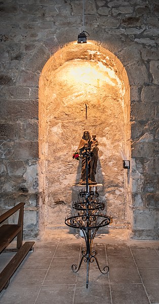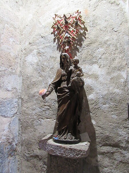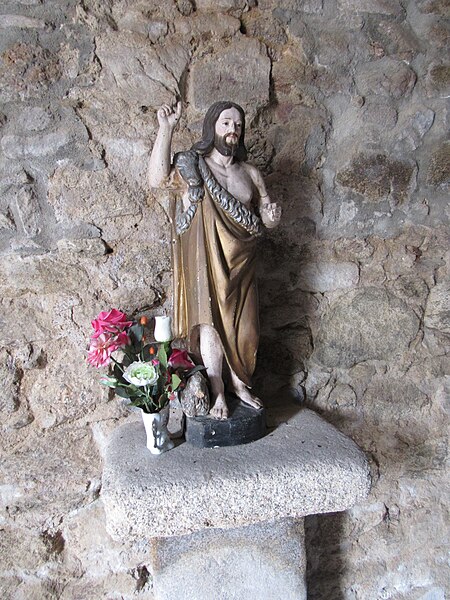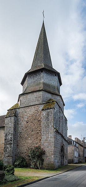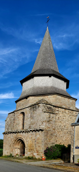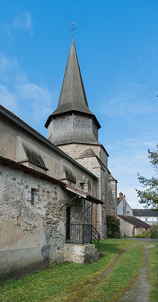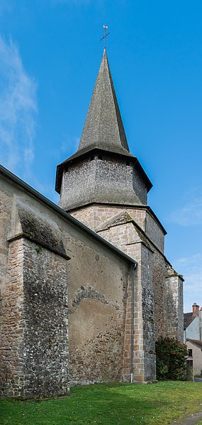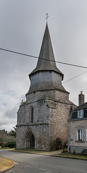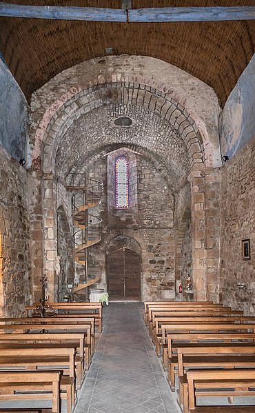 L'église se compose d'une nef à quatre travées irrégulières, avec un clocher octogonal établi sur la première travée dont la base est en pierre de taille. Le clocher est en bois et coiffé d'une flèche octogonale également en bois; clocher et flèche sont couverts de bardeaux de châtaignier. La première travée est couverte par une voûte en plein cintre en maçonnerie, séparée des autres travées par un arc doubleau en pierre de taille. La voûte des autres travées s'est effondrée, entraînant un désaxement des maçonneries des murs et des contreforts, trop faibles pour résister à la poussée d'une voûte trop lourde; on aperçoit l'amorce de la voûte de la nef. Des colonnes surmontées de chapiteaux du XIIe siècle subsistent; elles recevaient la retombée des arcs doubleaux aujourd'hui disparus. La voûte de maçonnerie disparue a été remplacée par un plancher de forme circulaire. Les tirants de la charpente sont apparents et indiquent que celle-ci a été refaite après la chute des voûtes; cette charpente est plus basse que la précédente. La façade ouest s'ouvre par une porte composée de trois arcatures tracées en tiers-point et flanquée de colonnettes.