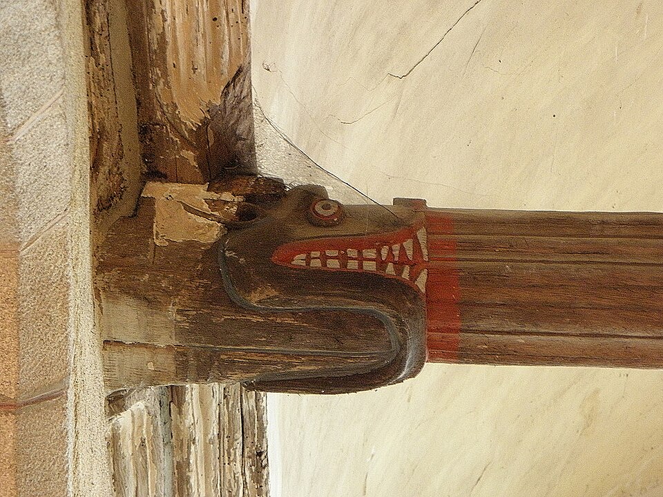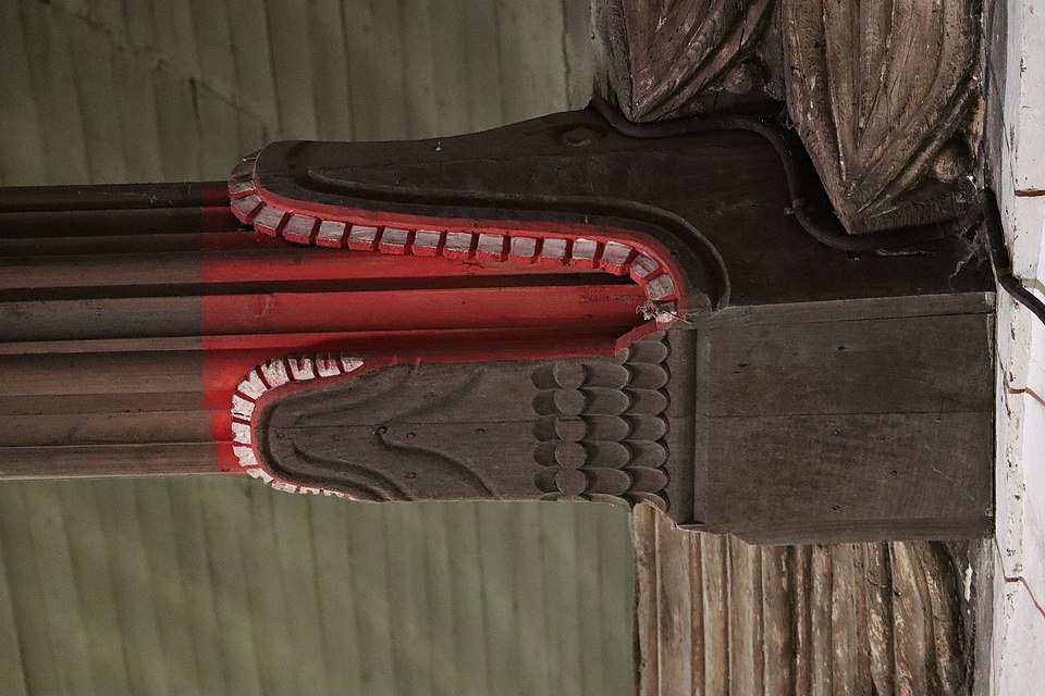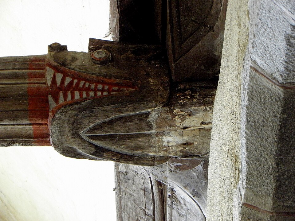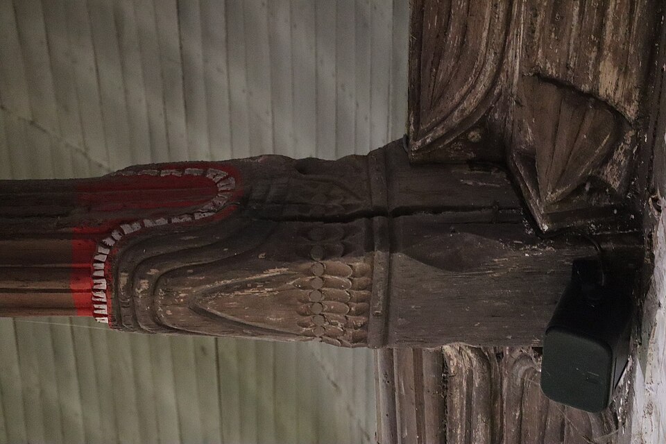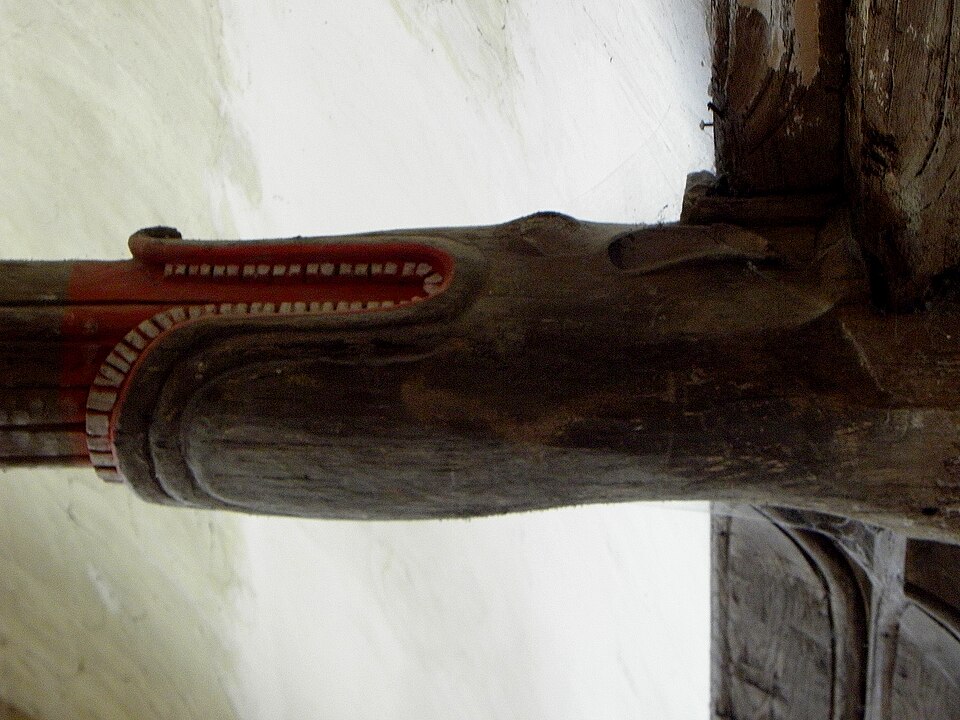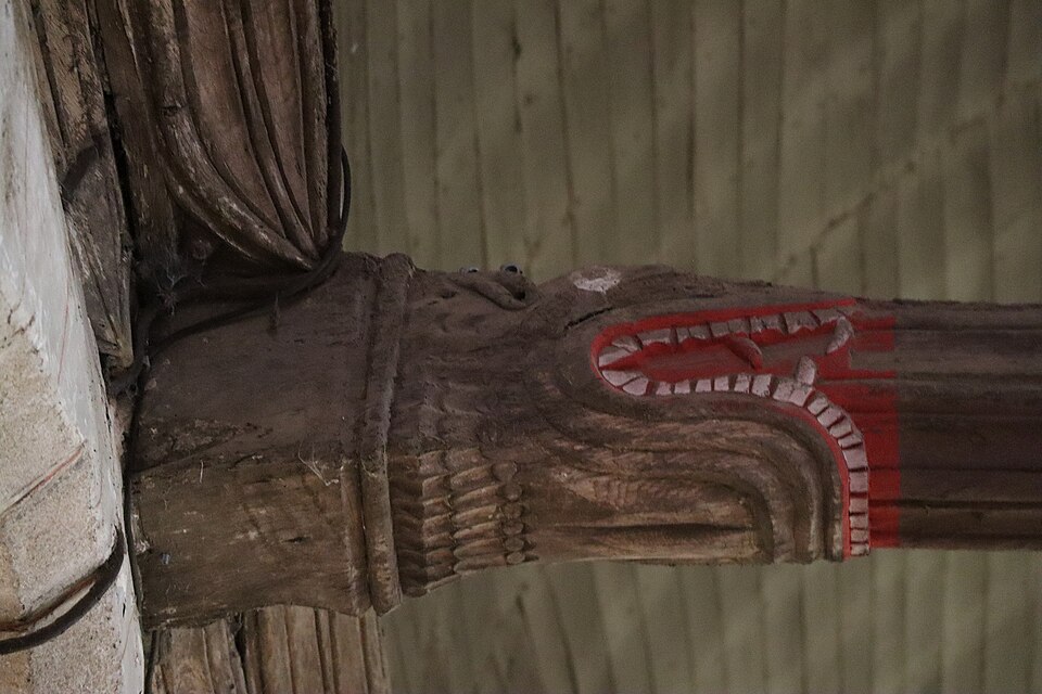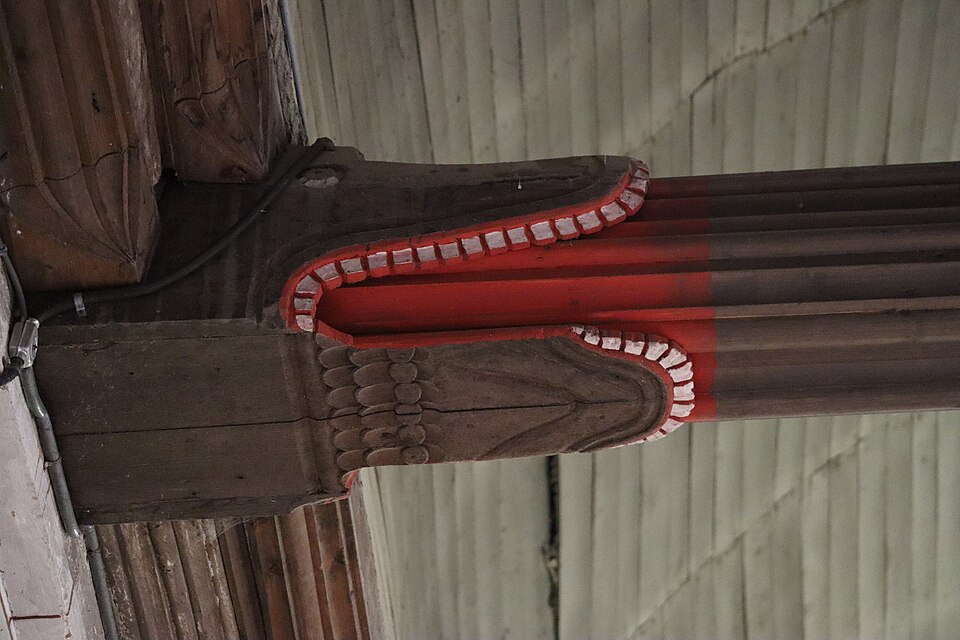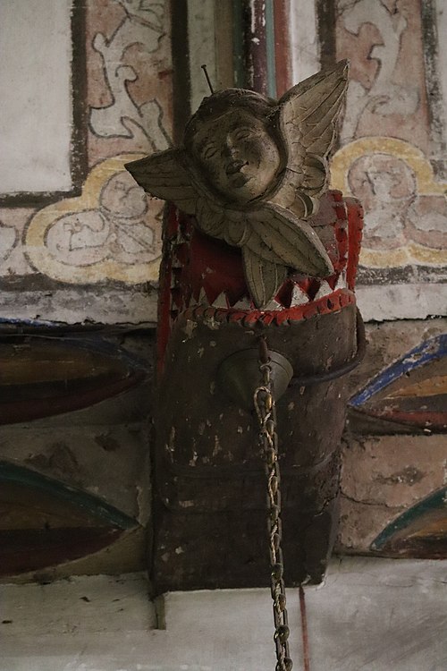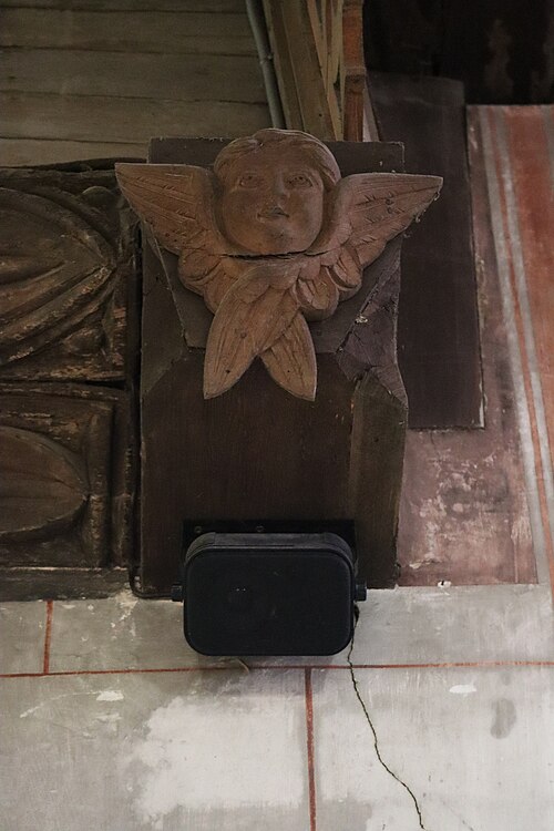 À l'intérieur, l'église est orientée et organisée autour d'une nef principale accompagnée au nord d'un collatéral formé par quatre chapelles sur toute la longueur, tandis que le sud compte deux chapelles, dont l'une se loge sous la tour-clocher; les dernières chapelles de chaque côté forment un pseudo transept bas. L'arcature qui sépare les deux nefs est composée de quatre arcs ogivaux de tailles différentes, appuyés sur des colonnes ou piliers aux chapiteaux variés; côté collatéral, ces arcs percent l'ancien mur gouttereau des chapelles. L'édifice développe un parti bas sans étage et est entièrement voûté de bois : la nef et le chœur sont couverts par un douvis qui repose sur des sablières apparentes, tandis que le collatéral nord présente des douvis successifs perpendiculaires à l'axe de circulation. Le plafond de la chapelle sous la tour est orné de moulures d'époque XIXe. La distribution intérieure s'organise selon l'axe est-ouest ; l'église compte trois accès — une porte centrale à l'ouest, une entrée sur le flanc sud et une porte dans la première chapelle sud — et la condamnation de la porte occidentale du collatéral nord renforce la prééminence du vaisseau principal. La lumière provient principalement de la maîtresse-vitre du chevet, accentuant la mise en valeur des vitraux de la Passion.