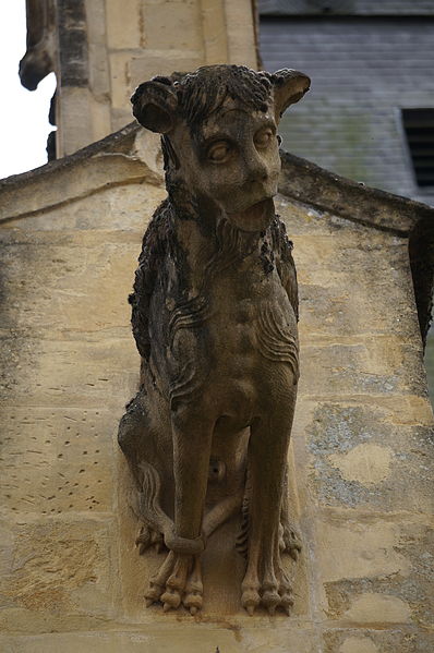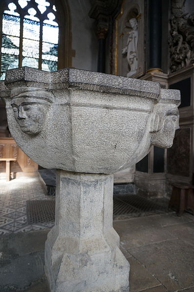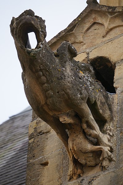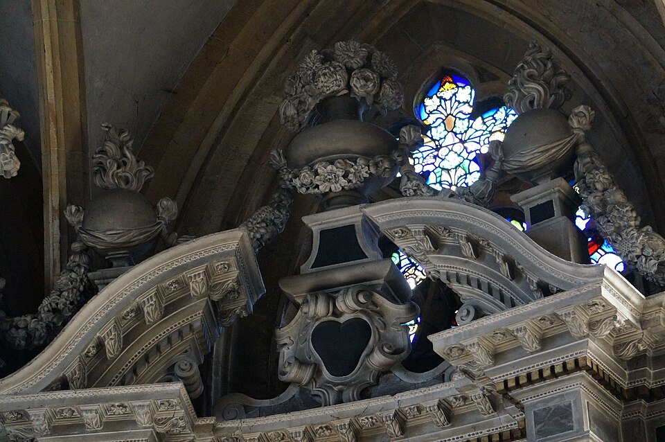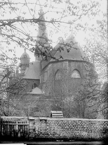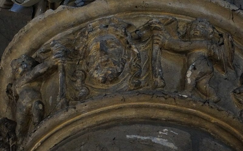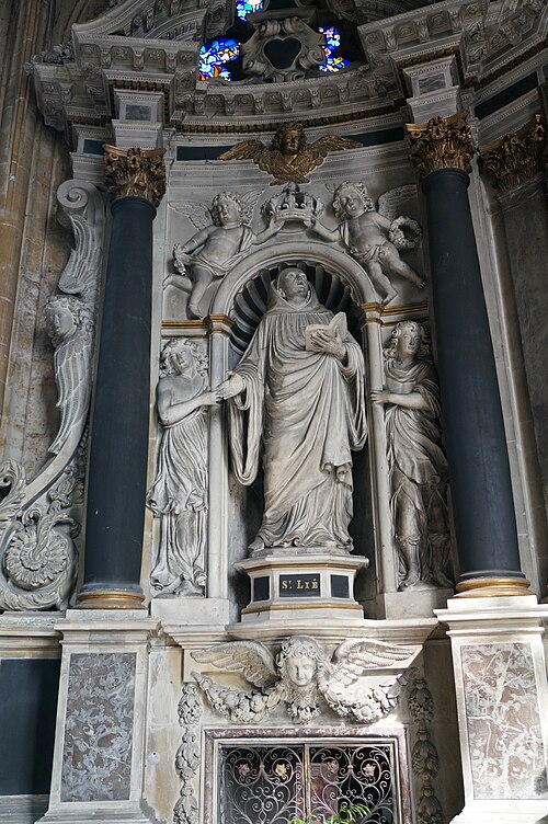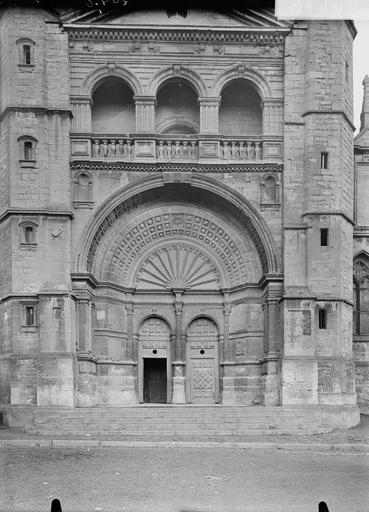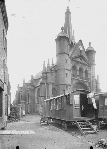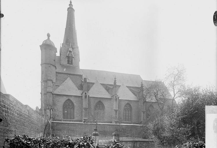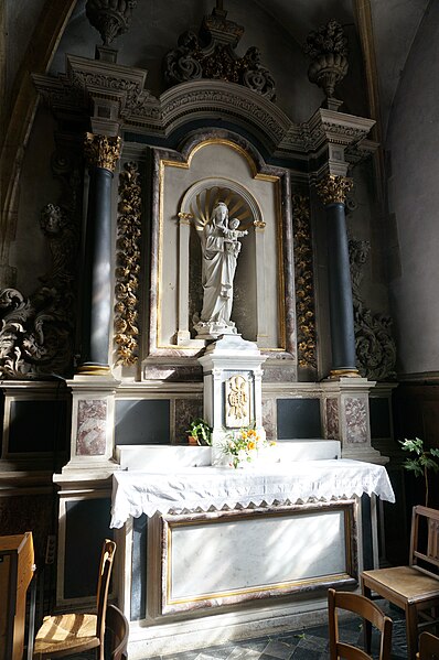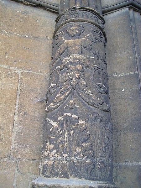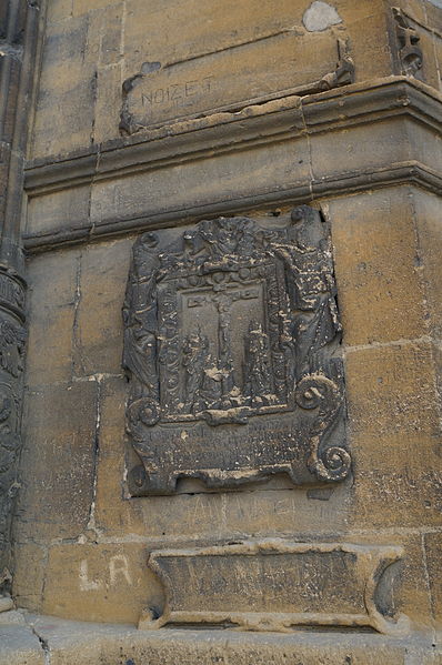 La façade ouest porte les dates 1607 et 1611 et adopte un style classique en contraste avec le reste de l'édifice. On y relève des éléments d'inspiration renaissance italienne, notamment le portail, des tourelles hexagonales et un balcon. Le porche est couvert d'une voûte cintrée à caissons dont les lignes convergent vers le tympan. Une loggia ajourée de trois baies, surmontée d'un fronton triangulaire, surplombe l'entrée, flanquée de deux tourelles latérales hexagonales. Les bas-côtés sont couverts par une succession de petites toitures à trois pans séparées par des arcs-boutants, et la partie droite de l'édifice présente deux cadrans datés de 1562, l'un solaire et l'autre lunaire.