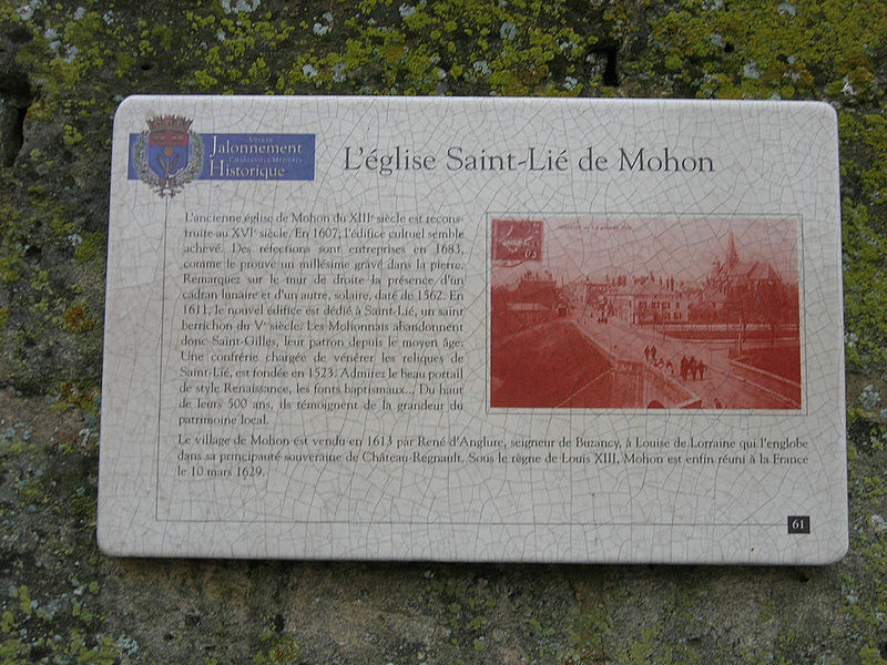 L'église Saint-Lié de Mohon, aujourd'hui rattachée à Charleville-Mézières dans les Ardennes, est placée sous le vocable de saint Lié, moine du Berry protecteur des malades. Un premier édifice, probablement dédié à saint Gilles, existait déjà au XIIIe siècle. Au XVIe siècle fut édifiée une nouvelle église de style gothique flamboyant, apparemment achevée entre 1607 et 1611, avec des réparations attestées en 1683 par une inscription. Le corps de Lié de Micy aurait reposé dans l'église à cette époque. En 1523 une confrérie chargée de vénérer les reliques de saint Lié fut fondée et obtint une indulgence du pape Paul V, puis en 1611 l'édifice fut définitivement consacré à saint Lié en lieu et place de saint Gilles. En 1613 l'église et le village de Mohon furent vendus par René d'Anglure à Louise Marguerite de Lorraine et rattachés à la principauté de Château-Regnault, puis Mohon et son église furent réunis à la France le 6 mars 1629. Mohon fut intégré en 1966 à Charleville-Mézières, à laquelle l'église est depuis rattachée. L'édifice est classé au titre des monuments historiques depuis le 14 octobre 1911. L'un des deux reliquaires contenant les reliques de saint Lié fut volé en 1977 ; seule subsiste aujourd'hui la tête reliquaire contenant le crâne du saint et une clavicule.