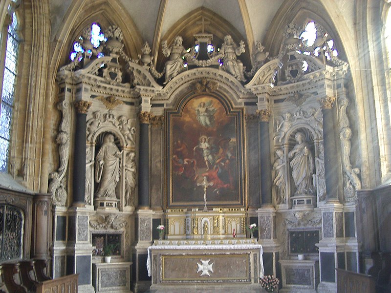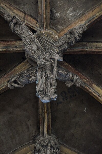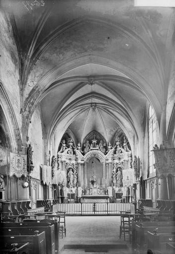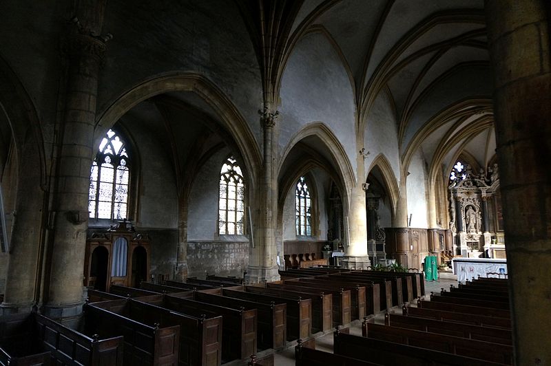 L'intérieur, de style flamboyant, offre un vaste espace sans cloisonnement du fait de l'absence de transept, de l'emploi de piliers circulaires et de la faible différence de niveau entre le vaisseau central et les collatéraux. La nef centrale est large ; le style des voûtes des deux premières travées indique une campagne de construction postérieure à celle du chœur. Les colonnettes reposent sur des piles circulaires et les ogives forment des nervures complexes. Les chapiteaux de style renaissance sont ornés de putti et de guirlandes de fruits encorant la partie haute des supports, et la clé de voûte de la deuxième travée porte une sculpture du Christ ressuscité entouré des évangélistes. Le décor du XVIIIe siècle se manifeste notamment par le retable du chœur représentant la Résurrection, encadré d'une décoration riche en marbre polychrome et surmonté, sur la corniche, de deux anges assis présentant les emblèmes de la Passion ; des boiseries sculptées habillent les murs latéraux.