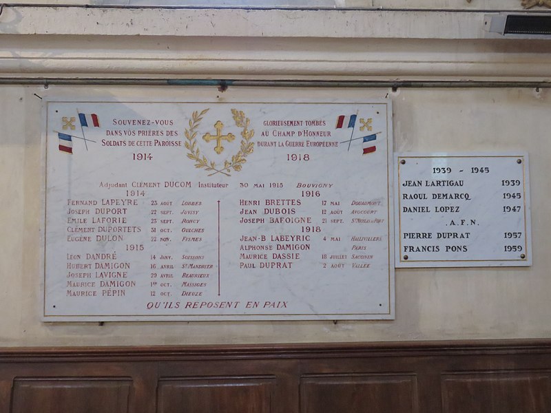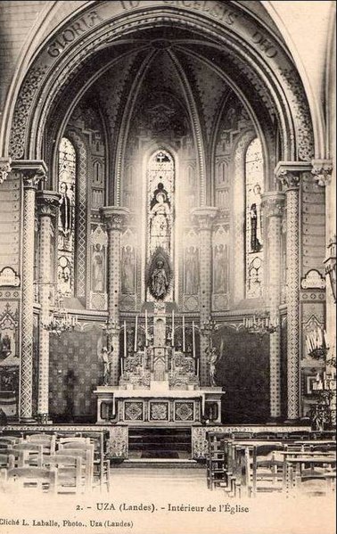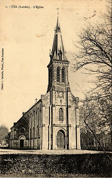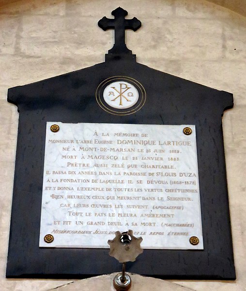 Une plaque de marbre posée le 8 octobre 1883 par Louis‑Eugène‑Amédée de Lur‑Saluces honore la mémoire du premier curé d'Uza, Dominique‑Émile Lartigue.