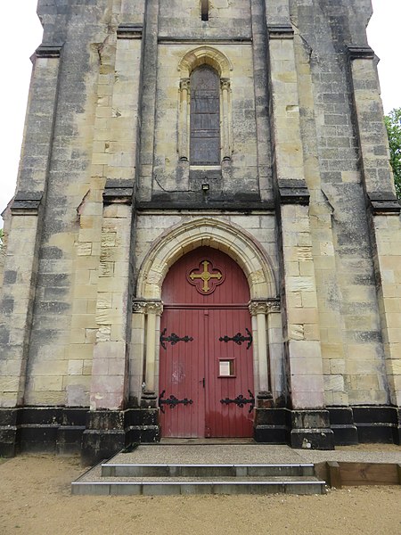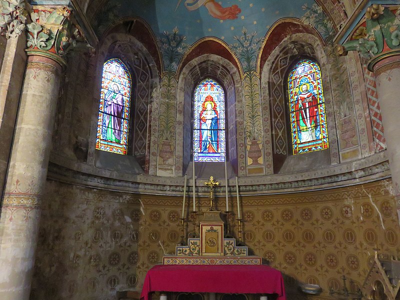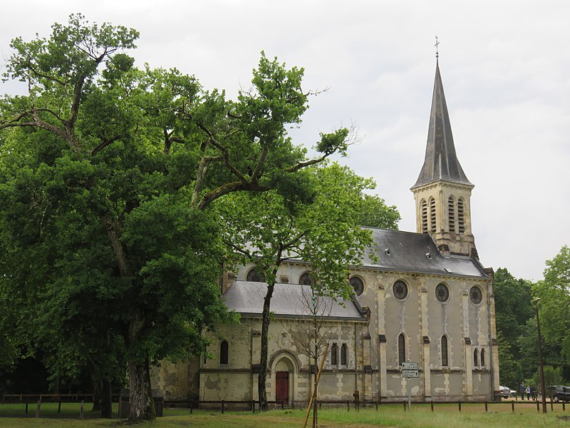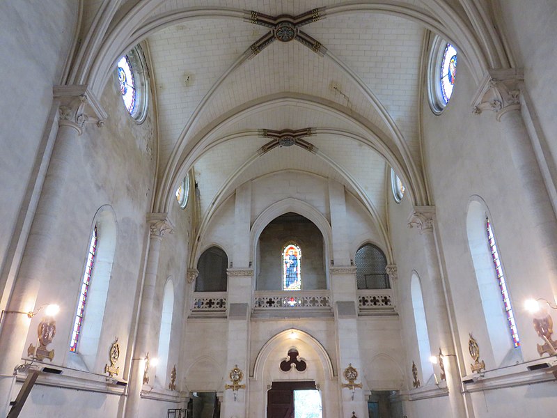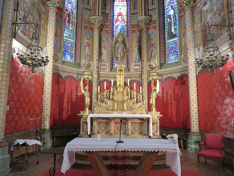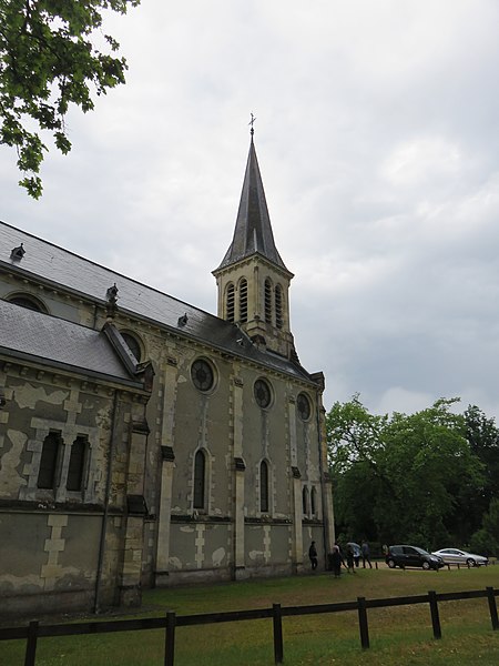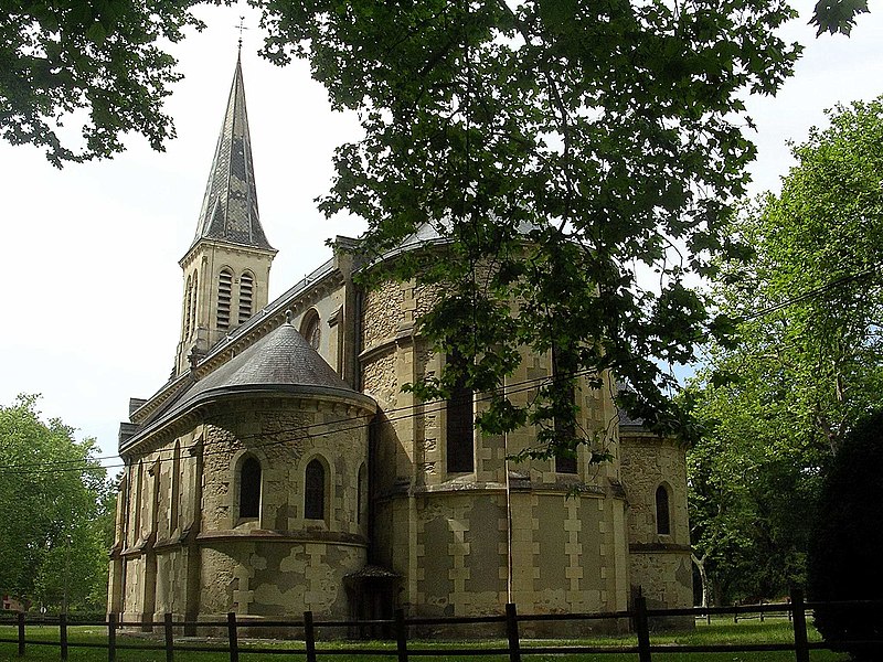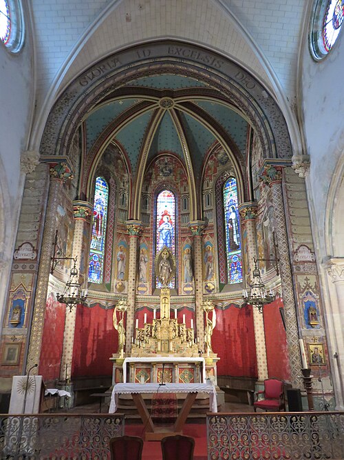 Extérieurement, les volumes élancés sont dominés par un clocher‑porche occidental couronné d'une flèche ; une nef rectangulaire à trois travées précède une croisée de faux transept et un chœur en abside semi‑circulaire. Le chœur est flanqué au nord et au sud de deux chapelles latérales se terminant en absidioles, disposant ainsi un chevet de type bénédictin au plan original. L'architecture intérieure renvoie au XIIIe siècle et l'abside ainsi que les absidioles sont ornées de peintures ; le mobilier est contemporain de la construction. L'autel du chœur provient de l'atelier de Jean‑Alexandre Chertier.