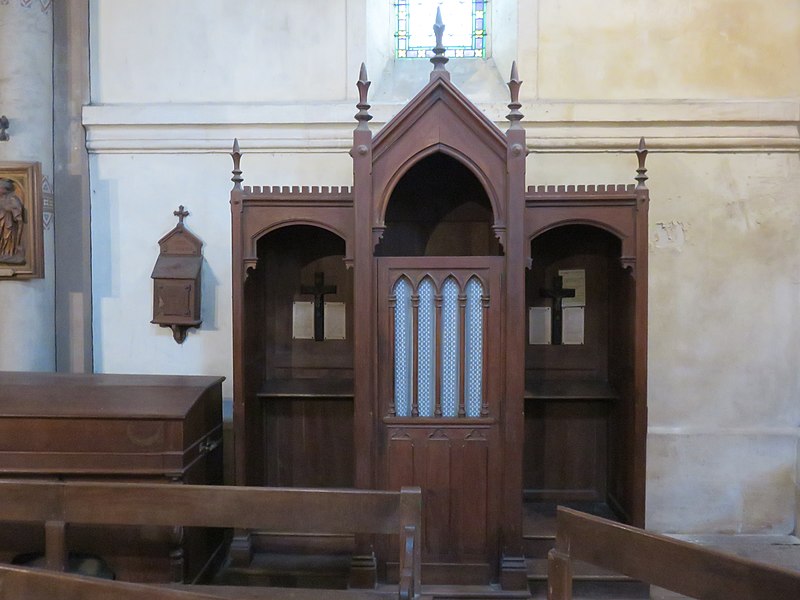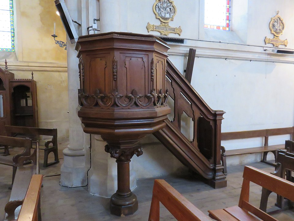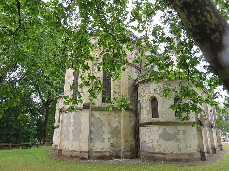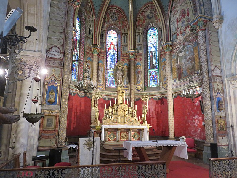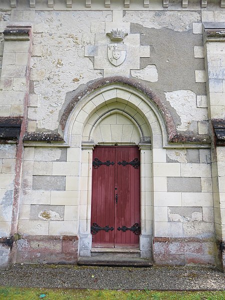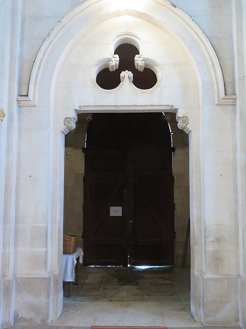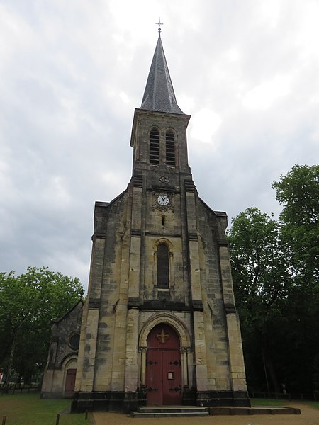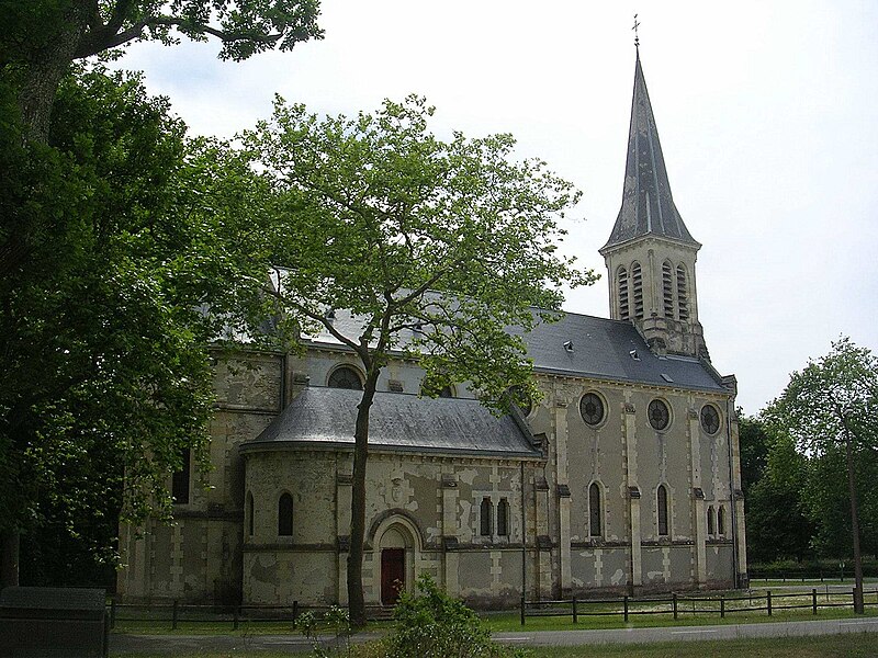 Extérieurement, les volumes élancés sont dominés par un clocher‑porche occidental couronné d'une flèche ; une nef rectangulaire à trois travées précède une croisée de faux transept et un chœur en abside semi‑circulaire. Le chœur est flanqué au nord et au sud de deux chapelles latérales se terminant en absidioles, disposant ainsi un chevet de type bénédictin au plan original. L'architecture intérieure renvoie au XIIIe siècle et l'abside ainsi que les absidioles sont ornées de peintures ; le mobilier est contemporain de la construction. L'autel du chœur provient de l'atelier de Jean‑Alexandre Chertier.