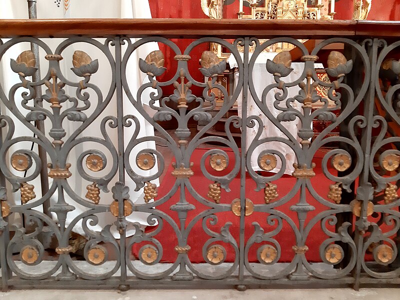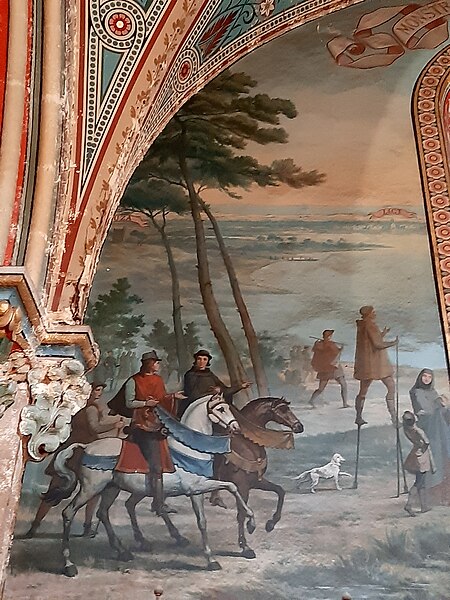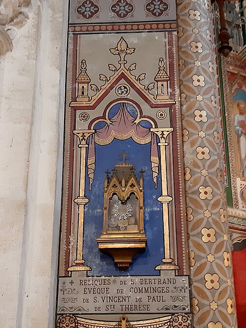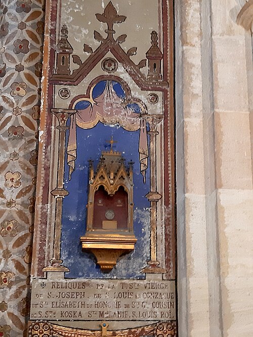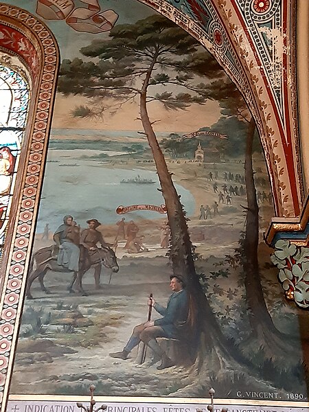 Les deux chapelles latérales sont entièrement peintes : celle de la famille de Lur‑Saluces présente des tentures feintes semées du monogramme SL et de couronnes, des rinceaux floraux et un cul‑de‑four étoilé avec une colombe du Saint‑Esprit ; la chapelle dédiée à la Vierge, fréquentée par le directeur des forges, montre des tentures ornées du monogramme MA et de lys, un cul‑de‑four où un ange porte la banderole « AVE MARIA GRATIA PLENE », et un autel dont le tabernacle représente un Agnus Dei en métal doré. Le mur sud de la chapelle porte une grande fresque signée G. Vincent (1890) qui évoque le pèlerinage à Notre‑Dame de Contis en juxtaposant scènes médiévales et XIXe siècle, et qui fait apparaître la petite chapelle de Contis, le château d'Uza, la fontaine de la Madeleine et l'ancien étang de Lit. L'origine de ce pèlerinage remonterait probablement au Moyen Âge ; on connaît au XVIe siècle une chapelle dédiée à Marie‑Madeleine possédée par les Hospitaliers de Malte, et le pèlerinage connut des tensions au XVIIe siècle lorsque le cardinal de Sourdis tenta d'en restreindre la pratique.