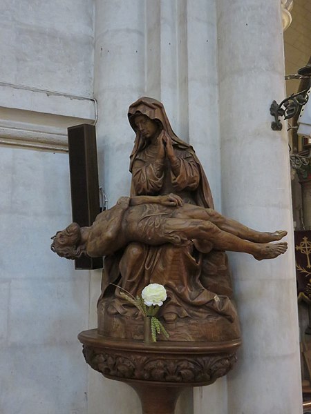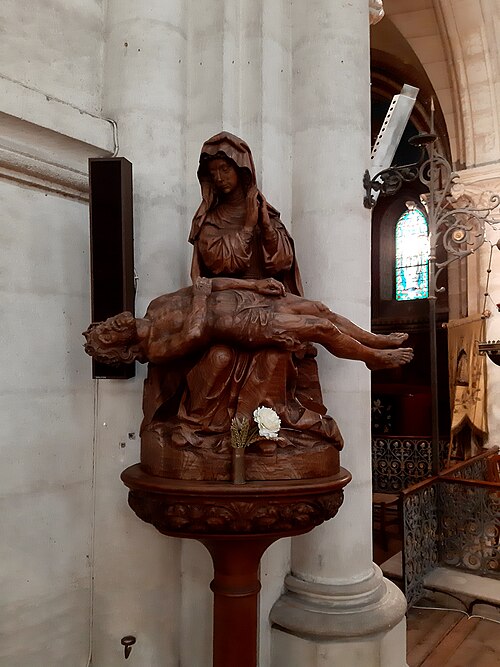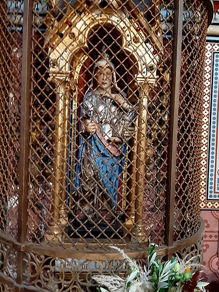 Trois statues en bois polychrome datées du XVIe siècle proviennent de l'ancienne chapelle de Contis et représentent Notre‑Dame de Contis (Vierge à l'Enfant), sainte Marie‑Madeleine et sainte Anne. La Vierge, haute de 85 cm, porte des attributs en laiton doré remodelés au XIXe siècle et est présentée sous un dais néogothique réalisé en 1870 ; Marie‑Madeleine, de facture voisine, est représentée pieds nus et tenant le vase de parfum traditionnel ; sainte Anne, vêtue d'un long voile, tient un livre et une quenouille dont la partie métallique est moderne. Dans la nef se trouvent également une réduction en bois lamé d'argent de Notre‑Dame d'Aquitaine, d'après une œuvre de Jean‑Alexandre Chertier, et une statue du Sacré‑Cœur en bois lamé d'argent.