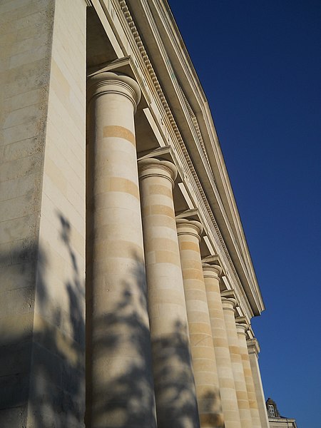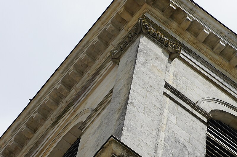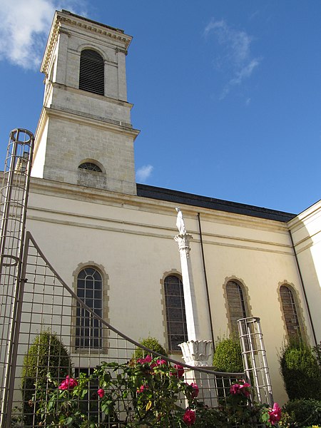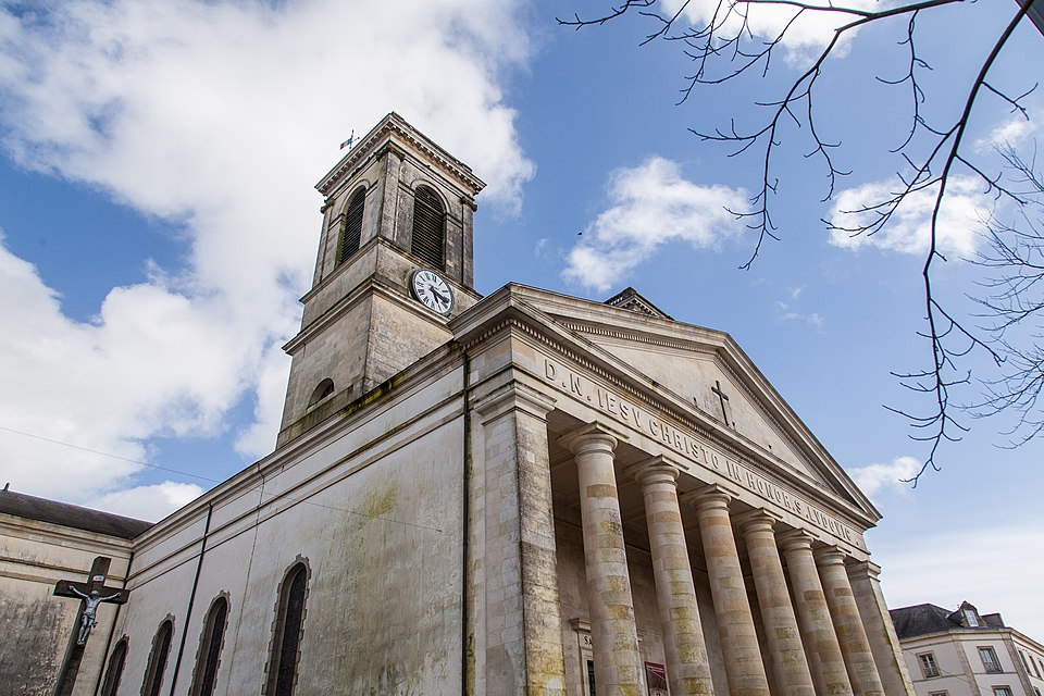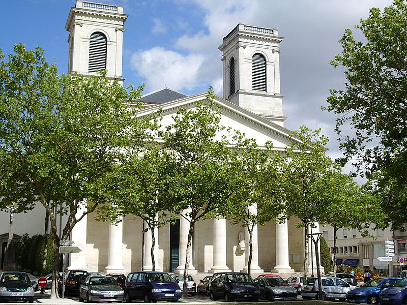 De style néoclassique, la façade présente un portique de six colonnes et deux pilastres d'ordre toscan ouvrant sur un pronaos in antis, le tout réalisé en pierre calcaire de Charente acheminée depuis Taillebourg. Derrière la façade s'élèvent deux clochers carrés ornés de pilastres ioniques atteignant environ trente mètres de hauteur. Le plan est basilical ; après débats sur l'élévation, l'ordre retenu fut de type romain et, en raison d'un affaissement de la charpente en chêne de la forêt de Grasla, vingt-quatre contreforts et deux chapelles latérales furent construits en urgence, donnant à l'édifice un plan extérieur en forme de croix latine.