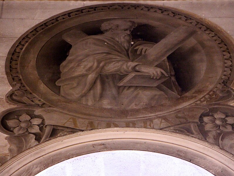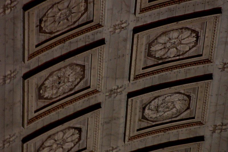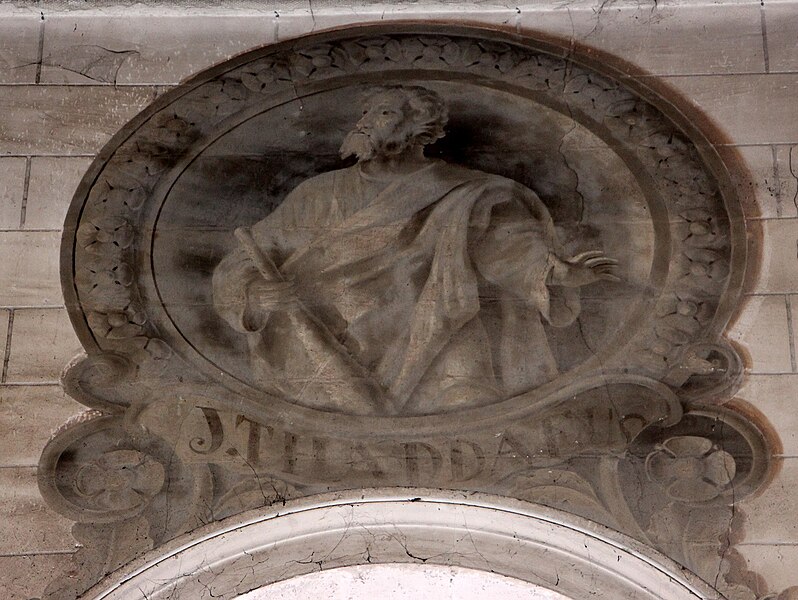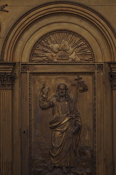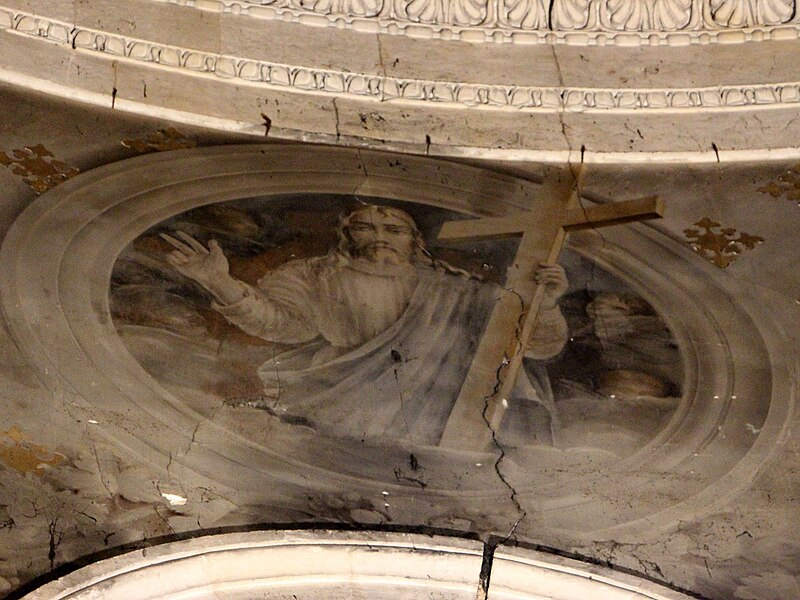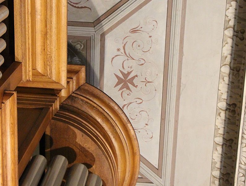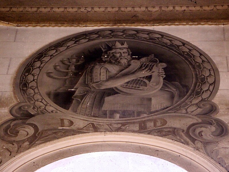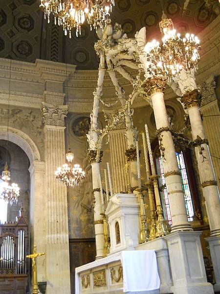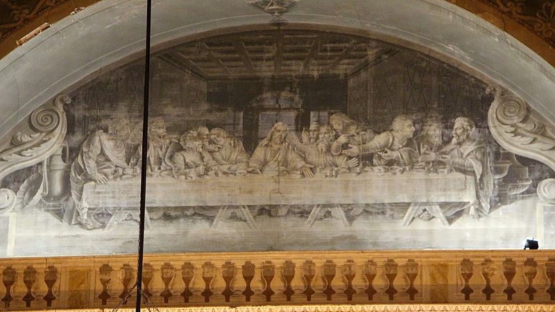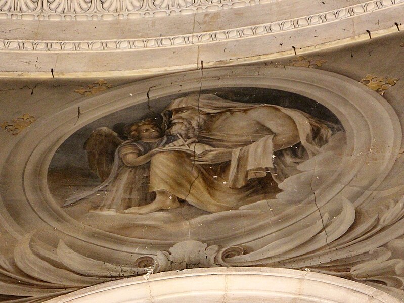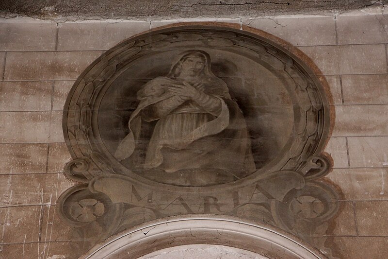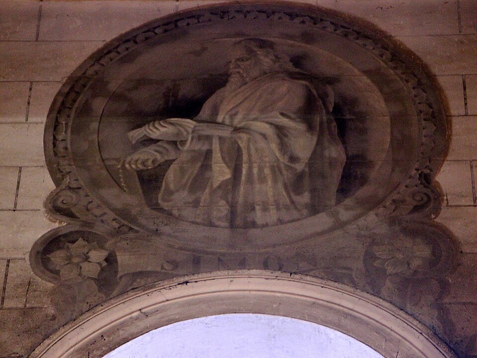 Pour compenser les limites de financement, de nombreux trompe-l'œil furent exécutés dès l'origine et lors du réaménagement du chœur au XIXe siècle : vingt-cinq médaillons en grisaille sous les entablements, des représentations des évangélistes et du Christ dans l'abside, ainsi que des figures des fondateurs de l'Alliance, des prophètes, des apôtres, de Marie et d'Élisabeth dans les bas-côtés. Les caissons de la tribune de l'orgue et des bas-côtés sont peints, l'abside comporte des caissons octogonaux en trompe-l'œil et la tribune dite de la Cène reprend en grisaille la célèbre composition de Léonard de Vinci ; des décors à motifs classiques et baroques ornent aussi murs et piliers du chœur et des chapelles absidiales. Dans le chœur figurent les évangélistes saint Luc, saint Matthieu, Jésus, saint Jean et saint Marc ; les bas-côtés présentent, du côté gauche, des personnages bibliques et saints tels que Moïse, David, Isaïe, Jérémie, sainte Élisabeth, saint Jacques le Mineur, saint Barthélémy, saint André, saint Philippe et saint Pierre, et, du côté droit, Aaron, Salomon, Ézéchiel, Daniel, la Vierge Marie, saint Jacques le Majeur, saint Thaddée, saint Simon, saint Thomas et saint Paul.