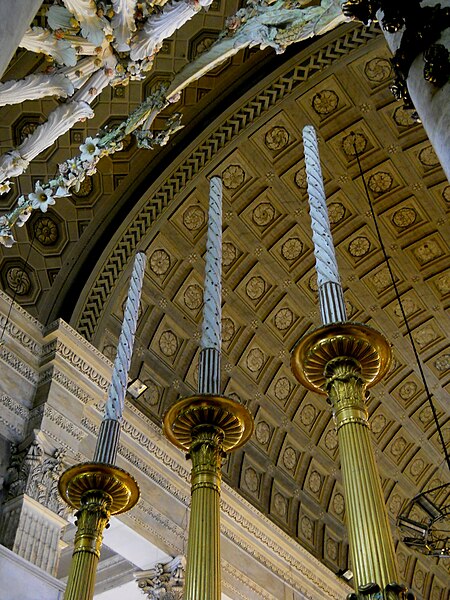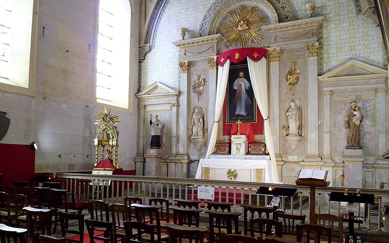 L'intérieur se caractérise par un vaste péristyle néoclassique de colonnes rudentées et cannelées à chapiteaux corinthiens, surmonté d'un entablement et d'une imposante voûte lambrissée en berceau ; la réalisation de cette voûte mobilisa les deux tiers des chênes de la forêt de Grasla. Les caissons en bois du berceau sont ornés de rosaces peintes en trompe-l'œil, de même que la voûte en cul-de-four de l'abside, agrémentée d'une gloire percée où figurent les lettres du tétragramme.