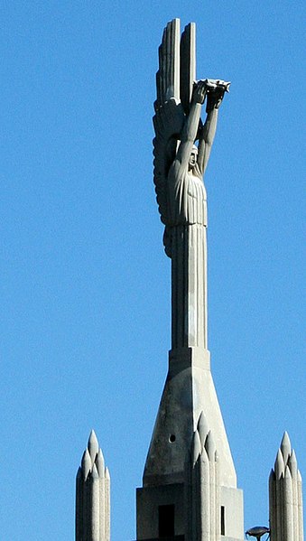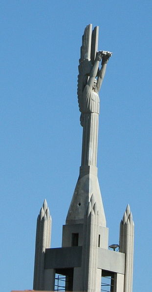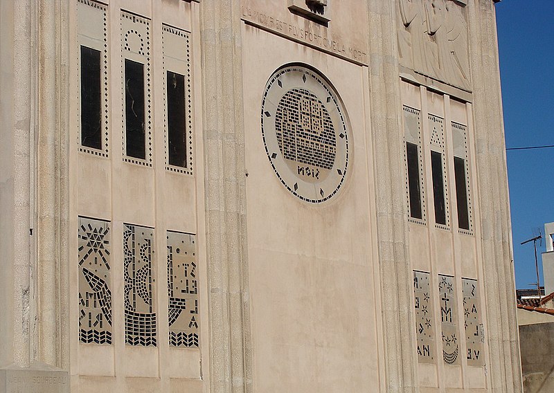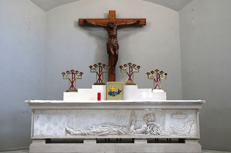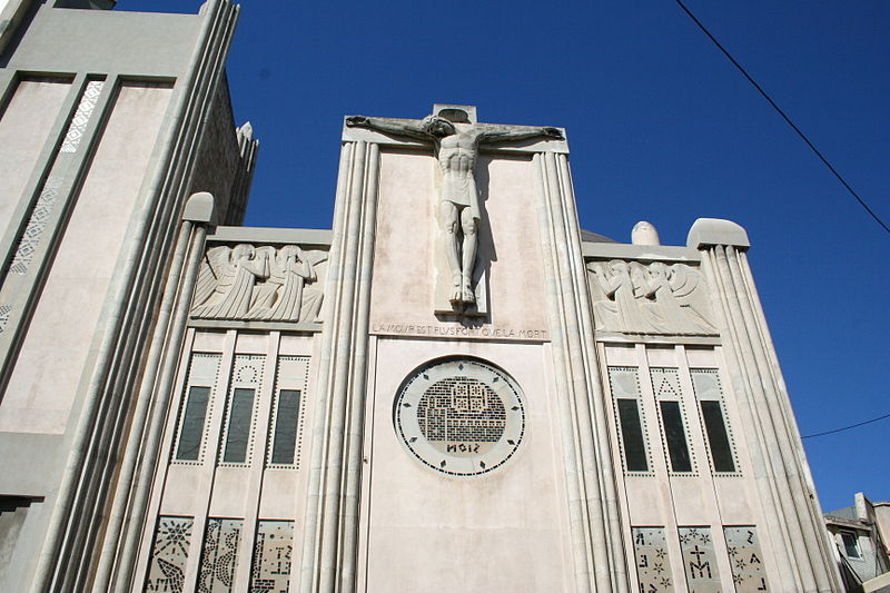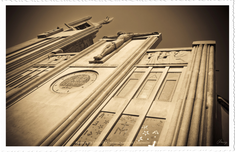 L'église Saint-Louis est située à Marseille, au cœur du quartier Saint-Louis, au n°20 chemin de Saint-Louis au Rove, dans le 15e arrondissement. Une première église paroissiale du XVIIIe siècle, d'environ 480 m² et capable d'accueillir 300 fidèles, se trouvait à l'emplacement de l'actuelle place Charles Susini. Après la Première Guerre mondiale, l'extension industrielle des quartiers nord rendit cette capacité insuffisante. L'évêque Mgr Dubourg, consacré en février 1929, nomma l'abbé Gabriel Pourtal pour relancer la vie paroissiale et lui confia la mission d'édifier une nouvelle église de 900 places. En 1932 une paroissienne offrit un terrain pentagonal de 1 100 m² entouré d'installations industrielles, et la construction fut confiée en décembre 1933 à l'architecte Jean-Louis Sourdeau. Le terrain irrégulier empêchant une disposition en croix latine, Sourdeau proposa un plan ambitieux qui exploita presque entièrement la parcelle. L'édifice fut inauguré en 1935 et a été inscrit dans son intégralité au titre des monuments historiques en 1989. L'église comprend une tour-clocher, un narthex, une nef surmontée d'une coupole et une ancienne chapelle dédiée à la Vierge, l'ensemble réalisé en béton armé. La coupole repose sur un tambour circulaire de 21 mètres de diamètre et d'environ 50 cm d'épaisseur, percé de quarante ouvertures circulaires pour l'éclairage. Dans ces ouvertures, des rosaces formées de lettres composent le début de l'hymne "gloria in excelsis deo et in terra pax". Les sculptures en béton de Carlo Sarrabezolles, obtenues par taille directe dans le béton frais, ornent l'extérieur : l'archange Gabriel de 9 mètres au sommet du clocher et un grand Christ entouré de deux anges sur la façade. L'entrée principale s'ouvre au pied d'une tour carrée qui porte le clocher, celui-ci étant décalé et orienté à 45° par rapport à la tour, et surmontée d'un chrisme ajouré au-dessus de la porte. La façade donnant sur le chemin de Saint-Louis au Rove est la seule à comporter un décor sculpté ; elle se divise en trois panneaux verticaux séparés par des pilastres. Le panneau central présente un Christ en croix en très haut relief de 6,5 m, sous lequel est inscrit "L'amour est plus fort que la mort", tandis que les panneaux latéraux associent bas-reliefs d'anges en partie haute et verrières en pavés de verre en partie basse. À l'intérieur, l'édifice, qui ne devait initialement comporter aucune statue, accueille aujourd'hui une Vierge à l'Enfant en plâtre dans le narthex, œuvre de François Carli réalisée pour la bénédiction du terrain le 15 octobre 1933, et une stèle en marbre blanc de sainte Fortunée par Louis Botinelly, figurée tenant la palme et accompagnée d'un lion endormi sur un fond mosaïqué d'or. Le chemin de croix est une frise peinte à la fresque par Jac Martin-Ferrières — fils d'Henri Martin — en un mètre de hauteur réparti sur cinq panneaux qui couvrent les quatorze stations; l'ensemble a été réalisé en un mois et demi et a fait l'objet d'une restauration en 2016 après des altérations causées par des infiltrations d'eau. Le narthex abrite six vitraux rectangulaires figurant Martin de Porrès, Jeanne d'Arc sur le bûcher, Vincent de Paul protégeant un enfant, saint Louis nimbé tenant la couronne d'épines, l'archange saint Michel et le bienheureux Antoine Chevrier. Dans l'église se trouvent également huit verrières en pavés de verre consacrées à l'histoire de saint Louis, réalisées selon la technique de la "mosaïque transparente" inventée par Jean Gaudin ; elles se répartissent en six rosaces de trois mètres de diamètre et deux panneaux rectangulaires de 2,10 m par 2,80 m, chacun divisé en trois parties par des meneaux en béton. Les deux panneaux de la partie basse de l'ancienne chapelle de la Vierge représentent la piété des marins avec un bateau et l'inscription "Stella Maris", et une dédicace à la Vierge avec un M surmonté d'une croix et l'inscription "Salve Regina". Les rosaces illustrent divers thèmes : la cité de Sion avec ses murailles et une croix de Jérusalem, la couronne d'épines, les bateaux des croisades, ainsi que des symboles de royauté (globe surmonté d'une croix, épée et sceptre entrecroisés sous une couronne), la ville de Tunis et la devise royale "Montjoie ! Sant Denis !". L'ensemble des décors sculptés et des verrières, de style épuré, participe de l'originalité architecturale et artistique de l'édifice.