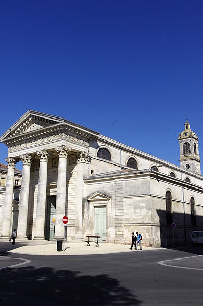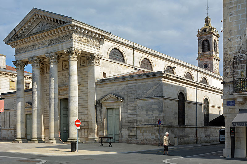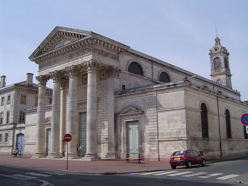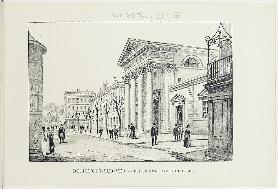 L'église Saint-Louis, située à Rochefort en Charente-Maritime, a été rebâtie entre 1836 et 1838 par l'architecte municipal Félix Garde sur l'emplacement d'une ancienne chapelle des Capucins dont seul le clocher de 1768 a été conservé. Le parti adopté est monumental : un portique à colonnes corinthiennes et fronton triangulaire ouvre sur la rue Audry-de-Puyravault et précède un plan basilical. L'édifice comprend trois vaisseaux et cinq travées voûtés en berceau, séparés par des arcades en plein cintre reposant sur des piliers carrés ornés de pilastres ioniques qui portent un entablement courant le long de la nef. Les grandes arcades communiquent avec des bas-côtés flanqués d'autant de chapelles que de travées, formant une série de chapelles latérales richement ornées. L'abside semi-circulaire abrite un maître-autel à baldaquin d'inspiration baroque qui intègre deux tableaux de 1837 ; l'ensemble de l'intérieur conserve un décor peint polychrome du milieu du XIXe siècle, les éléments les plus anciens se trouvant dans le chœur. Les sculptures des retables, du ciborium et de la chaire ont été réalisées par Philippe‑Auguste Godefroy et Joseph Pillet entre 1837 et 1865. En 1864, le mur de chevet a été reculé jusqu'au clocher par absorption de l'ancienne sacristie, et en 1865 l'orgue a été acquis auprès des établissements Merklin‑Schultz. La chapelle Saint‑Louis contient le tombeau de Michel Bégon, intendant de la marine et de la généralité de La Rochelle, dont l'action en faveur de l'embellissement de la ville est soulignée par l'épitaphe « Hanc nascentem urbem ligneam invenit, lapideam reliquit ». L'histoire paroissiale montre une ancienne implantation religieuse : la ville s'était d'abord organisée autour d'une église romane Notre‑Dame, tandis qu'une chapelle castrale dédiée à saint Charles, agrandie en 1679, fut érigée en paroisse sous le vocable de Saint‑Louis en 1686. Cet ancien sanctuaire, pourvu de deux autels latéraux et d'un clocher en 1728, fut démoli après la Révolution ; son clocher fut surélevé et transformé en « Tour des Signaux » pour la communication sémaphorique avec Fouras. Le titre paroissial fut transféré en 1791 à la chapelle des Capucins, qui avait reçu des aides municipales au XVIIIe siècle, dut être étayée en 1830 et fut rebâtie entre 1836 et 1838 en ne conservant que le clocher. L'église Saint‑Louis est l'un des rares témoins du néo‑classicisme en Charente‑Maritime et s'inspire, selon les références de l'époque, de modèles parisiens comme Notre‑Dame‑de‑Lorette et l'église de Saint‑Germain‑en‑Laye. Les bas‑côtés et les chapelles, notamment celles dédiées au Sacré‑Cœur, à saint Antoine de Padoue et à saint Joseph, présentent un riche décor sculpté et peint. L'édifice est inscrit à l'inventaire supplémentaire des monuments historiques depuis le 22 juin 1987.
