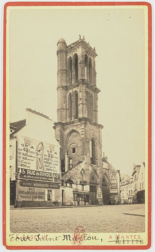 La fondation de la paroisse Saint-Maclou est inconnue ; selon Bruno Dufaÿ elle pourrait remonter au XIe siècle, le culte de saint Malo ne se développant dans la région qu’après le transfert de ses reliques à Paris en 965. Les chroniques indiquent que l’église fut édifiée sur l’emplacement de l’hôtel-Dieu après le sac de la ville par Guillaume le Conquérant en 1087; le cimetière fut transféré et un marché installé à sa place. En 1205 la création d’étaux sur la place de Saint-Maclou fut autorisée. En 1403 l’édifice fut « toisé » et la tour mesurait 70 toises. Des orgues y furent posées en 1583 et des travaux de couverture et charpente eurent lieu en 1591. Au XVIIe siècle l’église subit de graves dommages : en 1612 la foudre frappa la tour, et à la fin du siècle le chœur et les bas-côtés s’effondrèrent ; le chœur endommagé fut reconstruit à partir de 1693. Le chœur primitif comportait un petit clocher en forme de lanterne, accessible par un escalier en vis aménagé dans un pilier, visible sur un dessin de la ville de 1610. En 1705 le beffroi et la chapelle de la Charité furent rétablis, et en 1713 le « retour » du chœur ainsi que ses boiseries et sculptures furent achevés. Déjà au milieu du XVIIIe siècle l’église était en mauvais état : des travaux furent engagés après 1751, une chapelle provisoire aménagée et, en 1765, des grilles et une porte en fer forgé furent posées au chœur. Le culte y fut supprimé en juin 1791. En 1793 il fut décidé de détruire le chevet pour élargir la place du Marché, réduite par le percement de la rue Royale. L’église fut vendue en l’an VII à Philibert Alexandre et à Simon le Vieil (ou le Veül); ces acquéreurs souhaitaient la transformer en halle aux grains et marché aux veaux, mais une expertise jugea le lieu inadapté et la démolition suivit peu après. Le cadastre de 1810 montre que seule la tour subsistait encore ; la rue des Marmousets n’avait pas été élargie. En février 1827 les matériaux de démolition furent adjugés, la tour ayant été exceptée comme « monument d’art remarquable ». L’État remit alors la tour à la fabrique de Notre-Dame ; la fabrique la donna en 1818 à la ville, qui l’afferma puis l’affecta à un service public en 1855. De nombreuses restaurations de la tour se succédèrent au XIXe siècle (1810, 1819 pour maçonnerie et couverture, 1833 par l’architecte J. Postel, 1857) et une campagne importante eut lieu en 1900 sous la direction de l’architecte M. Cauzard, comprenant notamment la restauration d’une voûte d’arêtes et des travaux de dallage en ciment de Portland. La tour fut ébranlée par les bombardements de 1944 et fit l’objet de restaurations jusque dans les années 1980, période à laquelle elle fut nettoyée des dépôts de pollution. Aujourd’hui subsistent la tour du XVIe siècle, un pan de mur roman de deux arcades avec les piliers du bas-côté correspondants, des éléments d’origine dans une façade remaniée et la crypte de l’église primitive. L’édifice primitif était roman ; la seconde église, dans son état post‑XVIe siècle, comportait une nef simple de cinq travées flanquée de bas‑côtés, un chœur entouré de chapelles probablement rayonnantes, un transept et une tour placée sur le bas‑côté sud au niveau de la seconde travée. L’église Saint-Maclou, située dans les Yvelines, était l’une des paroisses de Mantes, dédiée à saint Maclou, aux côtés de Sainte-Croix (Notre-Dame) et de Saint-Pierre des faubourgs. La tour Saint-Maclou est classée au titre des monuments historiques depuis le 18 mai 1908.