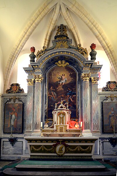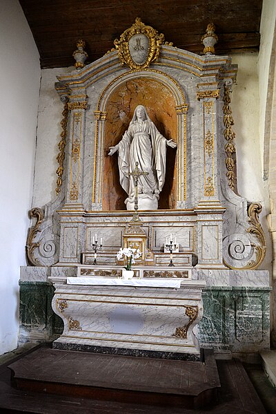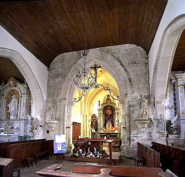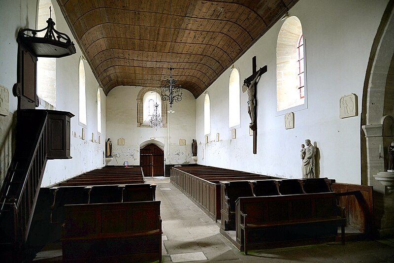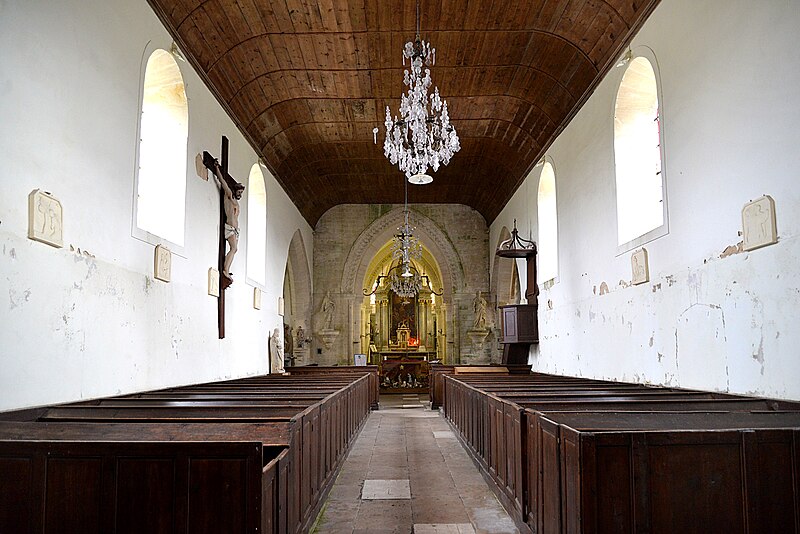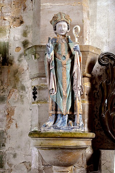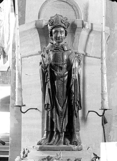 L'église conserve une représentation sculptée rare de la Cène, qualifiée de assez grossière, ainsi que deux reliefs en façade représentant saint Pierre, assis et muni de clefs, et saint Manvieu en évêque ; Arcisse de Caumont décrit ces œuvres comme « assez barbares ». Parmi les objets classés figurent une statue de saint Manvieu en évêque que Caumont date du XVIe siècle mais qui est également attribuée au XVe siècle ; cette statue a été volée puis retrouvée la même année, en 1976. On note aussi une statue de Léonard de Noblat et, d'après Caumont, deux statues en bois datées des XVIIe–XVIIIe siècles.