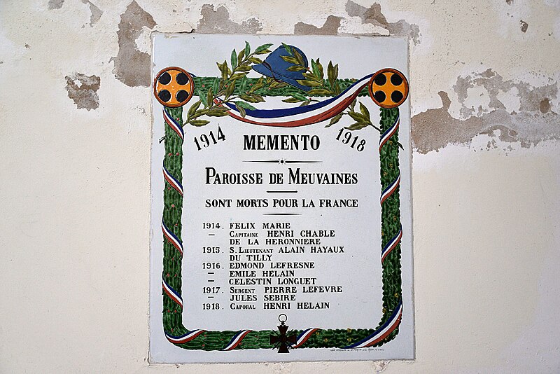 L'église Saint-Manvieu de Meuvaines est située dans la commune de Meuvaines, dans le département du Calvados. Elle dépendait de l'abbaye Saint-Julien de Tours, sans doute dès le XIe siècle et jusqu'à la Révolution ; à partir de 1740, l'évêque de Bayeux en possède le patronage. La nef et la façade ont été élevées vers 1100, le chœur date du milieu du XIIe siècle et deux chapelles latérales, formant le transept, ont été ajoutées aux XIVe ou XVe siècles. Le transept et le haut de la tour sont de style gothique ; un cadran solaire a été installé au XVe siècle et le clocher a peut‑être été reconstruit au XVIIe siècle. Une restauration générale au XVIIIe siècle a notamment vu la pose du lambris de couvrement de la nef portant la date 1761, la mise en place d'un pavage, le percement de nouvelles fenêtres dans la nef et l'élargissement des baies latérales du chœur, l'ouverture d'une nouvelle porte au sud de la nef, ainsi que l'édification de la sacristie et de la croix de cimetière. La flèche a été refaite au début du XIXe siècle et le chœur porte la date de restauration de 1867. L'édifice a été inscrit au titre des monuments historiques le 21 mai 1927.