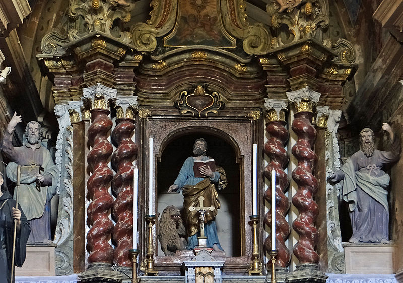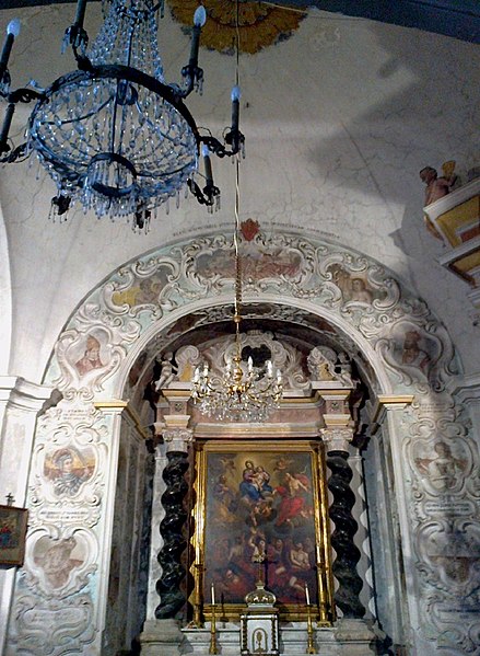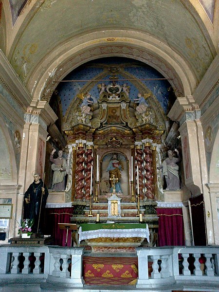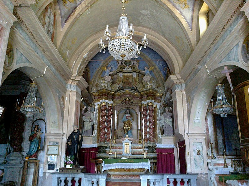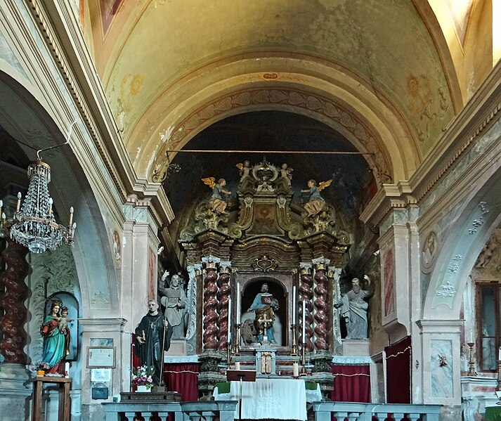 L'église compte six retables principaux : le retable du maître‑autel, daté de 1728 et dédié à saint Marc — qui y figure devant le lion, flanqué des statues de saint Pierre et saint Paul ; le retable de la chapelle du Rosaire, avec un tableau sur l'Institution et les mystères du Rosaire daté de 1715 ; le retable de la chapelle des Âmes du Purgatoire, qui comporte une danse macabre de la fin du XVIIe siècle et un tableau peint vers 1720 représentant saint Roch et saint Jean‑Baptiste intercédant auprès de la Vierge à l'Enfant ; ainsi que des retables consacrés à Notre‑Dame de Lourdes, à saint Joseph (avec une statue de l'Enfant) et à saint Maur, ainsi qu'à Notre‑Dame du Mont‑Carmel. Ces éléments décoratifs donnent à l'édifice une cohérence stylistique marquée par le baroque.