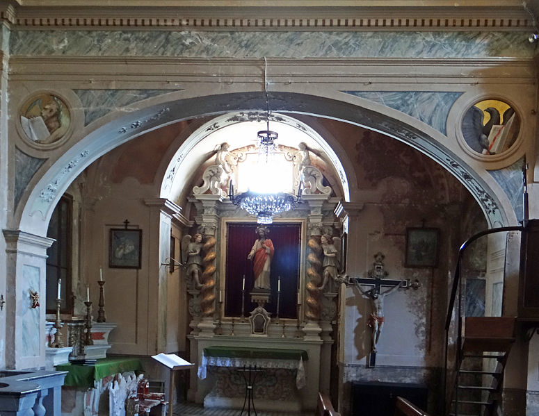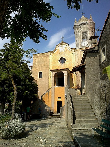 La façade présente les caractères du baroque ligurien : un fronton curviligne, un oculus et un double escalier à révolution qui mène au porche d'entrée. Le clocher se compose d'un dôme central entouré de quatre clochetons. L'intérieur est décoré en trompe‑l'œil et en faux marbre ; les autels et retables sont ornés de stucs polychromes et de colonnes torses exécutés par des artistes ligures, conférant une unité décorative à l'ensemble.