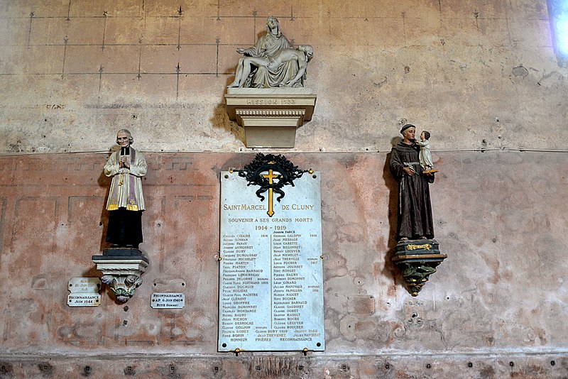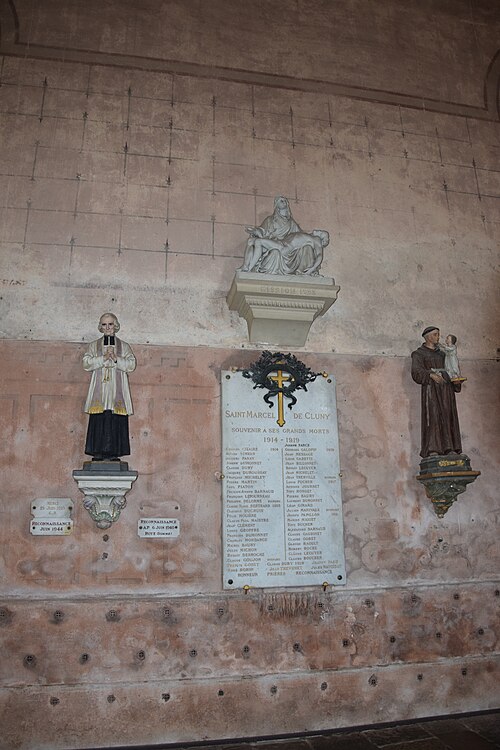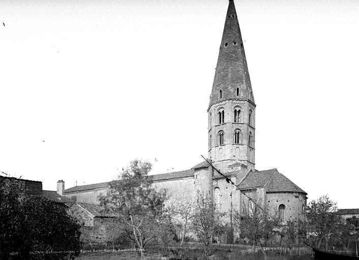 L'église Saint-Marcel, église catholique située à Cluny en Saône-et-Loire, remplace l'ancienne chapelle dédiée à saint Odon. Le site a été reconstruit par l'abbé Hugues III vers 1159. Elle présente une nef unique charpentée se prolongeant par un chœur placé sous le clocher et une abside hémicirculaire voûtée en cul-de-four. Le clocher prend la forme d'une tour octogonale ajourée à trois étages, surmontée, probablement au XVIe siècle, d'une flèche en briques. Au XIXe siècle, notamment lors des travaux de 1872-1876 dirigés par l'architecte départemental Giroud, l'édifice a pris son aspect actuel. Ces interventions ont entraîné la création d'un plafond et une vaste campagne de décoration intérieure, peintures murales et vitraux. Cette décoration constitue un écrin pour plusieurs objets remarquables, parmi lesquels figurent les fonts baptismaux et l'autel provenant de l'abbaye de Cluny. L'édifice a été classé au titre des monuments historiques en 1912, inscrit en 2016 et classé en 2017. L'église se singularise par son puissant clocher roman ajouré de forme octogonale. Parmi les œuvres conservées, on compte un tableau du XVIIe siècle représentant Saint Abbé de Cluny faisant l'aumône. Pour compléter la documentation, on peut consulter la liste des monuments historiques de Saône-et-Loire et les portails spécialisés (Portail des monuments historiques français, portail de Saône-et-Loire, portail de l'architecture chrétienne).