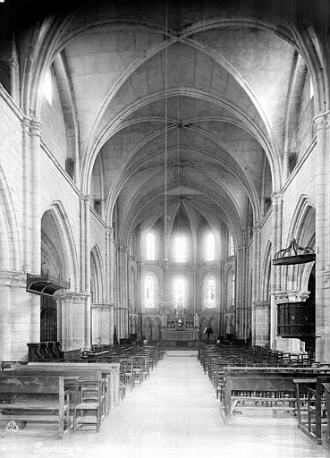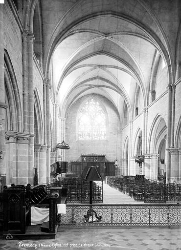 À l'intérieur, le chevet, construit en premier, offre une élévation à deux étages avec arcatures et colonnettes qui reçoivent les ogives de la voûte ; chapiteaux sculptés, ogives à huit nervures et une clef ornée de feuillages soulignent la lisibilité de l'ensemble. La nef garde aussi une ordonnance à deux niveaux : grandes arcades et fenêtres hautes, mais les supports et profils varient selon les campagnes, révélant des phases de construction distinctes entre le chevet et les travées occidentales. Les piliers cylindriques sont cantonnés de colonnettes engagées et les voûtes d'ogives, parfois en matériau d'appareil moyen ou de petit appareil, présentent des profils divers. Les bas-côtés, voûtés de croisées d'ogives plus simples, reprennent la même logique constructive et la petite chapelle sud, ajoutée au XVIe siècle, s'ouvre par un arc en tiers-point orné de culs-de-lampe sculptés et d'un écusson aux armes de Jacques d'Albret, évêque de Nevers. L'ensemble donne une impression d'ampleur et de robustesse dominée par une sobriété décorative.