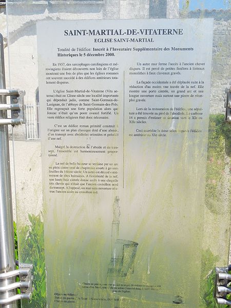 L'église Saint-Martial, située à Saint-Martial-de-Vitaterne (Charente-Maritime, Nouvelle-Aquitaine), dépendait du prieuré de l'abbaye Saint-Martial de Limoges. Elle conserve l'essentiel des caractéristiques de la première période de l'art roman malgré des altérations causées par des incendies au milieu du XIVe siècle puis vers 1582, pendant les guerres de Religion. Des contreforts ont été ajoutés à l'époque gothique et des travaux ont été réalisés au XVIIIe siècle. La clôture du chœur, une balustrade en pierre, est contemporaine. L'église est inscrite au titre des monuments historiques par arrêté du 5 décembre 2000. Pour en savoir plus, on peut consulter la liste des monuments historiques de la Charente-Maritime, les inventaires des églises du département et des ressources en ligne telles que Mérimée, Clochers de France, l'Observatoire du patrimoine religieux et les portails consacrés au catholicisme, à l'architecture chrétienne et à la Charente-Maritime.