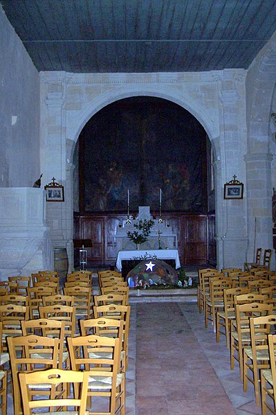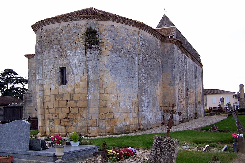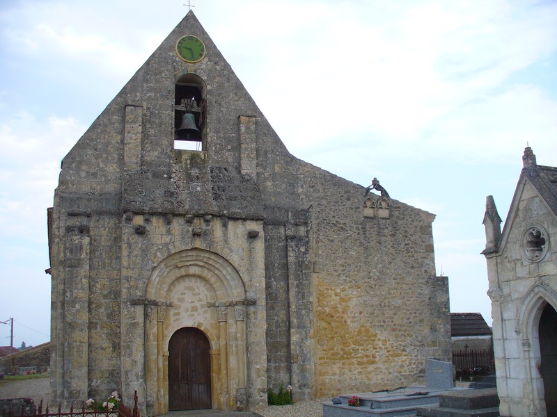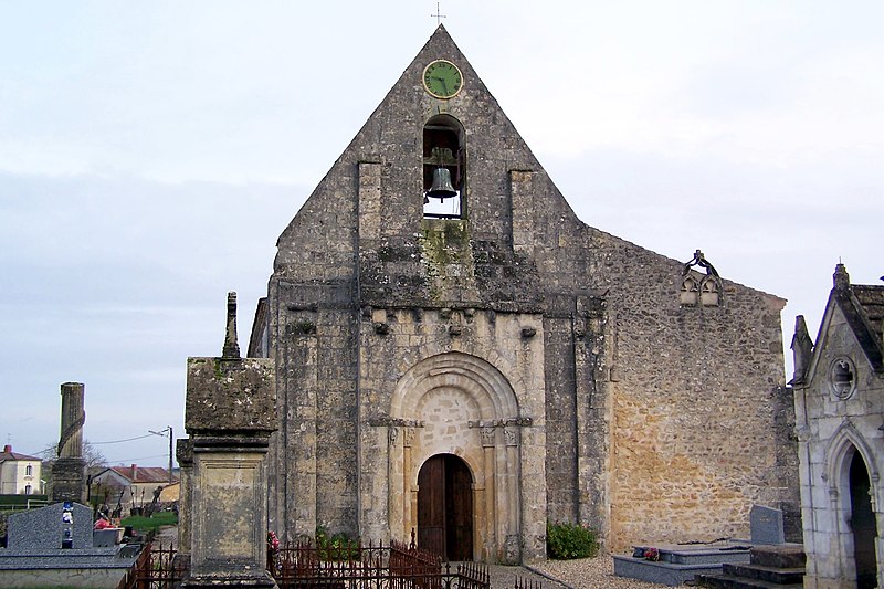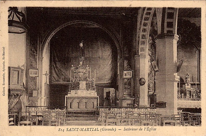 L'église de Saint-Martial, située au centre du bourg de Saint-Martial en Gironde, se trouve en face de la mairie, au croisement des routes départementales D123 et D227. L'édifice d'origine, attribué au XIe siècle, comportait une nef unique appareillée en petits moellons ; certaines sources indiquent que la nef, l'abside et la porte sont romanes, tandis que d'autres précisent que la façade est la seule partie romane conservée. L'abside a été rehaussée au XIVe siècle et renferme une piscine datée de la même période. Au XVIIe siècle, le mur gouttereau sud a été supprimé pour ajouter un collatéral gothique sur le côté sud ; un bas-côté y a également été ajouté vers 1500 selon d'autres mentions. Le clocher-pignon abrite une cloche de 1718 classée au titre des monuments historiques, et l'église a été inscrite dans son ensemble au titre des monuments historiques par arrêté du 21 décembre 1925. L'intérieur conserve un retable en bois du XVIIIe siècle classé au titre des monuments historiques, ainsi qu'une crédence en pierre dans le mur de la sacristie, qui évoque par sa forme un placard.