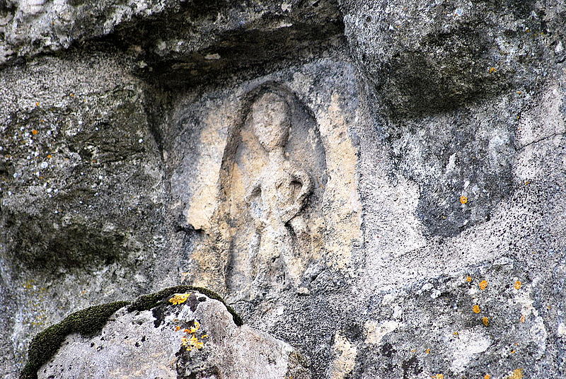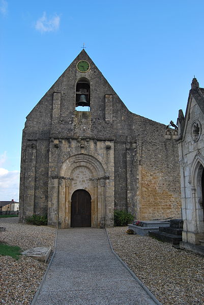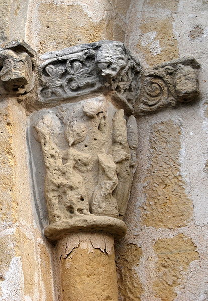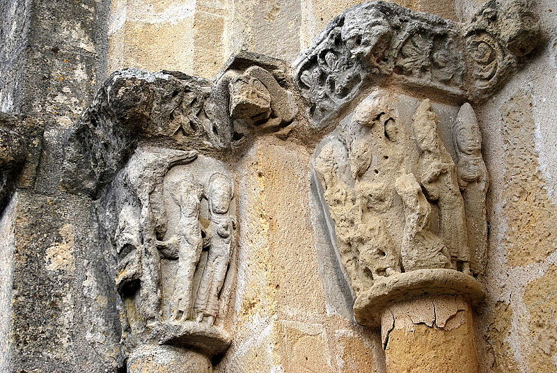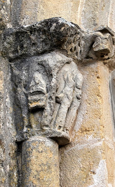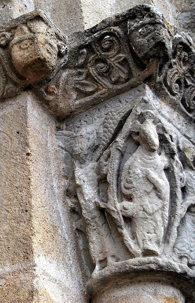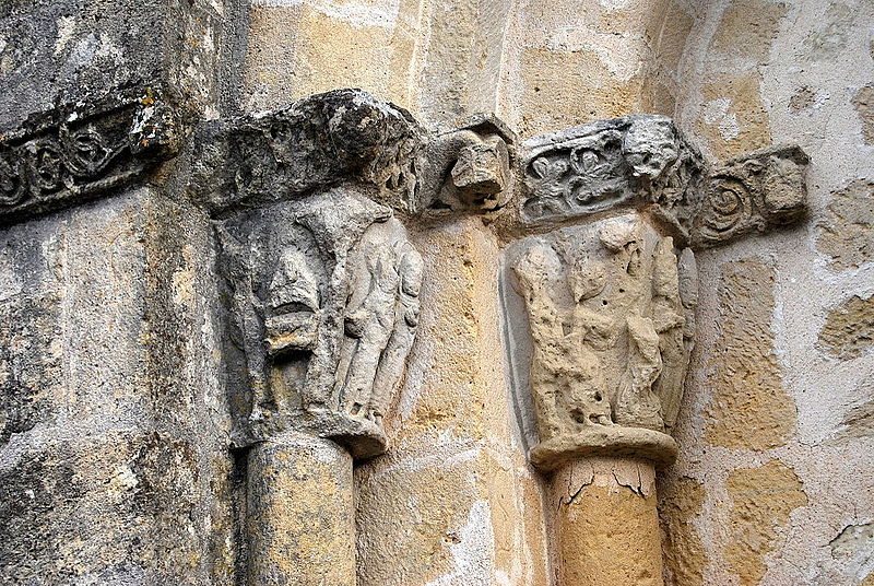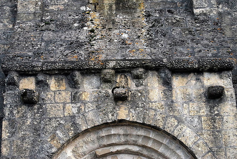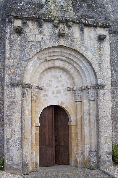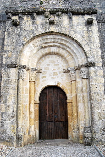 La façade ouest présente un portail caractéristique : une porte haute et étroite s'ouvre sous quatre arcs en retrait dont les voussures retombent sur quatre piédroits et quatre colonnes, chacune couronnée d'un chapiteau historié. La corniche, ornée d'un semis d'étoiles, repose sur huit modillons informes ; entre les deux consoles médianes se lit une métope du XIe siècle représentant une femme allaitant deux serpents, symbole traditionnel de la luxure. Les quatre chapiteaux du portail figurent des scènes de la vie du Christ : l'Adoration des mages, les Myrrhophores au tombeau, le Baptême de Jésus et le Christ en gloire.