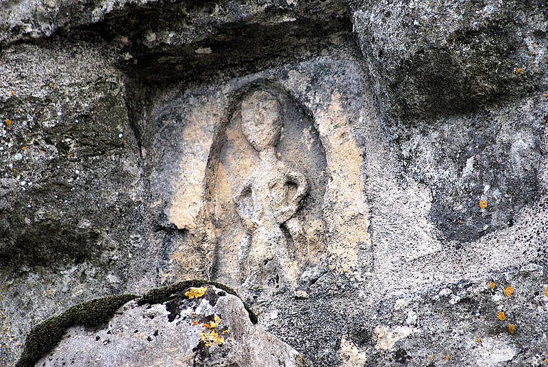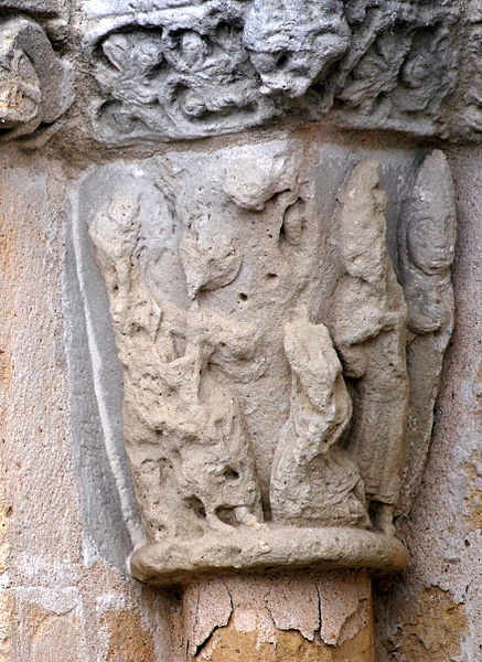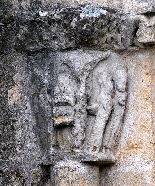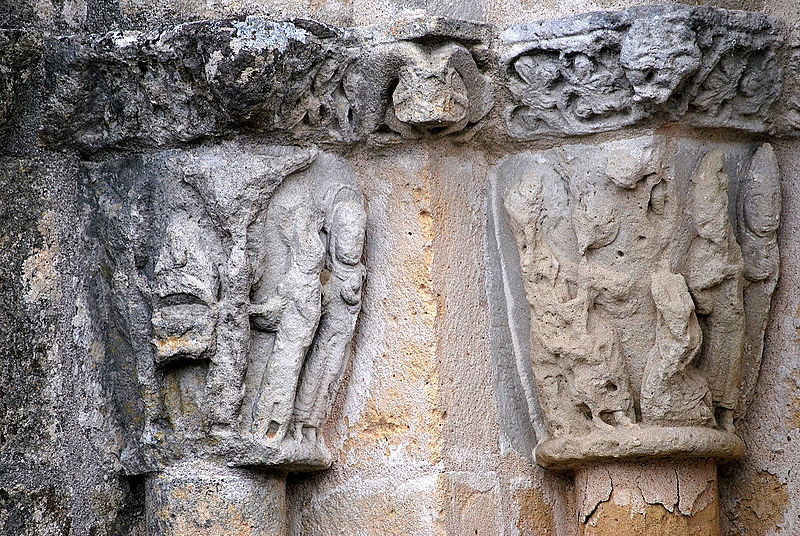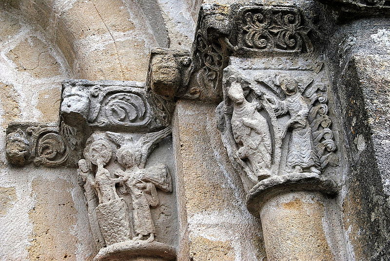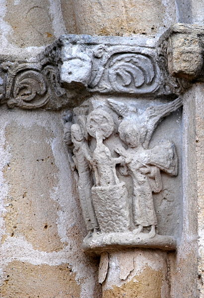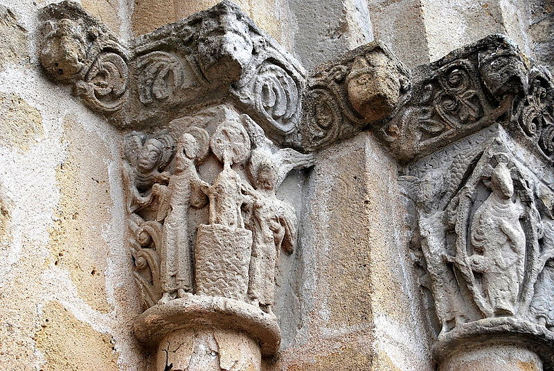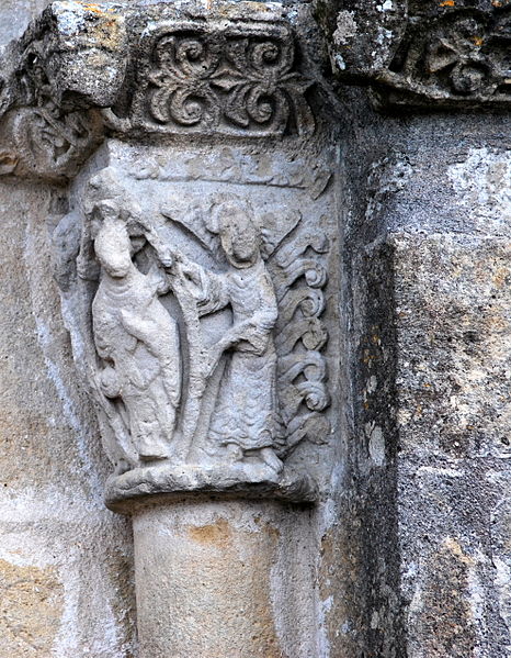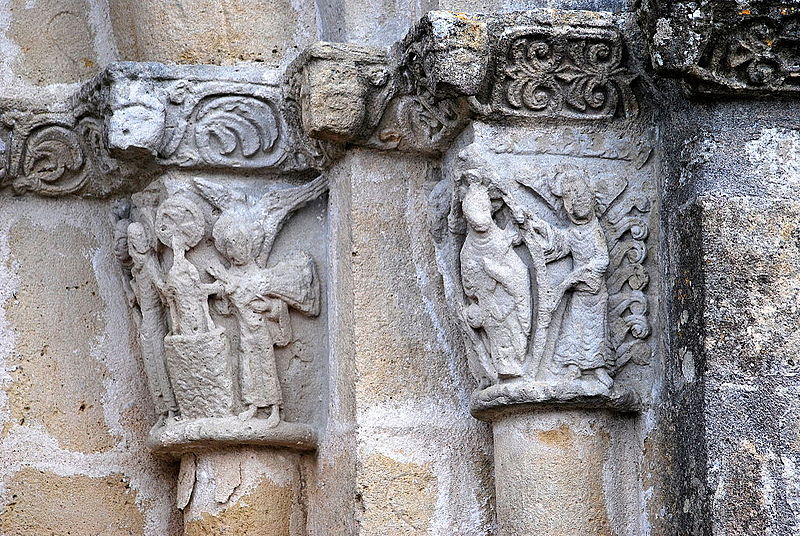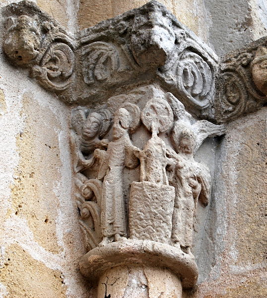 L'Adoration des mages montre, malgré l'érosion de la corbeille, Marie assise tenant l'enfant entourée des trois Rois portant encens et myrrhe ; les mages portent de longues tuniques et une tiare conique pour évoquer l'Orient. La frise du tailloir, bien conservée, alterne animaux, masques cracheurs de rinceaux et feuilles palmées ; le style est attribué à la seconde moitié du XIIe siècle. La scène des Myrrhophores s'inspire de l'évangile selon Luc et représente deux anges et un sépulcre vide ; la face externe, mieux conservée, montre deux saintes femmes nimbées, élancées, vêtues de robes plissées et portant des récipients d'aromates. Le Baptême de Jésus est rendu par une corbeille en assez bon état où l'on distingue Jésus debout dans le Jourdain, soutenu par un ange et Jean-Baptiste, tandis qu'une figure angélique symbolisant l'Esprit descend du ciel et des flammes spiralées marquent l'ouverture des cieux. Le Christ en gloire occupe la quatrième corbeille : assis en majesté dans une mandorle étroite, il est entouré d'anges et présenté en posture de jugement, tenant un « Livre de Vie » sous un petit bandeau d'étoiles à six rais.