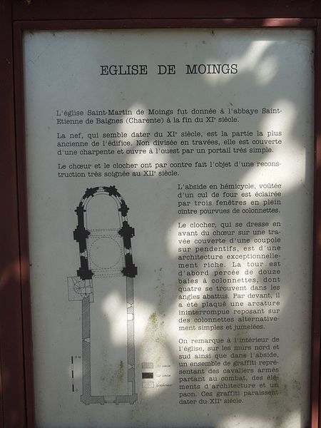 L'église Saint-Martin, de style roman saintongeais, est située à Moings (Saintonge) dans le département de la Charente-Maritime, en Nouvelle-Aquitaine. Édifiée au XIIe siècle, elle se compose d'une nef et d'un chœur terminé par une abside circulaire. La première travée du chœur est couverte par une coupole en pierre sur pendentifs et, au-dessus, s'élève un clocher au plan carré, légèrement arrondi aux angles à l'étage du beffroi et décoré d'une suite d'arcades en avancée. L'abside, voûtée en cul-de-four, comporte cinq arcatures retombant sur des colonnes aux chapiteaux sculptés. Les parties occidentales de l'édifice conservent leurs dispositions du XIIe siècle. L'église Saint-Martin est classée au titre des monuments historiques depuis le 17 août 1945.