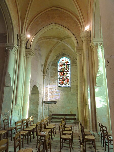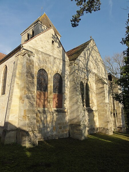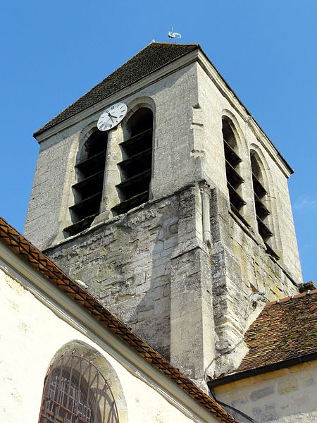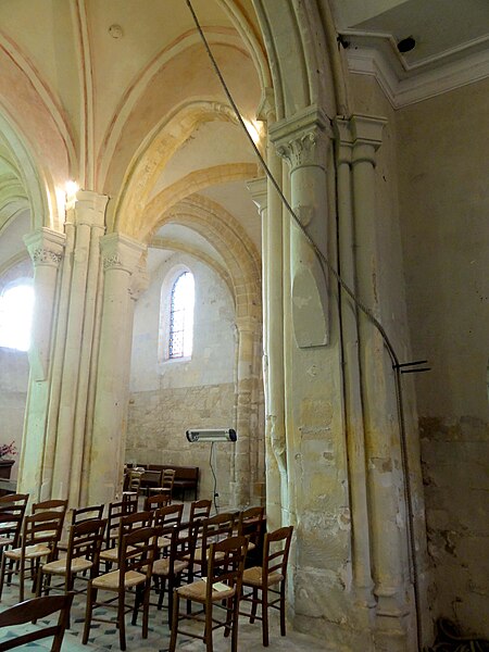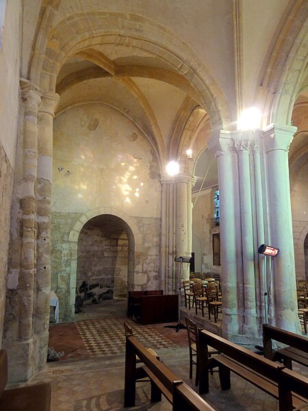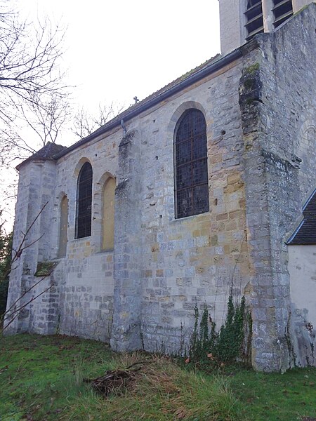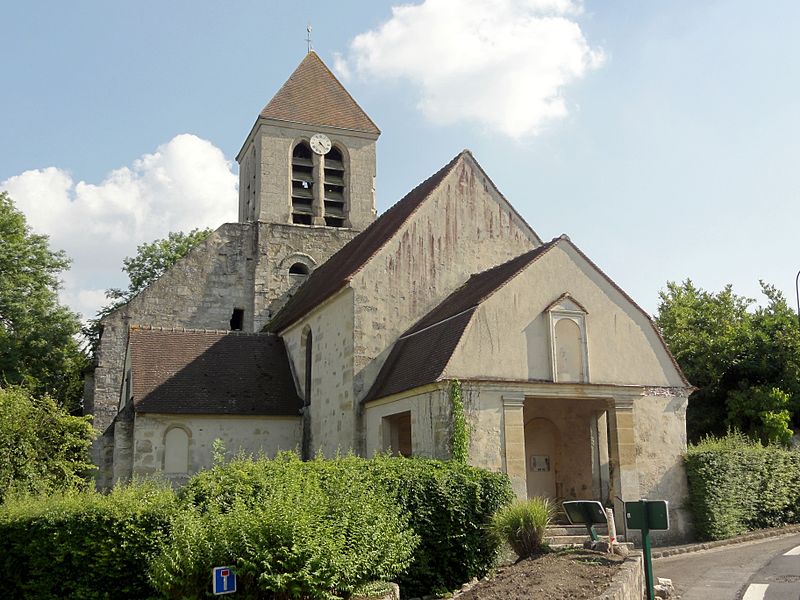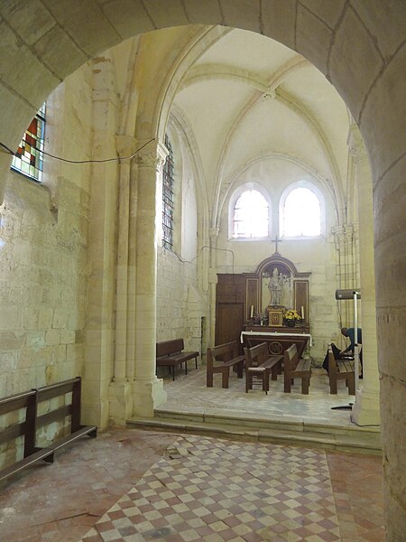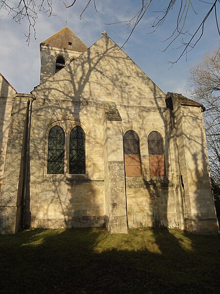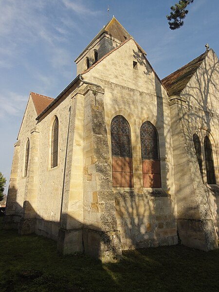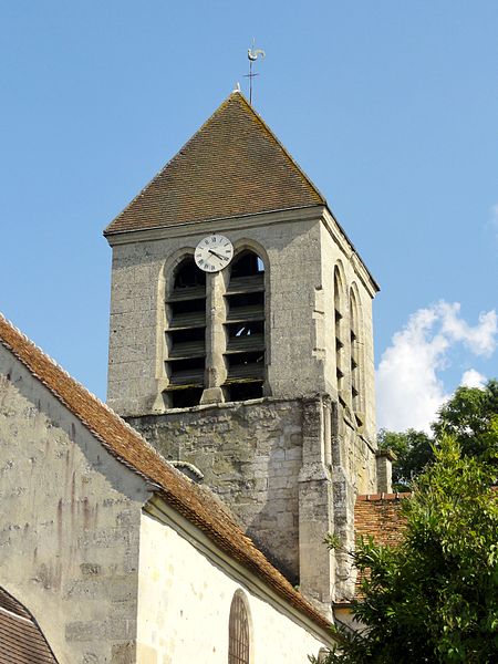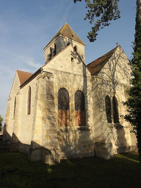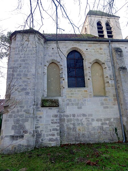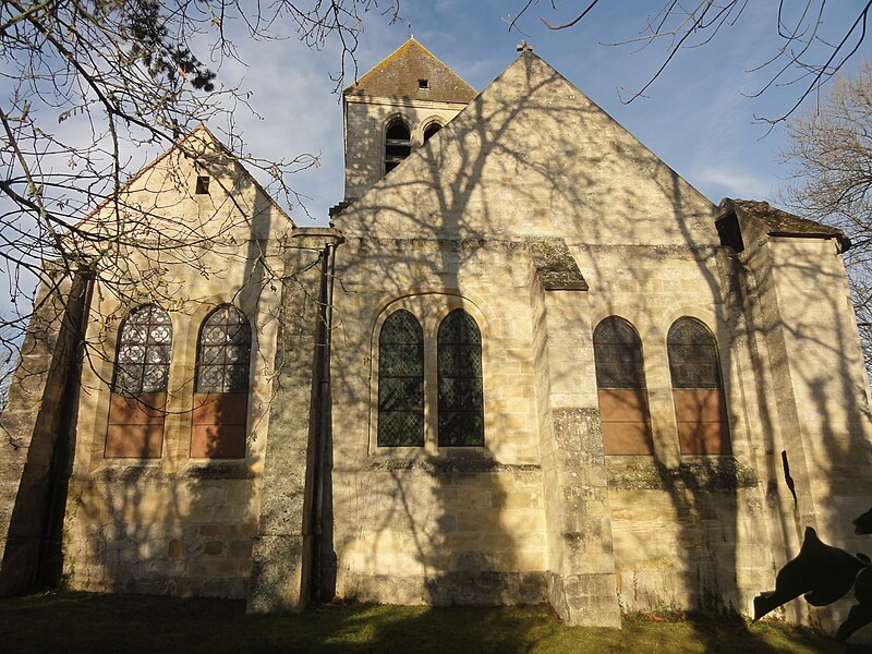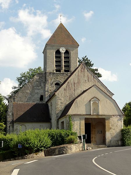 L'église Saint-Martin d'Ableiges (Val-d'Oise) est une paroissiale catholique qui succède probablement à un édifice mentionné en 1071. Son chœur-halle rectangulaire comprend six travées réparties sur trois vaisseaux et se termine par un chevet plat. L'architecture intérieure révèle trois campagnes de construction, discernables par la sculpture des chapiteaux et les profils des voûtes. La partie la plus ancienne est le vaisseau central avec la base du clocher, de style roman au niveau des arcs-doubleaux, et peut remonter aux années 1160-1170, tandis que l'intérieur évoque la première période gothique. Le collatéral sud est légèrement postérieur, et le collatéral nord semble dater des années 1220, comme l'indiquent une clé de voûte « tournante », un arc formeret et certains chapiteaux. Des éléments, tels que des colonnettes sans fonction de part et d'autre de l'arc triomphal et une arcade occidentale bouchée, suggèrent l'existence possible d'une nef antérieure partiellement voûtée d'ogives. La nef actuelle et le porche, dépourvus de caractère, datent probablement du XVIIIe siècle et ont été exclus du classement aux monuments historiques par arrêté du 23 décembre 1931. L'édifice est situé dans la vallée de la Viosne, au sud du village d'Ableiges, face à l'ancienne ferme seigneuriale, et s'inscrit dans un terrain en partie boisé correspondant à l'ancien cimetière ; l'accès permet de faire le tour de l'édifice sauf sur une portion étroite au sud. Il convient de ne pas confondre cette église avec celle de La Villeneuve-Saint-Martin, dédiée à Notre-Dame-de-l'Assomption. Selon les sources, la cure fut concédée à perpétuité à l'abbaye de Saint-Denis en 1071 ; les dîmes furent données en 1138 et la possession confirmée au cours du XIIe siècle puis par une bulle du pape Innocent III datée du 14 mai 1198. Sous l'Ancien Régime, Ableiges dépendait du doyenné de Meulan, de l'archidiaconé du Vexin français et de l'archidiocèse de Rouen. Les parties orientales ont été édifiées en trois campagnes : d'abord le vaisseau central avec ses doubleaux autour du clocher, puis le croisillon et la chapelle latérale sud, enfin le croisillon et la chapelle latérale nord. L'étage de beffroi du clocher fut refait à la période flamboyante, vraisemblablement entre 1480 et 1540, et d'autres remaniements ultérieurs ont affecté baies, supports et clés de voûte. Depuis la Révolution, la paroisse a été rattachée au diocèse de Versailles puis, après la création du Val-d'Oise, au diocèse de Pontoise en 1966 ; l'église dépend aujourd'hui de la paroisse Avernes et Marines où les messes dominicales y sont célébrées environ quatre fois par an à 9 h 30. Le plan de l'église est simple et presque symétrique : un porche, une nef plafonnée sans travées apparentes, un chœur de deux travées dont la première sert de base au clocher, deux croisillons et deux chapelles latérales alignées sur le chevet. La sacristie occupe l'angle entre la nef et le croisillon nord et des passages berrichons voûtés en berceau relient la nef aux croisillons. Les six travées orientales sont voûtées d'ogives et forment un chœur-halle où la hauteur des collatéraux dépasse à peine celle du vaisseau central. Le clocher est coiffé d'une pyramide en charpente couverte d'ardoise ; son premier étage roman, bâti en moyen appareil, contraste avec un second étage de pierre de taille attribué au style flamboyant. Dans le chœur, l'organisation des supports est particulière : les formerets entourent les travées et les ogives retombent sur des faisceaux de trois colonnettes, les chapiteaux des ogives, plus volumineux, déterminant l'orientation des faisceaux. La clé de voûte de la croisée du transept est un disque sculpté de feuilles d'acanthe percé en son centre où apparaît un fruit d'arum ; la clé de la deuxième travée a été refaite à la Renaissance ou à une période postérieure, pendant la seconde moitié du XVIe ou au XVIIe siècle, et présente des cercles concentriques. Les chapiteaux du vaisseau central, de belle facture, s'inspirent de la flore des milieux humides ; beaucoup de chapiteaux au sud ont été mutilés ou refaits, certains remplacements paraissant sommaires et parfois recouverts de plâtre. Le croisillon nord et sa chapelle montrent des ogives au profil d'un tore en forme d'amande, des chapiteaux sculptés de crochets et de feuilles polylobées et des ouvertures qui comprennent un triplet de lancettes dont les latérales sont partiellement bouchées. Le croisillon et la chapelle sud, construits après le vaisseau central, présentent des dispositions analogues, des clés de voûte en rosace de feuillages et des traces d'affaissement ayant motivé des réfections locales. Extérieurement, le porche et la nef sont en moellons enduits ; le porche, moins élevé et discrètement décoré, comporte un linteau encadré par pilastres à chapiteaux doriques et une niche abritant une petite Vierge à l'Enfant. Le clocher, dont le premier étage roman est partiellement masqué par les combles, conserve des éléments intéressants comme des cordons sculptés de fleurs de violette et des colonnettes d'angle dont les chapiteaux témoignent d'évolutions postromanes. Le chevet plat, sobre mais équilibré, se distingue par des groupes de lancettes géminées et par la régularité des façonnements malgré de nombreux remaniements et des contreforts refaits à l'époque moderne. Parmi le mobilier, la Vierge à l'Enfant de la niche du retable de la chapelle nord, en pierre et haute de 123 cm, est classée au titre des objets ; sa datation est assignée au XIVe siècle et elle est recouverte d'un badigeon blanc du XIXe siècle avec des rehauts dorés. Le retable baroque du mur sud de la nef, en bois sculpté peint et partiellement doré, comporte un panneau central avec un tableau représentant la Charité de saint Martin, probable