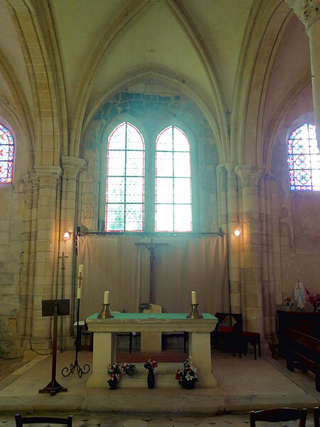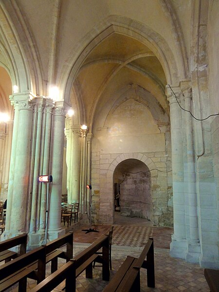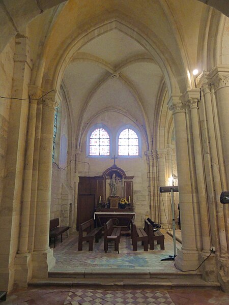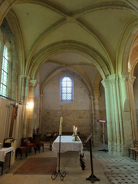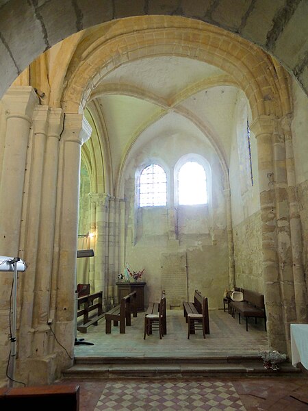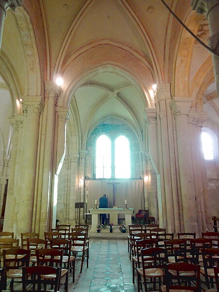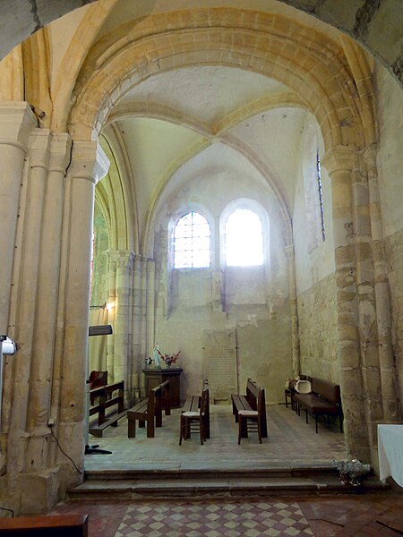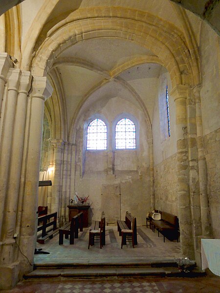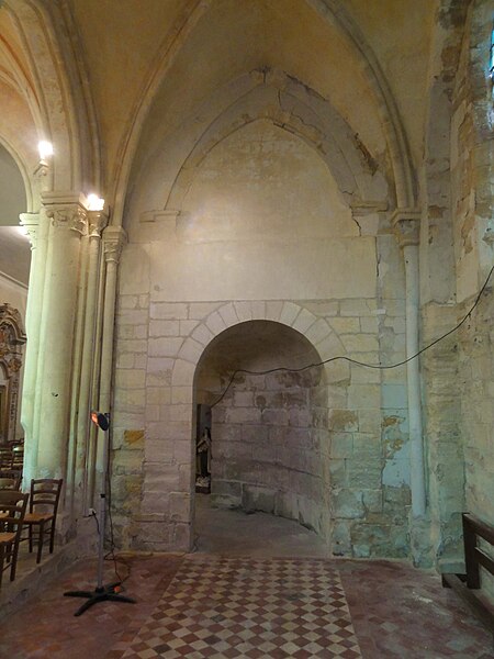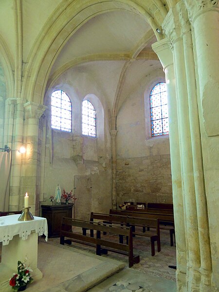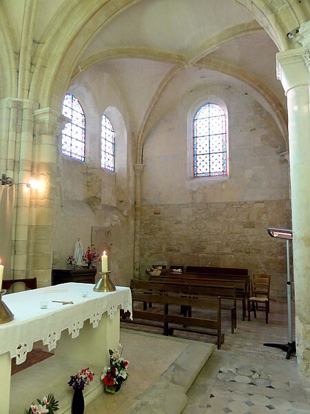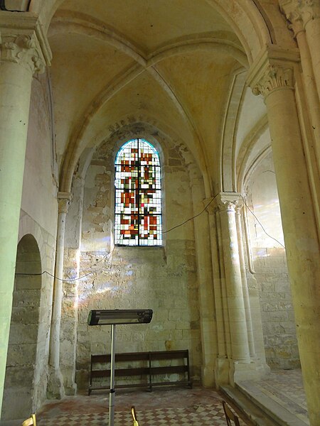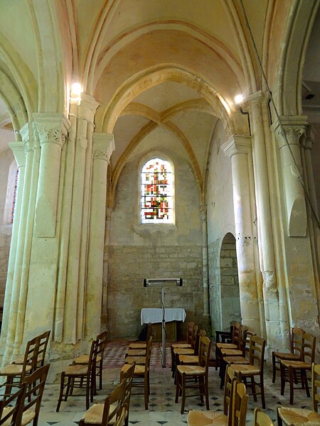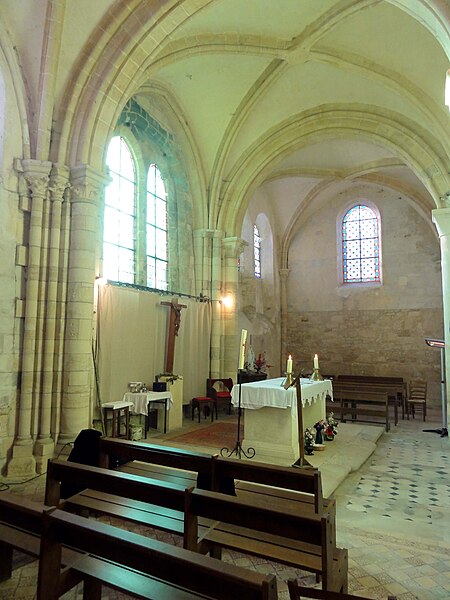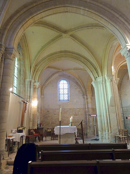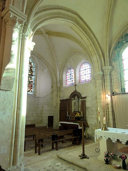 L'église Saint-Martin d'Ableiges (Val-d'Oise) est une paroissiale catholique qui succède probablement à un édifice mentionné en 1071. Son chœur-halle rectangulaire comprend six travées réparties sur trois vaisseaux et se termine par un chevet plat. L'architecture intérieure révèle trois campagnes de construction, discernables par la sculpture des chapiteaux et les profils des voûtes. La partie la plus ancienne est le vaisseau central avec la base du clocher, de style roman au niveau des arcs-doubleaux, et peut remonter aux années 1160-1170, tandis que l'intérieur évoque la première période gothique. Le collatéral sud est légèrement postérieur, et le collatéral nord semble dater des années 1220, comme l'indiquent une clé de voûte « tournante », un arc formeret et certains chapiteaux. Des éléments, tels que des colonnettes sans fonction de part et d'autre de l'arc triomphal et une arcade occidentale bouchée, suggèrent l'existence possible d'une nef antérieure partiellement voûtée d'ogives. La nef actuelle et le porche, dépourvus de caractère, datent probablement du XVIIIe siècle et ont été exclus du classement aux monuments historiques par arrêté du 23 décembre 1931. L'édifice est situé dans la vallée de la Viosne, au sud du village d'Ableiges, face à l'ancienne ferme seigneuriale, et s'inscrit dans un terrain en partie boisé correspondant à l'ancien cimetière ; l'accès permet de faire le tour de l'édifice sauf sur une portion étroite au sud. Il convient de ne pas confondre cette église avec celle de La Villeneuve-Saint-Martin, dédiée à Notre-Dame-de-l'Assomption. Selon les sources, la cure fut concédée à perpétuité à l'abbaye de Saint-Denis en 1071 ; les dîmes furent données en 1138 et la possession confirmée au cours du XIIe siècle puis par une bulle du pape Innocent III datée du 14 mai 1198. Sous l'Ancien Régime, Ableiges dépendait du doyenné de Meulan, de l'archidiaconé du Vexin français et de l'archidiocèse de Rouen. Les parties orientales ont été édifiées en trois campagnes : d'abord le vaisseau central avec ses doubleaux autour du clocher, puis le croisillon et la chapelle latérale sud, enfin le croisillon et la chapelle latérale nord. L'étage de beffroi du clocher fut refait à la période flamboyante, vraisemblablement entre 1480 et 1540, et d'autres remaniements ultérieurs ont affecté baies, supports et clés de voûte. Depuis la Révolution, la paroisse a été rattachée au diocèse de Versailles puis, après la création du Val-d'Oise, au diocèse de Pontoise en 1966 ; l'église dépend aujourd'hui de la paroisse Avernes et Marines où les messes dominicales y sont célébrées environ quatre fois par an à 9 h 30. Le plan de l'église est simple et presque symétrique : un porche, une nef plafonnée sans travées apparentes, un chœur de deux travées dont la première sert de base au clocher, deux croisillons et deux chapelles latérales alignées sur le chevet. La sacristie occupe l'angle entre la nef et le croisillon nord et des passages berrichons voûtés en berceau relient la nef aux croisillons. Les six travées orientales sont voûtées d'ogives et forment un chœur-halle où la hauteur des collatéraux dépasse à peine celle du vaisseau central. Le clocher est coiffé d'une pyramide en charpente couverte d'ardoise ; son premier étage roman, bâti en moyen appareil, contraste avec un second étage de pierre de taille attribué au style flamboyant. Dans le chœur, l'organisation des supports est particulière : les formerets entourent les travées et les ogives retombent sur des faisceaux de trois colonnettes, les chapiteaux des ogives, plus volumineux, déterminant l'orientation des faisceaux. La clé de voûte de la croisée du transept est un disque sculpté de feuilles d'acanthe percé en son centre où apparaît un fruit d'arum ; la clé de la deuxième travée a été refaite à la Renaissance ou à une période postérieure, pendant la seconde moitié du XVIe ou au XVIIe siècle, et présente des cercles concentriques. Les chapiteaux du vaisseau central, de belle facture, s'inspirent de la flore des milieux humides ; beaucoup de chapiteaux au sud ont été mutilés ou refaits, certains remplacements paraissant sommaires et parfois recouverts de plâtre. Le croisillon nord et sa chapelle montrent des ogives au profil d'un tore en forme d'amande, des chapiteaux sculptés de crochets et de feuilles polylobées et des ouvertures qui comprennent un triplet de lancettes dont les latérales sont partiellement bouchées. Le croisillon et la chapelle sud, construits après le vaisseau central, présentent des dispositions analogues, des clés de voûte en rosace de feuillages et des traces d'affaissement ayant motivé des réfections locales. Extérieurement, le porche et la nef sont en moellons enduits ; le porche, moins élevé et discrètement décoré, comporte un linteau encadré par pilastres à chapiteaux doriques et une niche abritant une petite Vierge à l'Enfant. Le clocher, dont le premier étage roman est partiellement masqué par les combles, conserve des éléments intéressants comme des cordons sculptés de fleurs de violette et des colonnettes d'angle dont les chapiteaux témoignent d'évolutions postromanes. Le chevet plat, sobre mais équilibré, se distingue par des groupes de lancettes géminées et par la régularité des façonnements malgré de nombreux remaniements et des contreforts refaits à l'époque moderne. Parmi le mobilier, la Vierge à l'Enfant de la niche du retable de la chapelle nord, en pierre et haute de 123 cm, est classée au titre des objets ; sa datation est assignée au XIVe siècle et elle est recouverte d'un badigeon blanc du XIXe siècle avec des rehauts dorés. Le retable baroque du mur sud de la nef, en bois sculpté peint et partiellement doré, comporte un panneau central avec un tableau représentant la Charité de saint Martin, probable