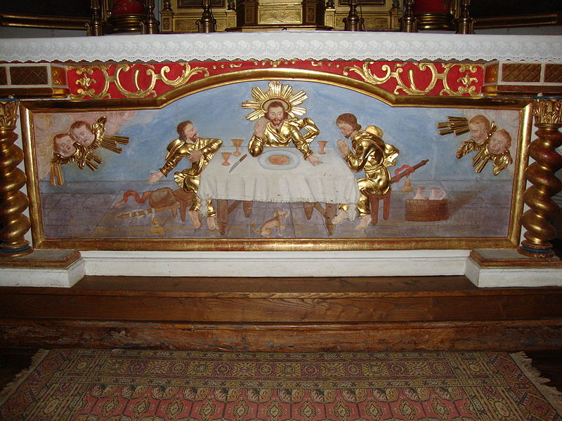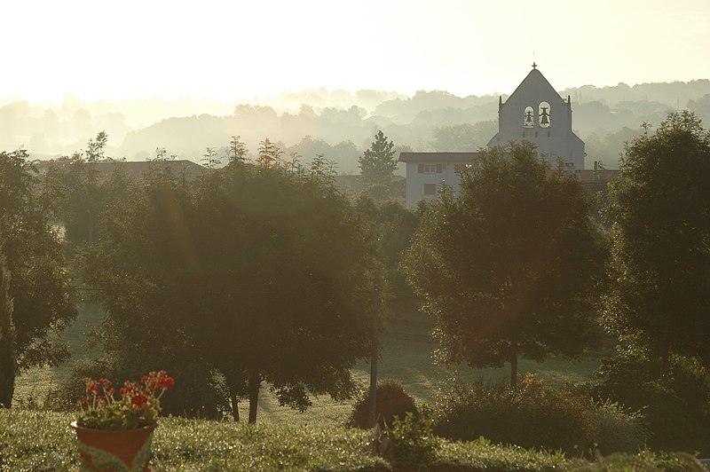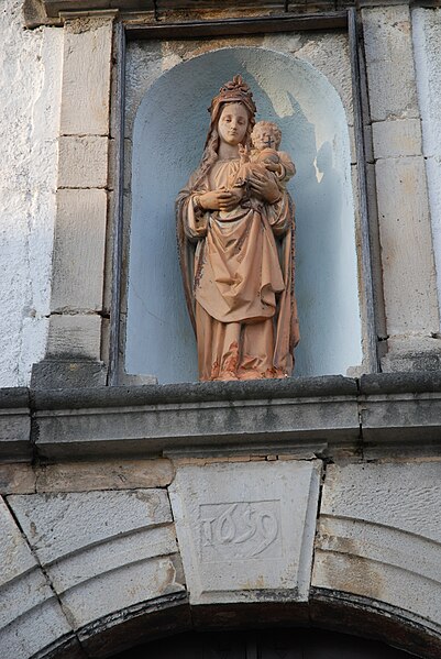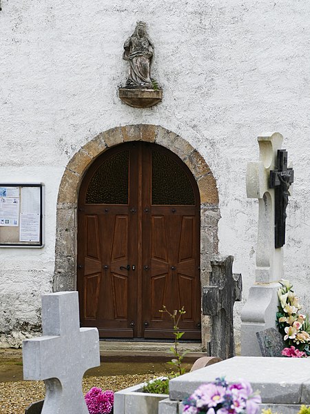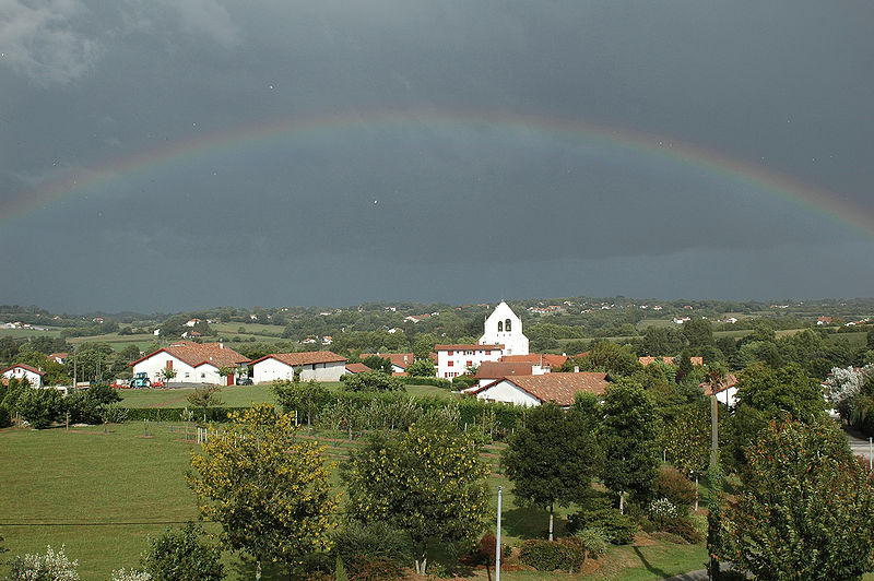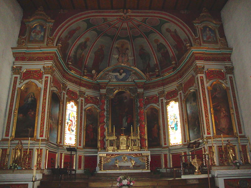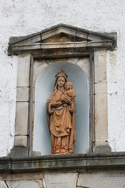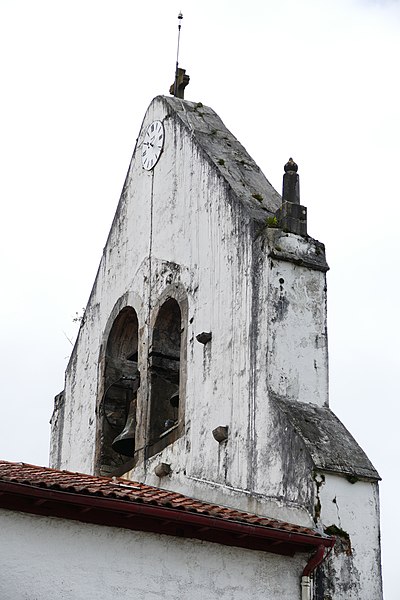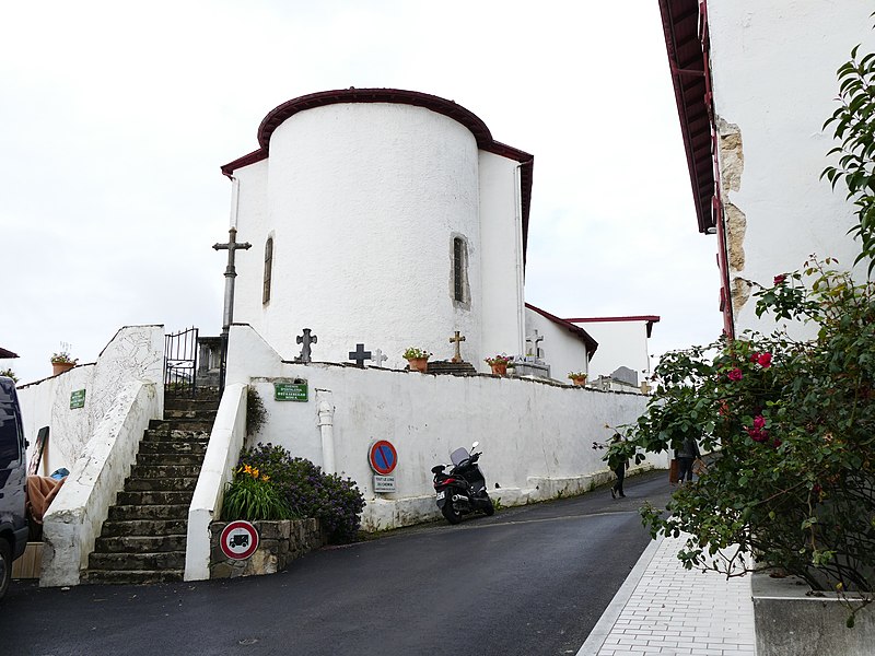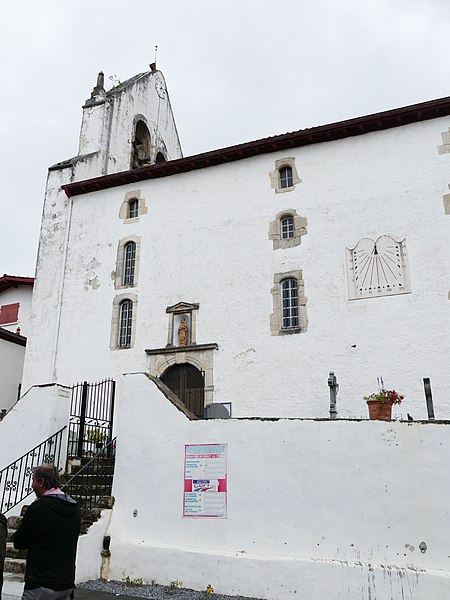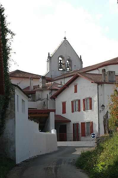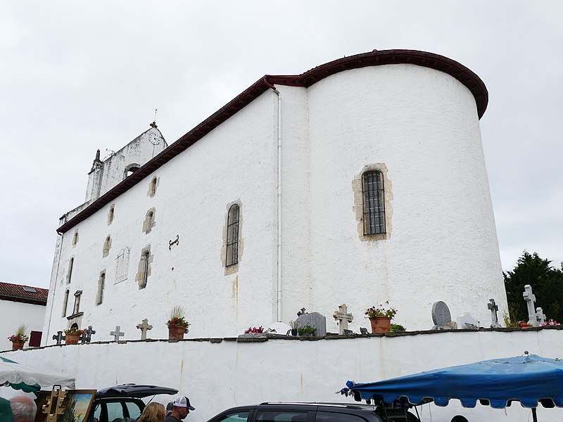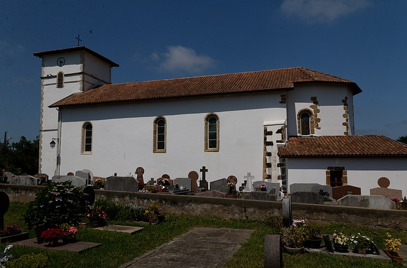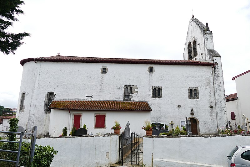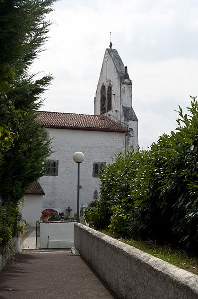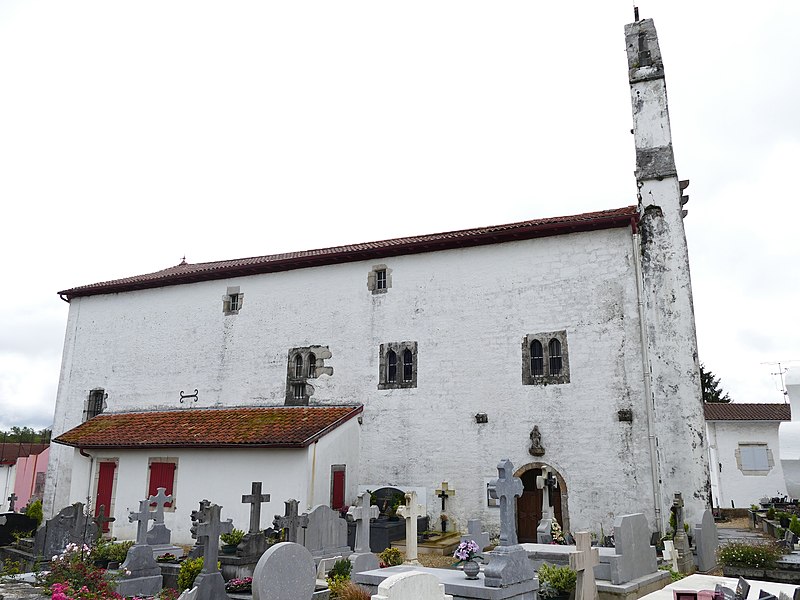 L'église Saint‑Martin d'Ahetze, dans les Pyrénées‑Atlantiques, est dédiée à saint Martin et la paroisse y est mentionnée dès 1083. Sa construction remonte en partie au XVIe siècle et l'édifice est inscrit aux monuments historiques depuis 1973. Située sur la route de Saint‑Jacques‑de‑Compostelle, l'église présente une nef unique prolongée vers l'est par une abside circulaire et flanquée au nord d'une sacristie très étroite. À l'extérieur, les portes se logent sous un arc plein‑cintre dont la clé porte la date de 1659 ; cet arc s'appuie sur des piédroits formant pilastres qui se prolongent au‑delà du claveau central pour venir buter sur une corniche saillante. Au‑dessus de l'arc, une niche abrite une statue de la Vierge surmontée d'un petit fronton triangulaire, et la façade ouest est constituée par un clocher‑mur. L'intérieur est rythmé par trois étages de tribunes à balustres qui entourent la nef et reposent sur des poutres aux extrémités sculptées ; ces tribunes soutiennent une tablette ornée de denticules. Le chœur, légèrement surélevé, est entièrement occupé par un retable. Le mobilier comporte notamment une statue en bois de saint Jacques en tenue de pèlerin et une Vierge de l'Assomption, toutes deux datées du XVIIIe siècle, ainsi qu'un retable du XVIIIe siècle et une croix de procession du XVe siècle dont les bras sont garnis de clochettes ; cette croix fut dénoncée en 1609 par le conseiller de Lancre comme objet diabolique. Aux abords de l'église se trouve l'ostaleria qui recevait les pèlerins, et le cimetière conserve une stèle discoïdale ancienne, tandis qu'une autre stèle d'Ahetze est exposée au Musée basque et de l'histoire de Bayonne. Le décor de l'édifice comprend des éléments visibles du mobilier et du vitrail, tels que l'Annonciation du retable et un vitrail Notre‑Dame du Scapulaire.