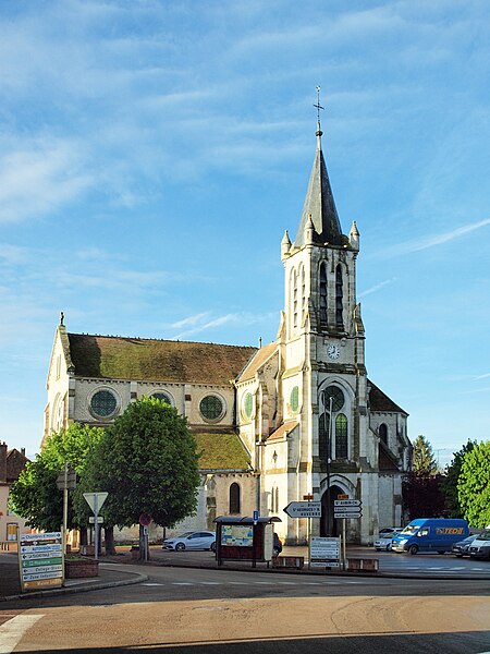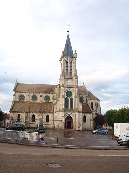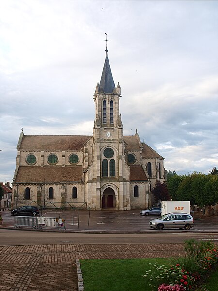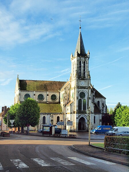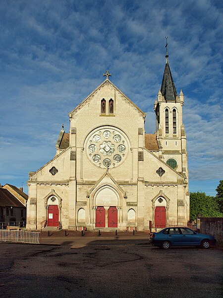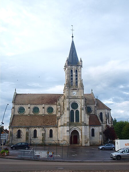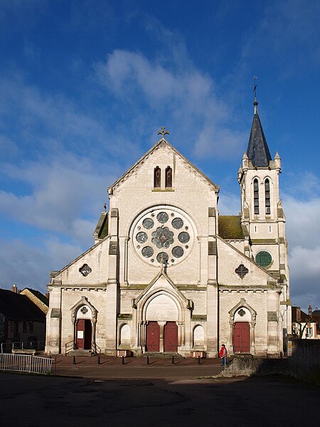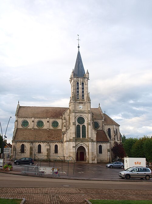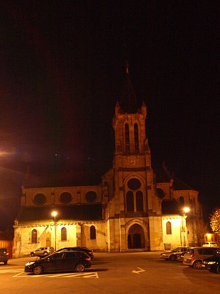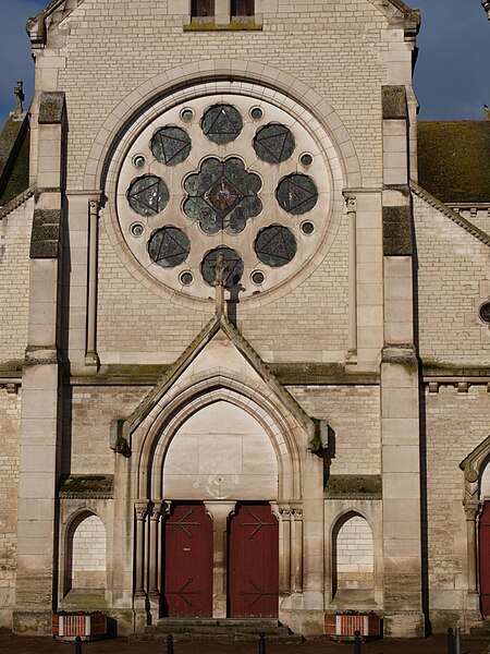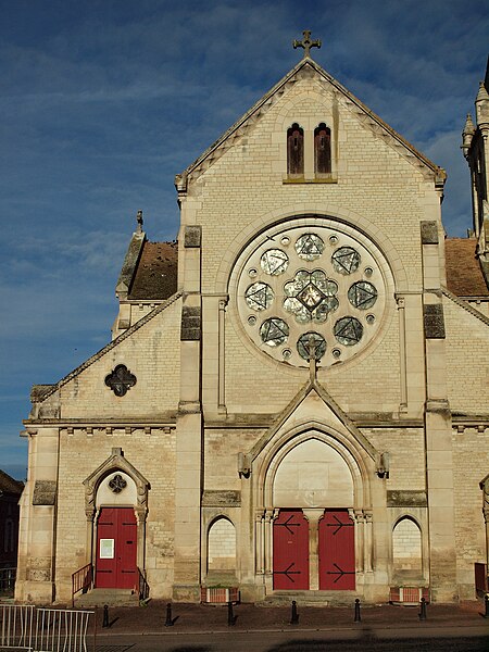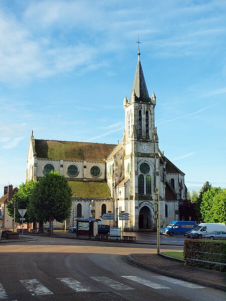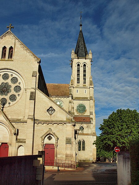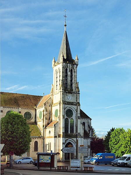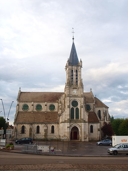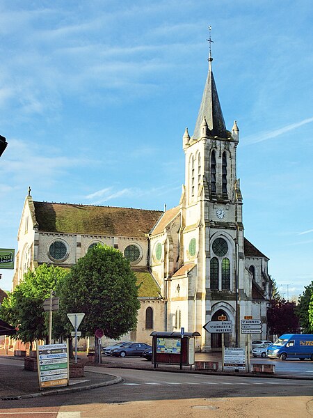 Construite d'après les plans de Viollet-le-Duc, l'église présente une originalité d'adaptation à la place : le chœur est orienté à l'ouest et l'édifice privilégie la largeur sur la longueur, tandis que le clocher-porche est déporté sur le côté droit, en vis-à-vis de l'hôtel de ville. La nef courte comprend trois vaisseaux voûtés d'ogives, bordés de bas-côtés voûtés d'arêtes ; le transept est non saillant, le bras sud s'ouvrant sur la sacristie et le bras nord étant associé à une haute tour-porche. Le chœur est pentagonal et précédé d'une partie droite flanquée de chapelles quadrangulaires. L'élévation de la nef se déploie sur trois niveaux : grandes arcades en arcs brisés, étage médian percé de baies géminées en plein cintre et fenêtres hautes en formes de roses. Le chevet, plus simple, présente un double rang de baies en arcs brisés et une hauteur sous voûtes moindre que celle de la nef. Les piles composées desservent la nef, la partie droite du chœur et la croisée du transept ; les grandes arcades de la nef et l'arc-doubleau des bas-côtés s'appuient sur des pilastres chanfreinés. Selon le plan cruciforme, des colonnes engagées sont cantonnées du côté du haut vaisseau et du transept ; l'abside comporte deux rangs de baies sur pans droits, apportant une lumière abondante. Le dallage est en pierre d'Anstrude.