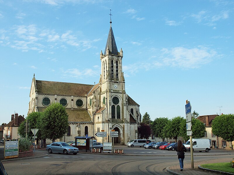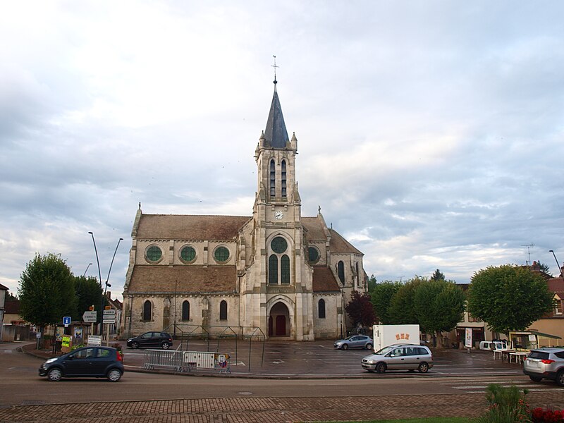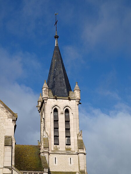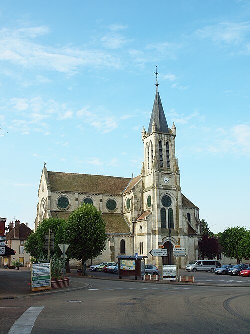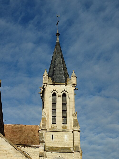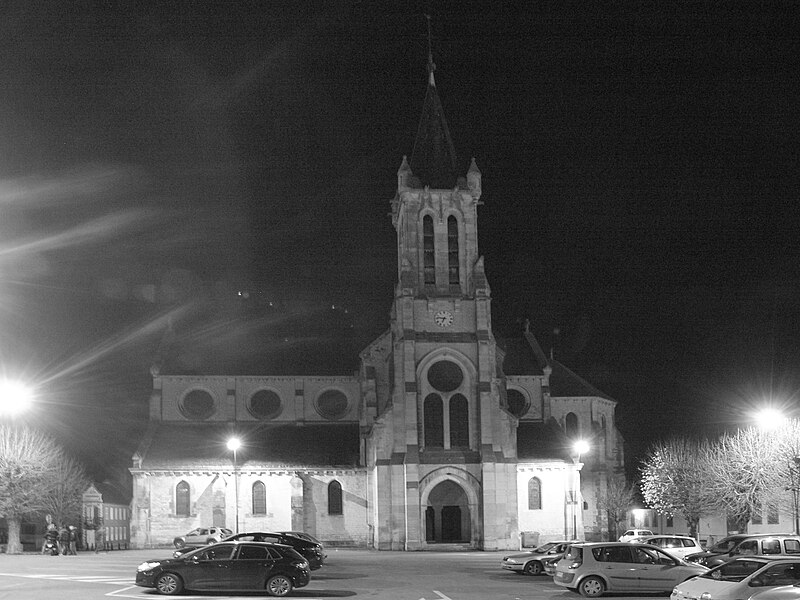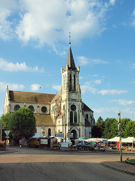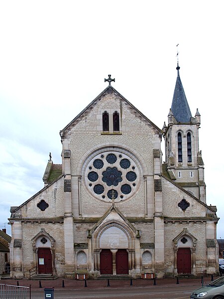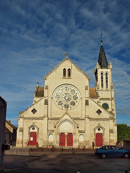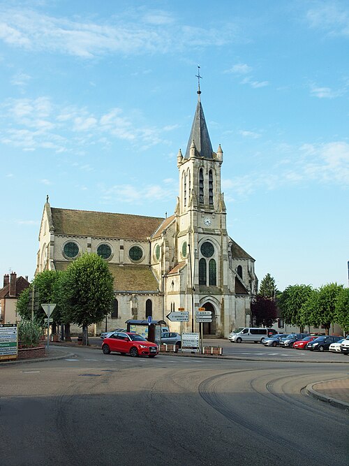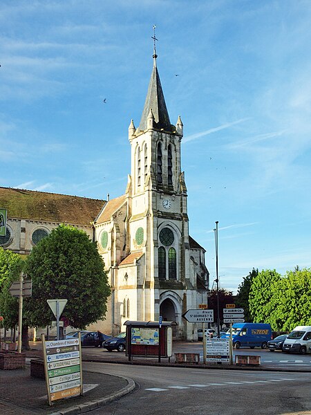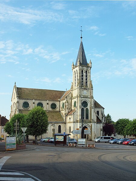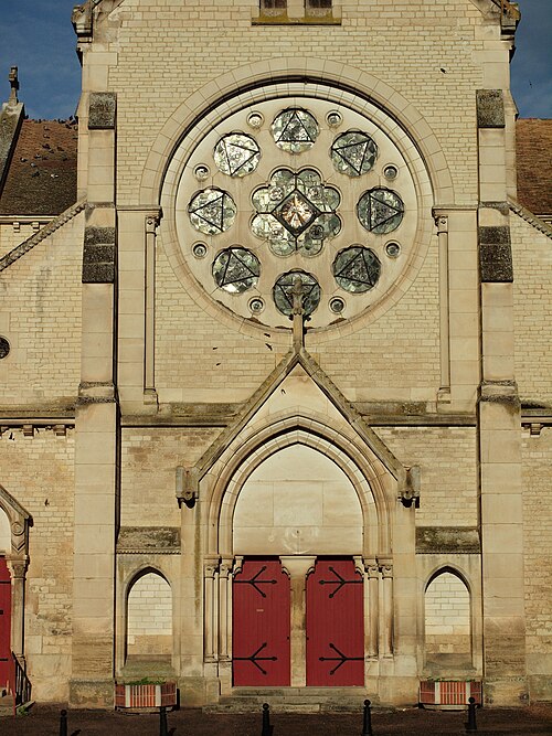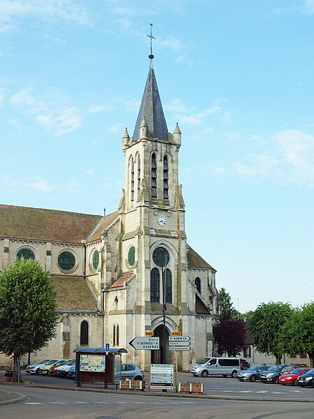 Construite d'après les plans de Viollet-le-Duc, l'église présente une originalité d'adaptation à la place : le chœur est orienté à l'ouest et l'édifice privilégie la largeur sur la longueur, tandis que le clocher-porche est déporté sur le côté droit, en vis-à-vis de l'hôtel de ville. La nef courte comprend trois vaisseaux voûtés d'ogives, bordés de bas-côtés voûtés d'arêtes ; le transept est non saillant, le bras sud s'ouvrant sur la sacristie et le bras nord étant associé à une haute tour-porche. Le chœur est pentagonal et précédé d'une partie droite flanquée de chapelles quadrangulaires. L'élévation de la nef se déploie sur trois niveaux : grandes arcades en arcs brisés, étage médian percé de baies géminées en plein cintre et fenêtres hautes en formes de roses. Le chevet, plus simple, présente un double rang de baies en arcs brisés et une hauteur sous voûtes moindre que celle de la nef. Les piles composées desservent la nef, la partie droite du chœur et la croisée du transept ; les grandes arcades de la nef et l'arc-doubleau des bas-côtés s'appuient sur des pilastres chanfreinés. Selon le plan cruciforme, des colonnes engagées sont cantonnées du côté du haut vaisseau et du transept ; l'abside comporte deux rangs de baies sur pans droits, apportant une lumière abondante. Le dallage est en pierre d'Anstrude.