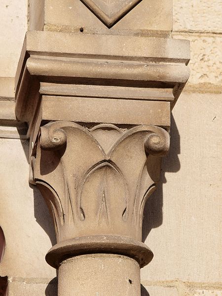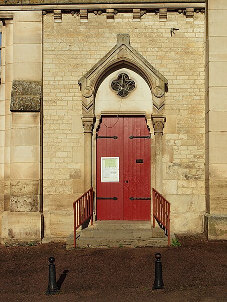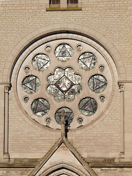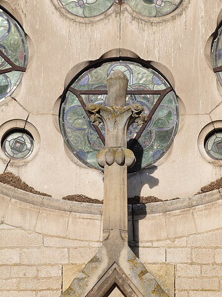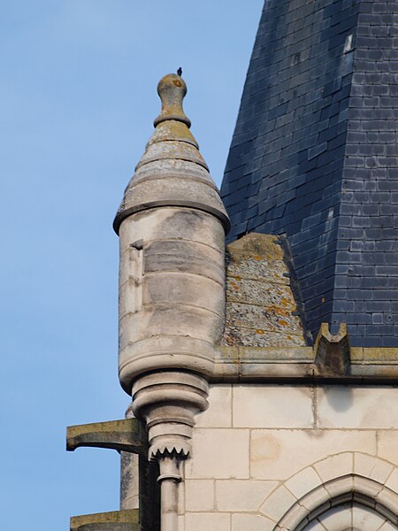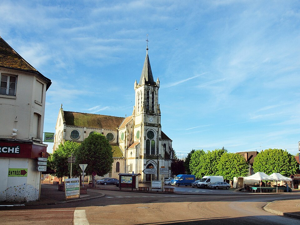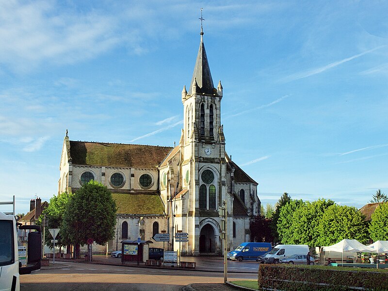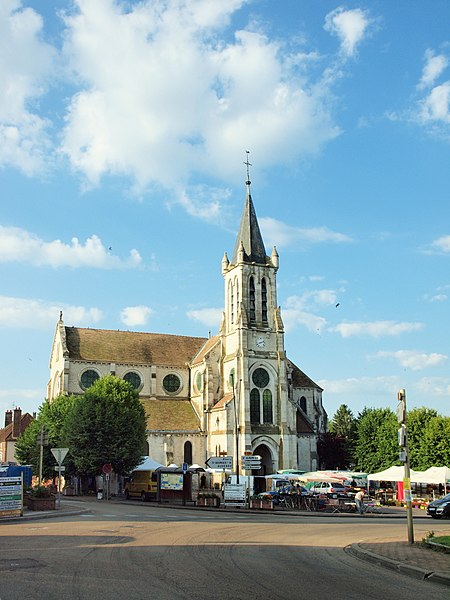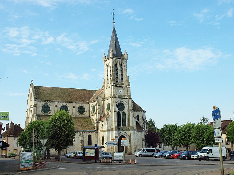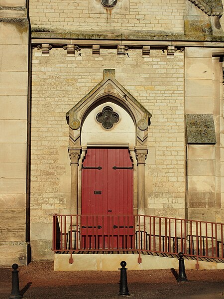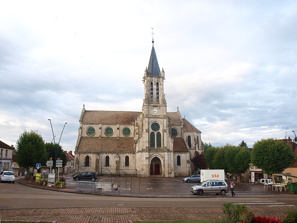 Construite d'après les plans de Viollet-le-Duc, l'église présente une originalité d'adaptation à la place : le chœur est orienté à l'ouest et l'édifice privilégie la largeur sur la longueur, tandis que le clocher-porche est déporté sur le côté droit, en vis-à-vis de l'hôtel de ville. La nef courte comprend trois vaisseaux voûtés d'ogives, bordés de bas-côtés voûtés d'arêtes ; le transept est non saillant, le bras sud s'ouvrant sur la sacristie et le bras nord étant associé à une haute tour-porche. Le chœur est pentagonal et précédé d'une partie droite flanquée de chapelles quadrangulaires. L'élévation de la nef se déploie sur trois niveaux : grandes arcades en arcs brisés, étage médian percé de baies géminées en plein cintre et fenêtres hautes en formes de roses. Le chevet, plus simple, présente un double rang de baies en arcs brisés et une hauteur sous voûtes moindre que celle de la nef. Les piles composées desservent la nef, la partie droite du chœur et la croisée du transept ; les grandes arcades de la nef et l'arc-doubleau des bas-côtés s'appuient sur des pilastres chanfreinés. Selon le plan cruciforme, des colonnes engagées sont cantonnées du côté du haut vaisseau et du transept ; l'abside comporte deux rangs de baies sur pans droits, apportant une lumière abondante. Le dallage est en pierre d'Anstrude.