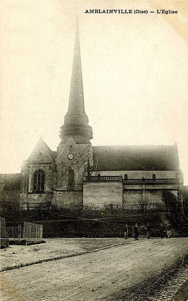 La présence d'un culte ancien à Amblainville est attestée par la découverte, en 1835, d'une nécropole mérovingienne et par la première mention écrite de l'église en 1104, lorsqu'Ade de Moussy la donne à l'abbaye Saint‑Martin de Pontoise. La nef paraît très ancienne — probablement de la fin de l'époque romane — comme l'évoquent des pastoureaux réemployés et des appareillages en opus spicatum observables autour du portail et sur les murs latéraux. Au début du XIIIe siècle furent édifiés le chœur et le transept, qui conservent un caractère gothique homogène et des voûtes d'origine. Une campagne importante aux alentours du début du XVIe siècle a marqué l'édifice : la charpente lambrissée en carène renversée porte une date gravée de 1505 et la grande baie occidentale lui est probablement contemporaine. La même période a vu l'édification d'éléments de transition entre gothique et Renaissance ; la tour polygonale et le portail à décor de pampres et de niches relèvent de la Renaissance, tandis que des aménagements flamboyants subsistent dans les moulures. Deux chapelles latérales furent ajoutées au transept à la fin du XVIe siècle, une inscription mentionnant 1586, et des décors sculptés et des clefs pendantes témoignent de leur qualité. La cloche dite « Marie Anne » porte la date de 1679. Au XIXe siècle, l'abbé Eugène Barret engage une importante campagne de travaux et de décors : il répare la structure, refait des voûtes et transforme fortement l'intérieur en y installant un décor néo‑gothique en stuc et terre cuite, des arcatures plaquées, un chemin de croix en bas‑relief, une chaire et un confessionnal en forme d'édicules, ainsi qu'une grotte de Lourdes ; une donatrice notable aide au financement. Ces aménagements, menés entre les années 1876 et 1893, ont profondément modifié l'aspect intérieur et suscitent des critiques sur leur caractère anachronique. L'église a été classée au titre des monuments historiques en 1982, le décor néo‑gothique de la nef étant inscrit au titre des objets en 1991, et une Pietà a été classée en 2004. À partir de 2000 des travaux extérieurs sont entrepris : la flèche du clocher est restaurée, la grotte de Lourdes remise en état, et en 2005 la toiture unique couvrant nef et bas‑côtés est posée, accompagnée d'un ravalement des murs gouttereaux ; ces opérations ont entraîné la disparition extérieure des baies hautes de la nef. Les interventions menées entre 2005 et 2010 se sont concentrées sur les toitures, la façade occidentale, les élévations extérieures des bas‑côtés et la grotte, sans qu'une restauration intérieure d'ensemble n'ait encore été réalisée. La paroisse dépend aujourd'hui de la communauté paroissiale de Saint‑Martin de Méru‑lès‑Sablons et l'église accueille des messes dominicales anticipées une fois par trimestre.
