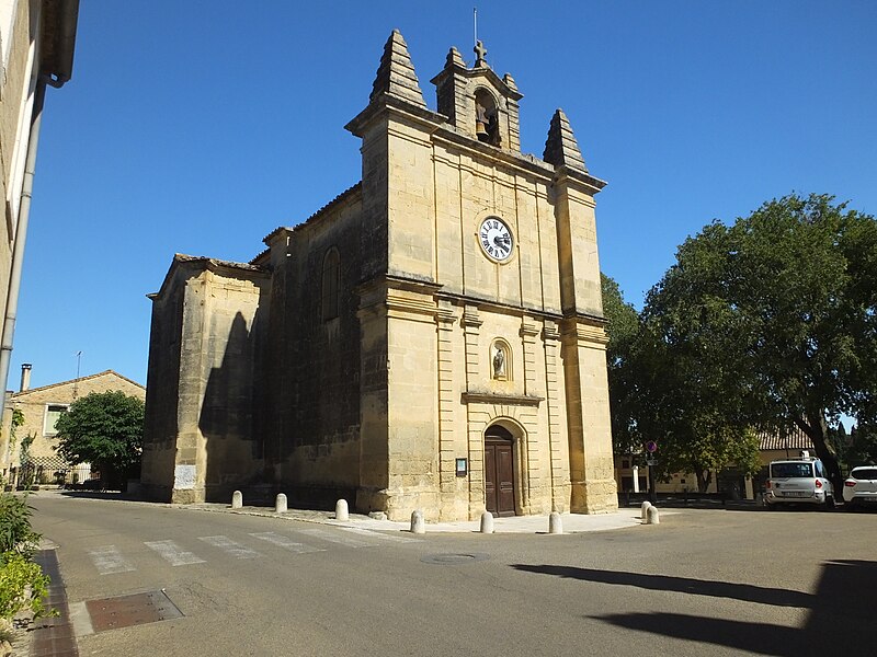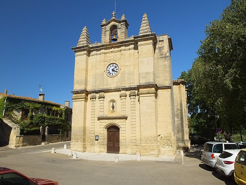 L'édifice est construit en pierres de taille tendre provenant d'Aujargues ou de Pondres, et sa façade, de composition classique, affiche pilastres, bandeaux et une modénature soignée. La toiture de tuiles rondes ne repose pas sur une charpente mais sur les voûtes, disposition fréquente dans la région qui évoque, selon les observateurs, certaines églises de missions en Amérique latine. La nef, large de 6 m pour une longueur totale de 18 m chœur compris, est couverte de voûtes quadripartites retombant sur des pilastres à ressauts, reliés par une corniche moulurée qui parcourt la nef et le chœur. Le chœur, formé d'un petit transept et d'un chevet à pans coupés, est couvert par une voûte subdivisée en six voûtains par des liernes dans l'axe, tandis que l'abside est couverte par trois voûtains correspondant à ses pans. Une tribune de bois à deux étages occupe le fond de la nef et est éclairée par une petite rosace ornée d'un vitrail figurant une fleur de lys. Les baies sont de taille réduite, en arc plein cintre, et abritent des vitraux du XIXe siècle offerts par des paroissiens.