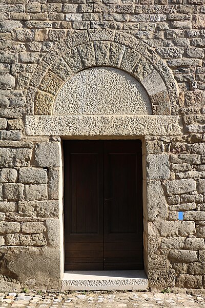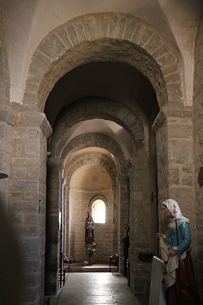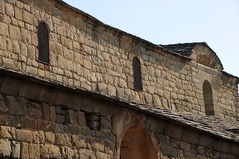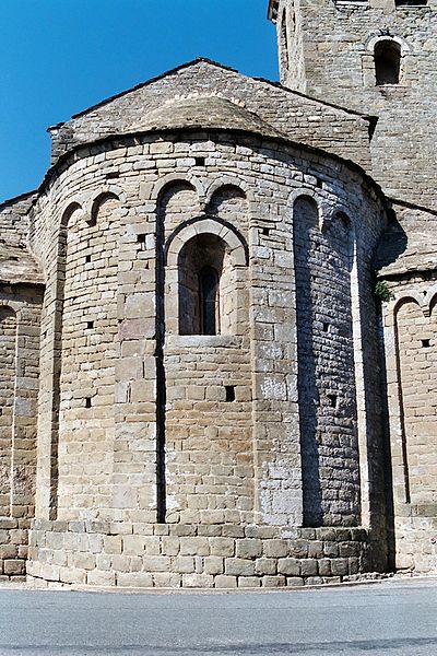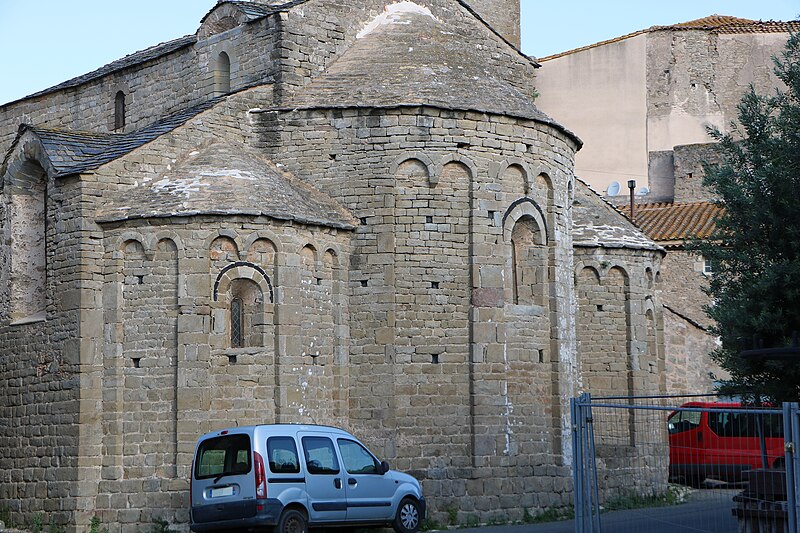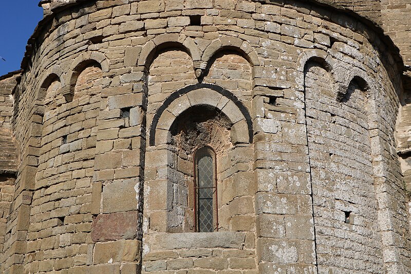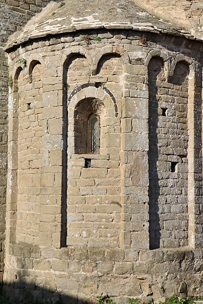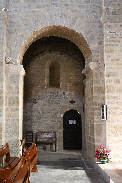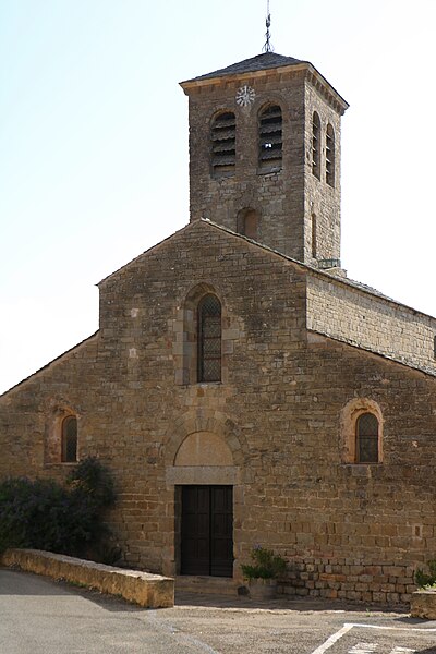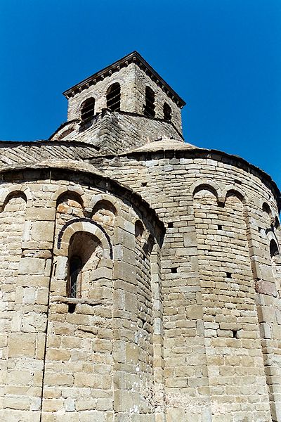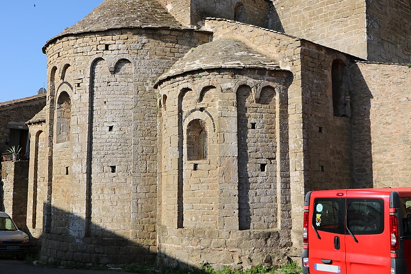 L'église Saint-Martin est une église romane du XIIe siècle située à Escales, dans le nord du massif des Corbières (Aude, Occitanie). Elle est classée au titre des monuments historiques depuis le 13 juin 1913. L'édifice, construit en grès, présente un plan à trois nefs et trois absides, sans transept ; la nef et les bas-côtés sont voûtés d'arête. Le clocher s'élève sur une travée du bas-côté nord ; son couronnement est moderne. Le chevet constitue un chevet roman lombard à triple abside : absides et absidioles, couvertes d'ardoises, sont décorées de bandes lombardes formées de lésènes et d'arcatures. Les baies des absides et celles du dernier niveau du clocher sont bordées, au niveau des archivoltes, d'un filet en pierres noires, et les fenêtres du chevet montrent un simple ébrasement souligné à l'extrados par un cordon de basalte noir. La maçonnerie du chevet porte de nombreux trous de boulin issus des échafaudages. Les parements des absides sont rythmés de fausses arcatures et de bandes faisant office de contreforts peu saillants, entre lesquels sont intercalés des corbelets à tête grossière. La façade ouest, sobre, s'ouvre sur une porte à deux rouleaux d'archivoltes dont le seuil est formé d'une face de sarcophage antique en marbre blanc ornée de strigilles ; au-dessus se trouve une haute baie cintrée à simple ébrasement, encadrée de baies plus petites. Le clocher roman est percé, au dernier niveau, de baies géminées et reçoit une corniche saillante portée par des modillons. L'édifice combine ainsi des éléments romans typiques — arcatures lombardes, lésènes, corbelets — et des interventions postérieures visibles au couronnement du clocher.