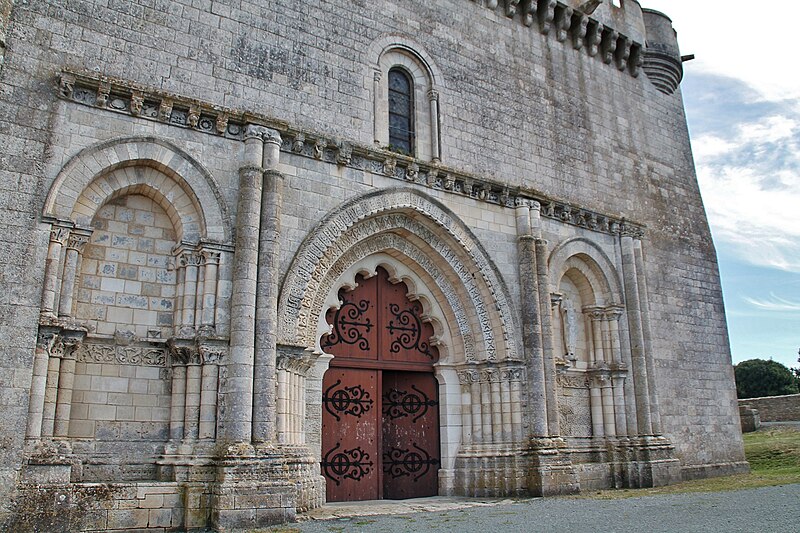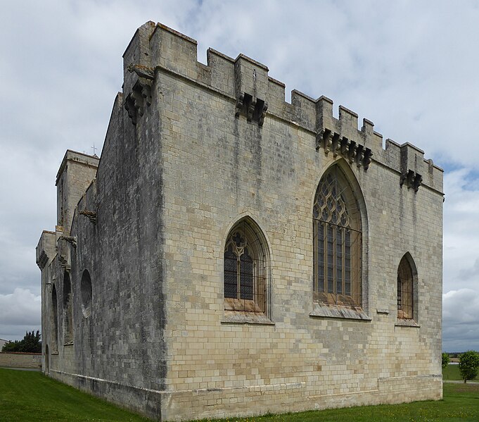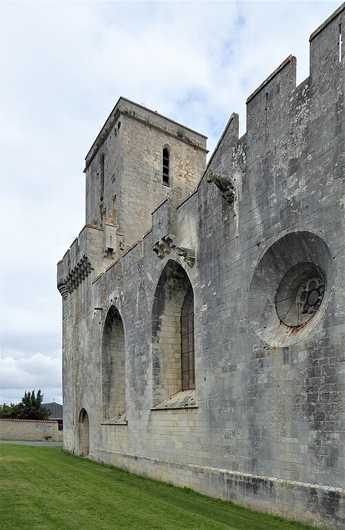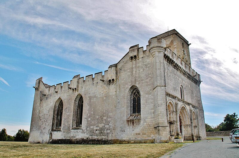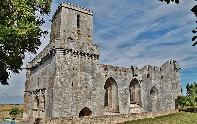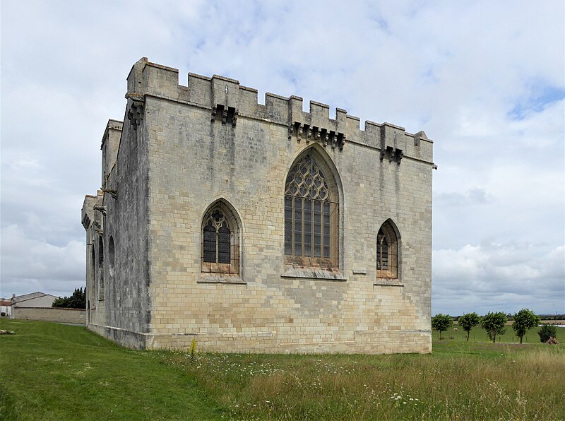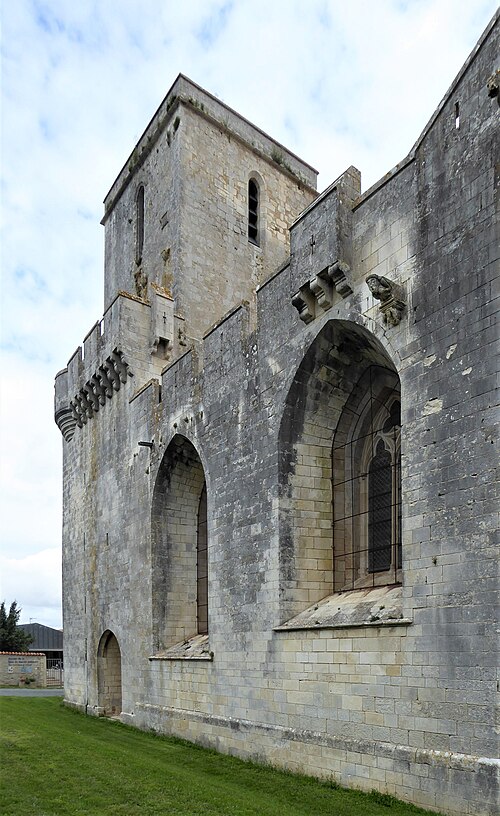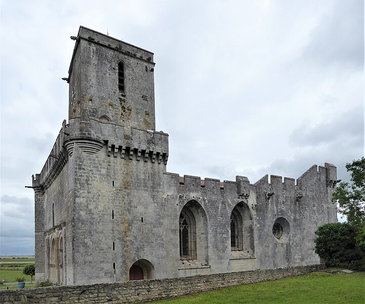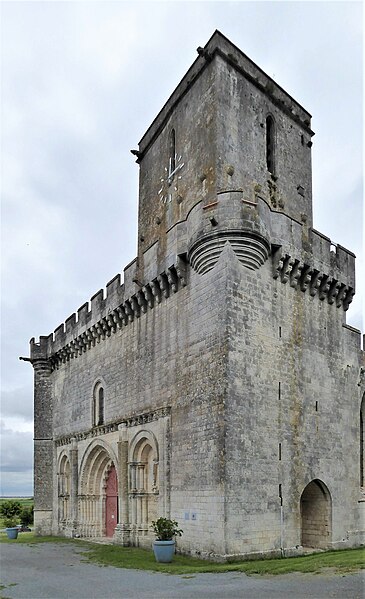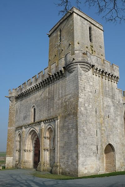 L'église Saint-Martin d'Esnandes, située en Charente-Maritime, est classée monument historique depuis 1840. Son origine est ancienne : une première mention figure dans le cartulaire de l'abbaye Saint-Cyprien de Poitiers et le prieuré dépendait dès 1029 de l'abbaye de Saint-Jean-d'Angély. L'édifice a été édifié aux XIIe et XIIIe siècles ; de l'église romane subsiste notamment la base de la façade et un portail sculpté. Reconstruite au XIVe siècle, l'église reçoit à la fin de ce siècle un dispositif défensif important qui lui confère l'allure d'une forteresse. Pour la protéger on a doublé, parfois triplé, l'épaisseur des murs, obstrué la plupart des baies, ajouté une enveloppe extérieure, creusé un fossé et élevé un chemin de ronde avec créneaux, mâchicoulis et une poterne. Les murs ainsi renforcés atteignent une largeur comprise entre 1,85 et 3 mètres. Sa situation côtière et les épisodes de conflit — descentes de corsaires, guerre de Cent Ans et guerres de Religion — expliquent ces aménagements et les dommages subis au fil du temps. En 1622, considérée comme place forte catholique, l'église fit l'objet d'un ordre de destruction émanant du Conseil de la Ville de La Rochelle, mais la démolition resta partielle. La reconstruction et les campagnes de restauration se déroulent ensuite entre 1629 et 1740 : des dates portées témoignent de travaux sur les piliers du chœur (1629, 1630, 1632), sur le clocher (1633) et sur la façade nord (1740), tandis que le chœur et une partie de la nef furent revoûtés en 1706. Des réparations et projets d'architectes se poursuivent aux XIXe et XIXe–XXe siècles : réparations autorisées en 1820, plans en 1845 par l'architecte Clerget, travaux en 1864 sur les plans de l'architecte départemental Brossard, repavage par les entrepreneurs Denis Graugeaud et Brard, interventions sur le clocher et la façade par l'entrepreneur Jamot en 1867 et 1872, restauration de vitraux en 1873‑1874 par Mongis, puis direction des restaurations dès 1880 par les architectes A. Ballu et Lisch avec les entrepreneurs Eugène Héraud et Joseph Philippon et le sculpteur Eugène Legrain. La couverture de l'église a fait l'objet d'une restauration en 1996. L'édifice présente un caractère gothique sobre et conserve un mobilier classé du XVIIIe siècle, notamment une chaire datée de 1775. Un cartouche indique la reconstruction du clocher en 1633, dont la charpente est réalisée en bois d'épaves. Du chemin de ronde, aménagé au cours des aménagements défensifs, la vue porte sur la baie de l'Aiguillon, le marais et le village environnant, offrant une lecture à la fois historique et paysagère de l'édifice.