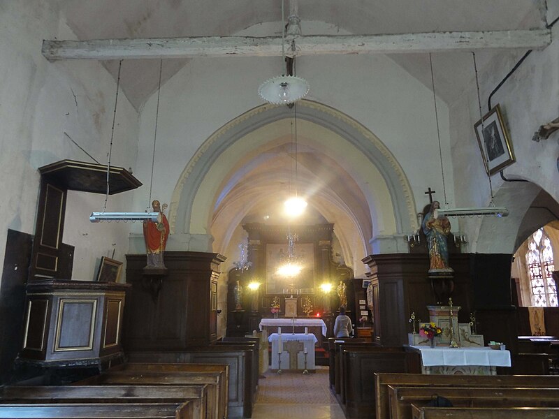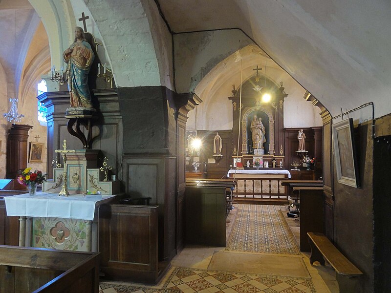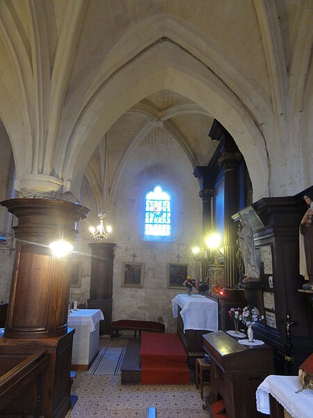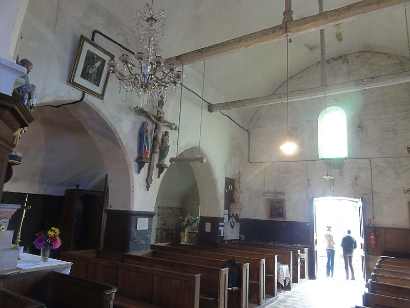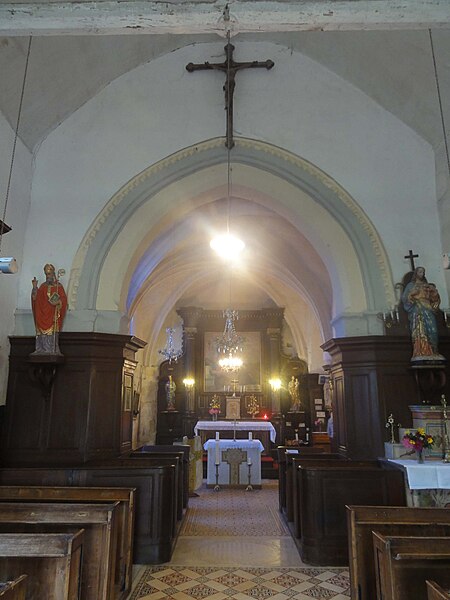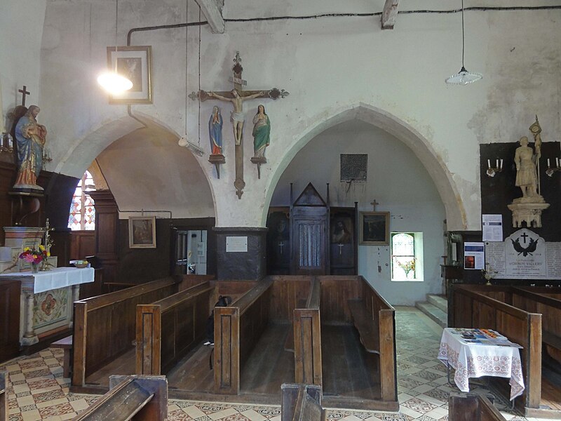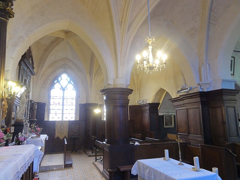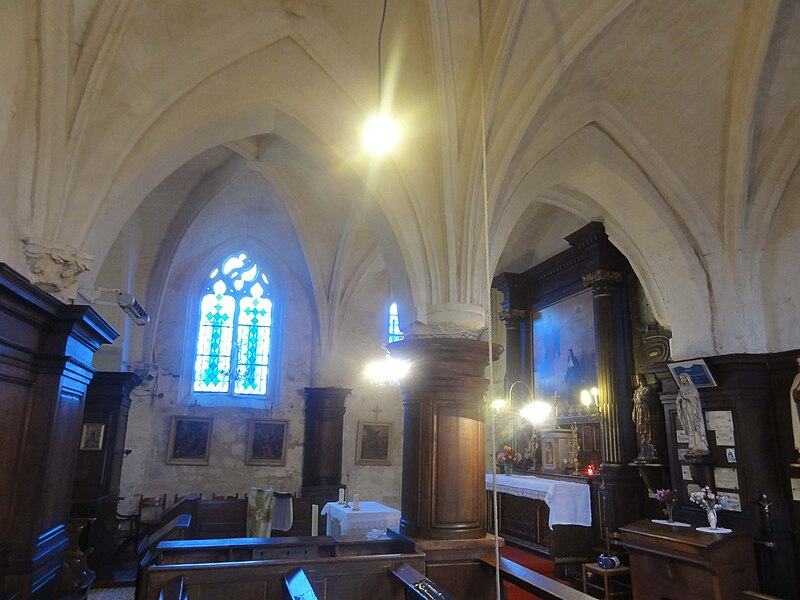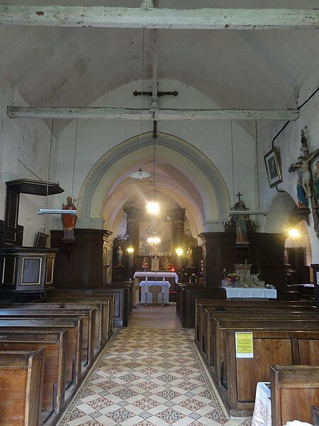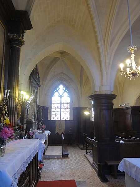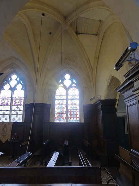 L'intérieur est assez sombre et bas de voûte : la nef est éclairée par une petite baie au sud et une grande fenêtre au nord au remplage flamboyant ; le plafond de la nef est une fausse voûte en berceau lambrissée et plâtrée, la charpente étant à deux entraits. Deux grandes arcades en tiers-point et simplement chanfreinées ouvrent sur le bas-côté et forment un réduit initial qui sert de chapelle des fonts baptismaux ; ces arcades semblent pénétrer un mur préexistant et ont été percées postérieurement. Les voûtes du chœur et du collatéral sont à ogives ; les clefs de voûte portent des décors variés, dont un médaillon floral et un écusson martelé à la Révolution, tandis que le collatéral conserve des clés armoriées et un écusson rare attribué aux compagnons de la reconstruction.