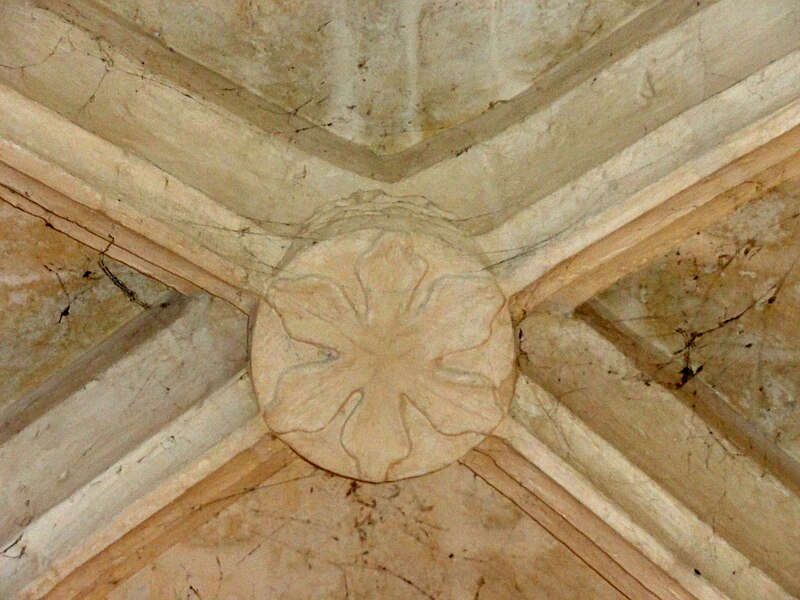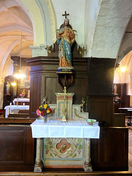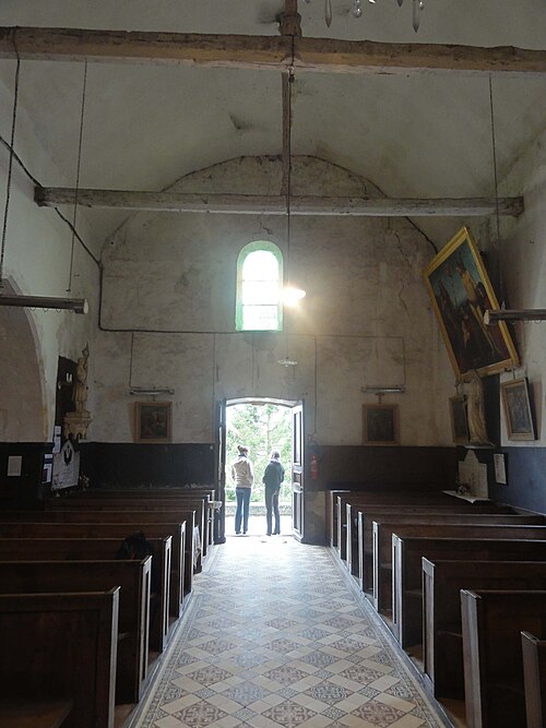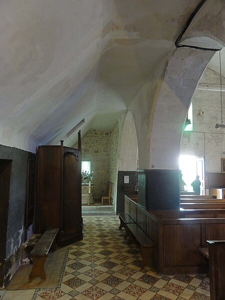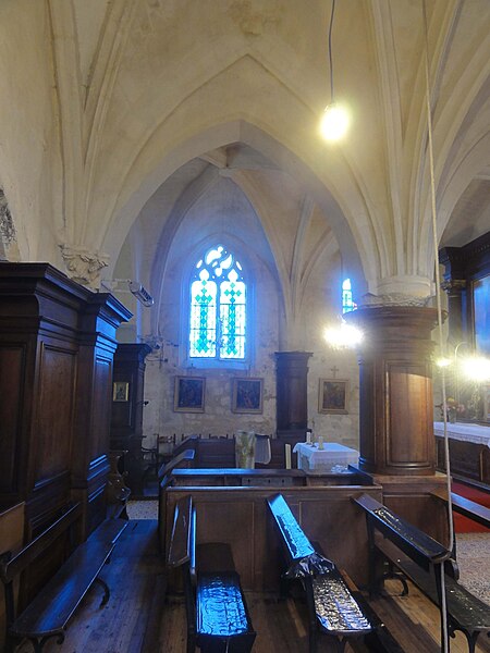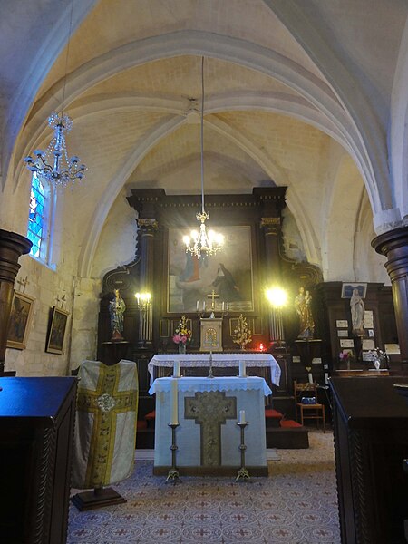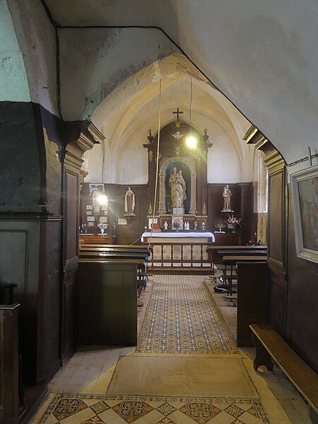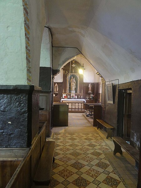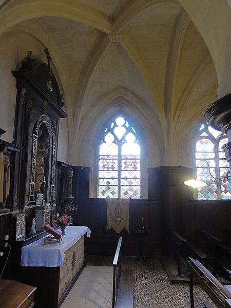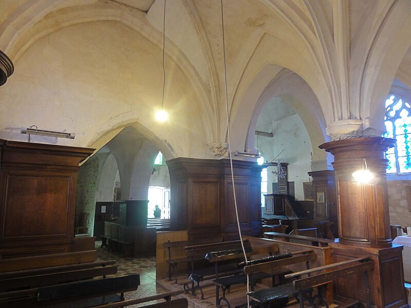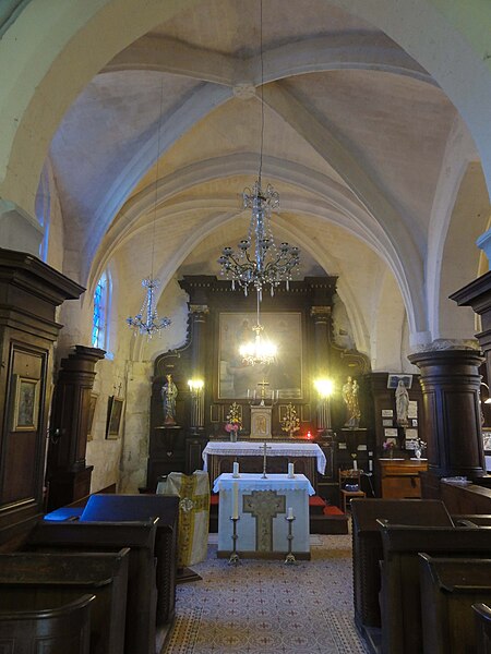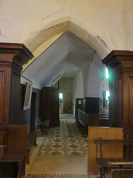 L'intérieur est assez sombre et bas de voûte : la nef est éclairée par une petite baie au sud et une grande fenêtre au nord au remplage flamboyant ; le plafond de la nef est une fausse voûte en berceau lambrissée et plâtrée, la charpente étant à deux entraits. Deux grandes arcades en tiers-point et simplement chanfreinées ouvrent sur le bas-côté et forment un réduit initial qui sert de chapelle des fonts baptismaux ; ces arcades semblent pénétrer un mur préexistant et ont été percées postérieurement. Les voûtes du chœur et du collatéral sont à ogives ; les clefs de voûte portent des décors variés, dont un médaillon floral et un écusson martelé à la Révolution, tandis que le collatéral conserve des clés armoriées et un écusson rare attribué aux compagnons de la reconstruction.