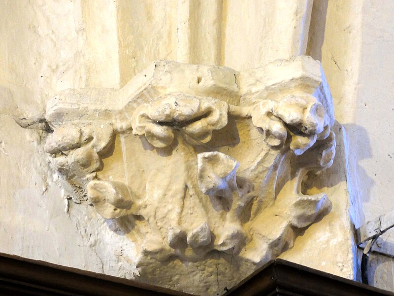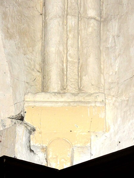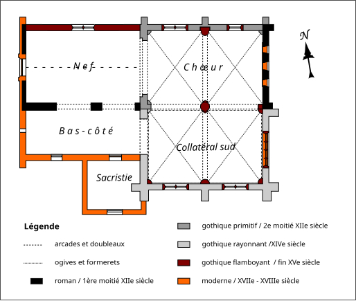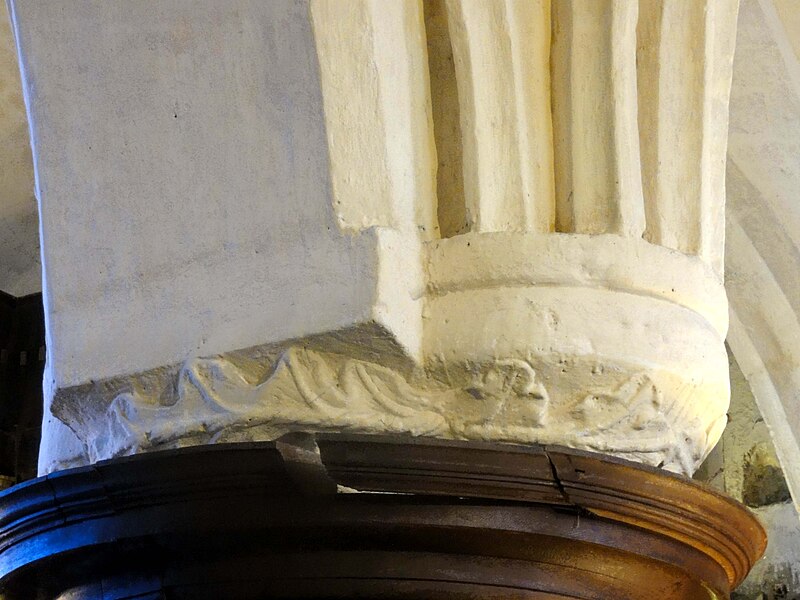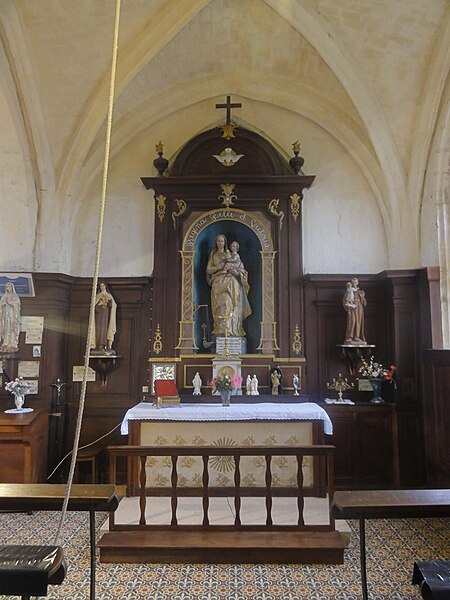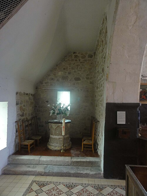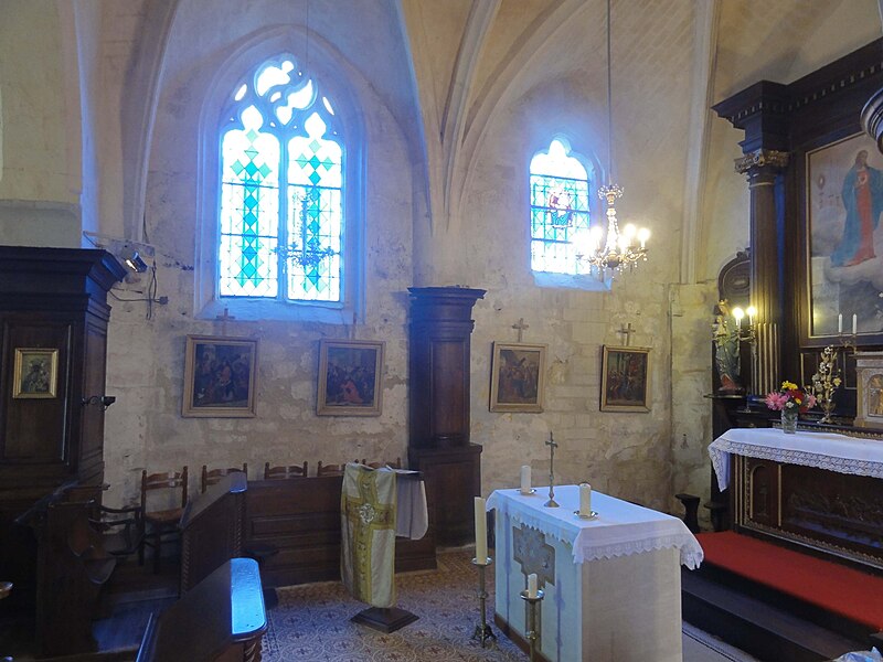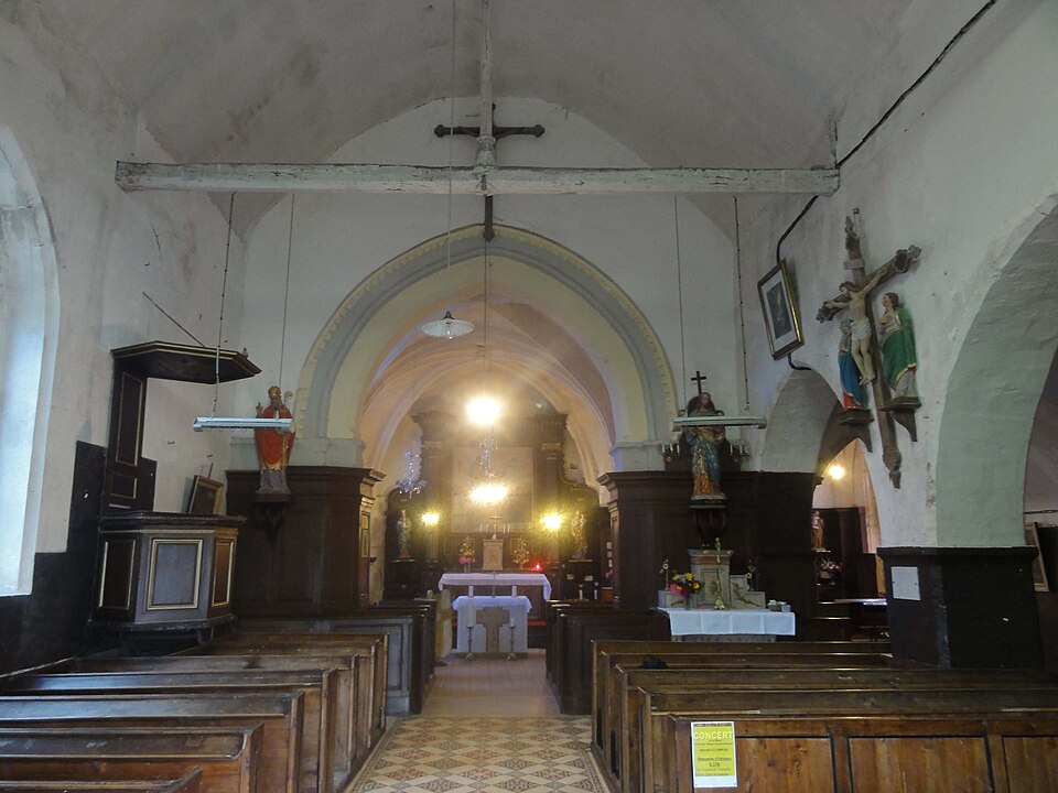 Le chevet roman, comparé à d'autres exemples locaux, conserve son triplet bien que masqué intérieurement ; l'arc triomphal, en tiers-point, associe un rouleau inférieur chanfreiné et un rouleau supérieur mouluré orné d'un cordon de pointes-de-diamant, mais les colonnettes et chapiteaux ont en grande partie disparu. Dans le collatéral on note un cul-de-lampe sculpté de crochets, la présence de formerets qui renvoient au XIVe siècle, ainsi qu'une trappe d'accès aux combles et des orifices pour les cordes de cloche.